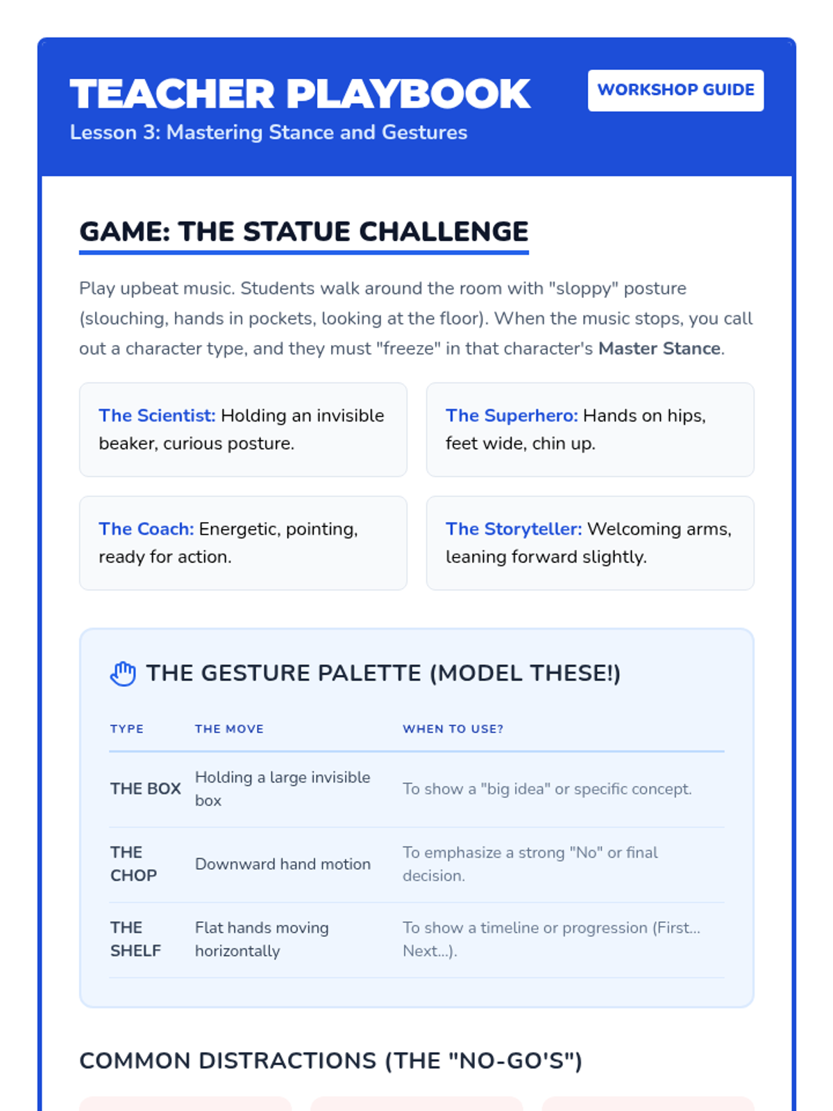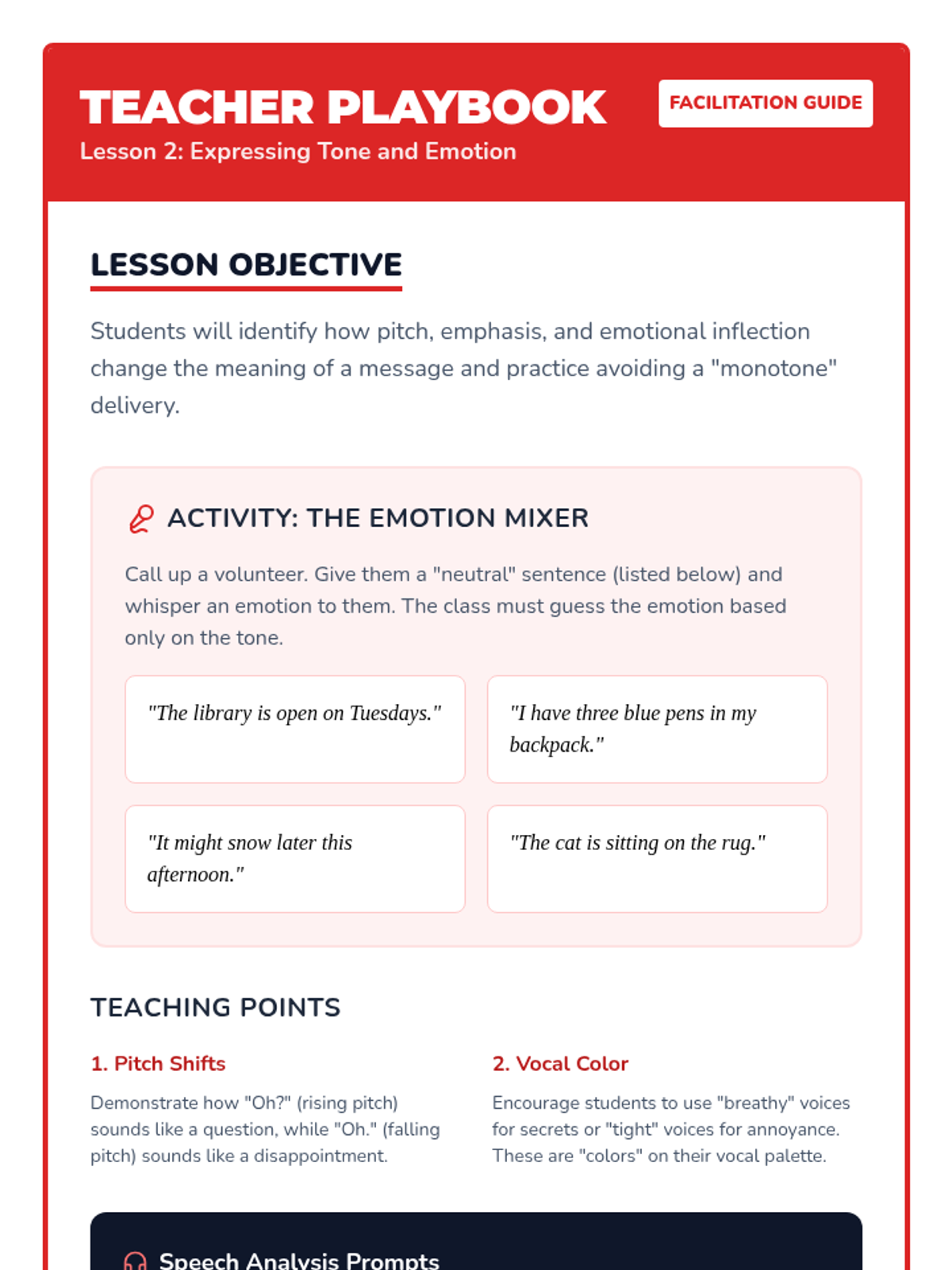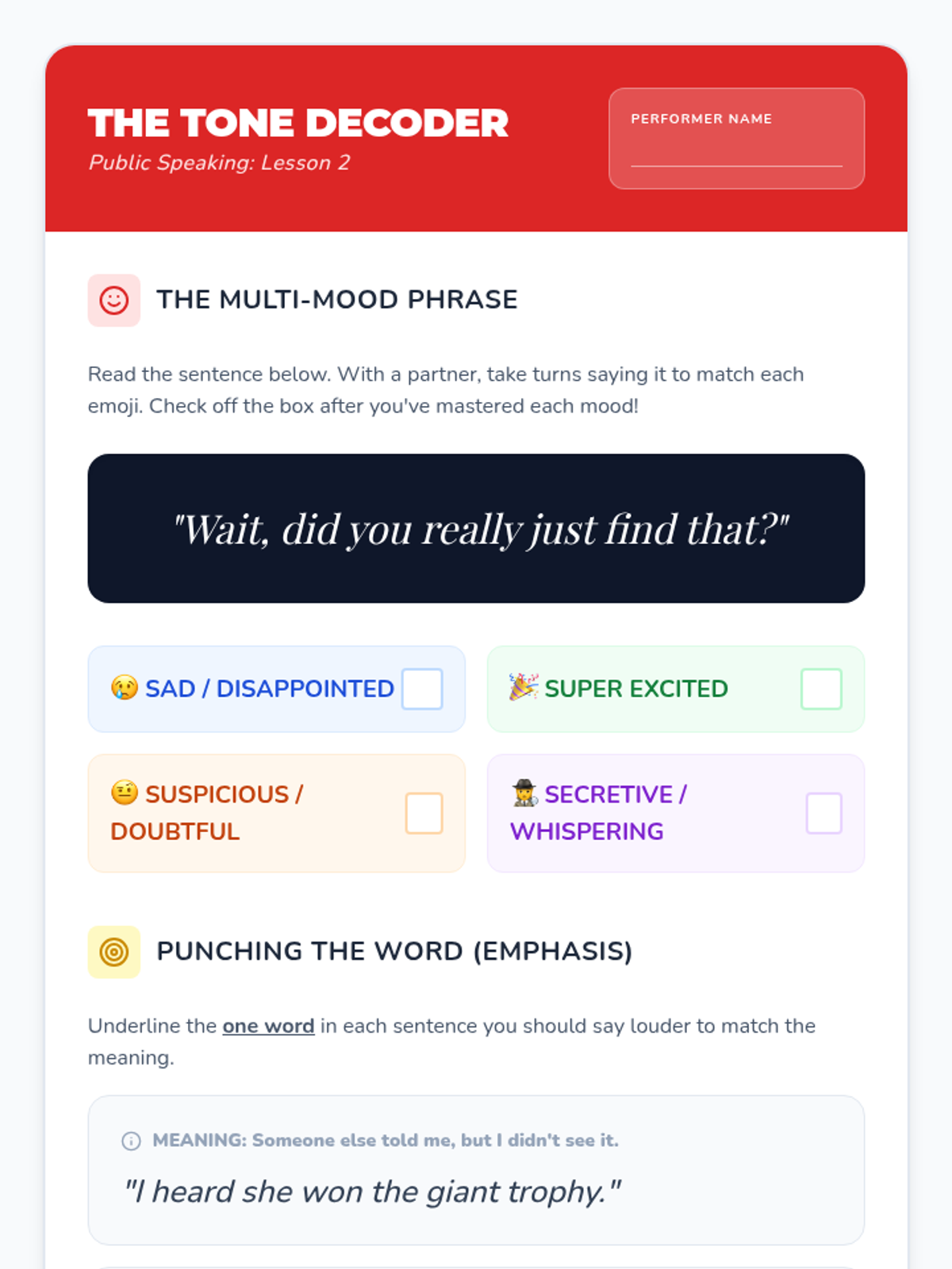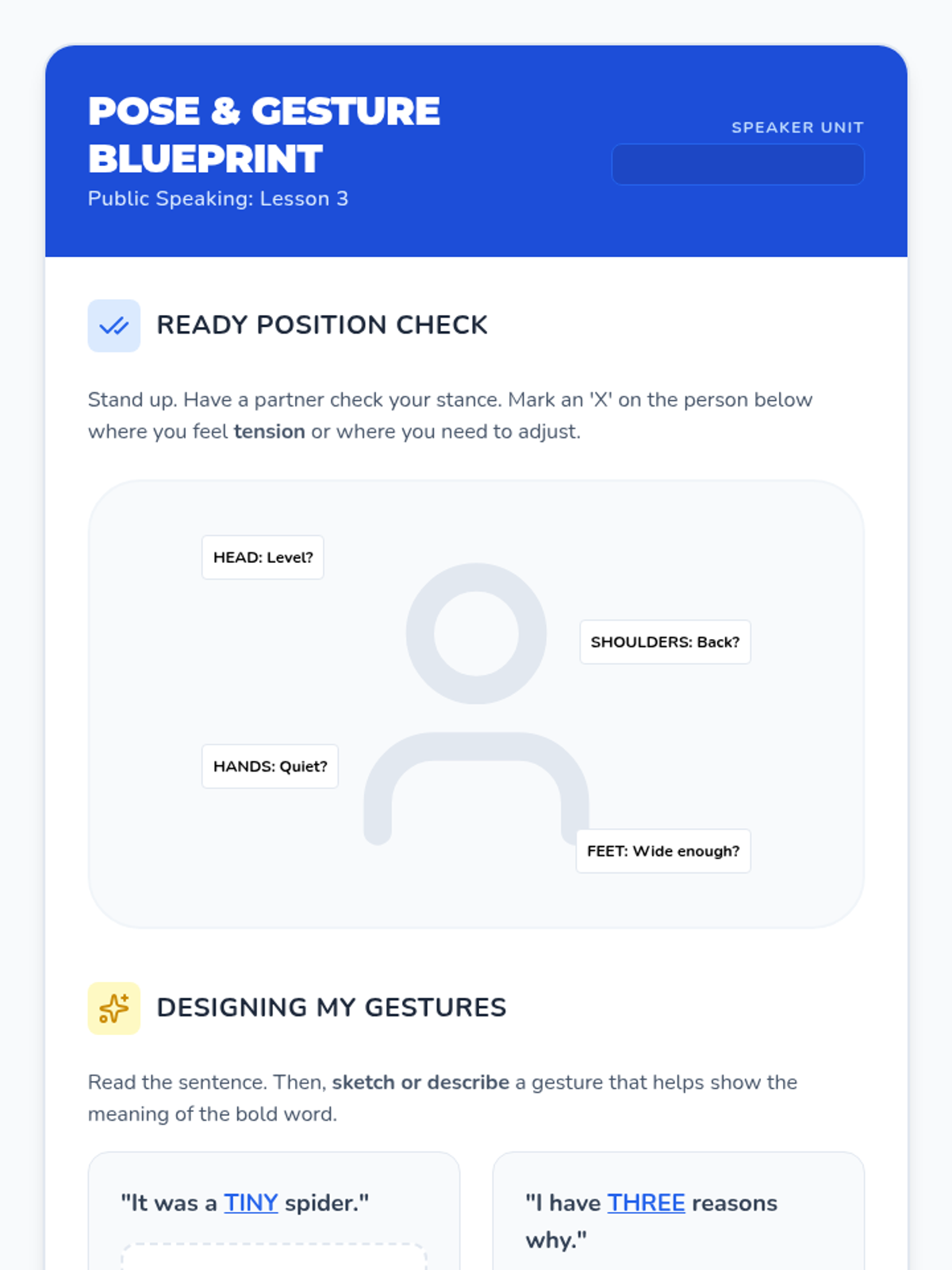 This 4th-grade sequence focuses on the physical and vocal instruments of public speaking. Students master volume, pace, tone, stance, gestures, and eye contact through interactive games and workshops, culminating in a one-minute expert presentation.