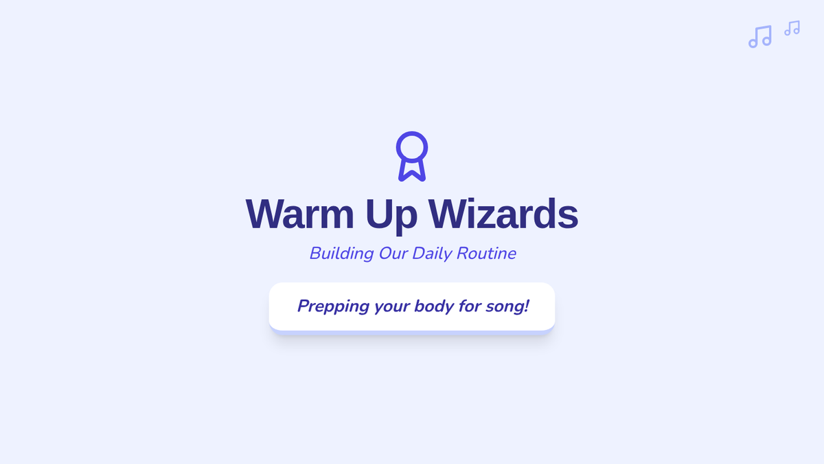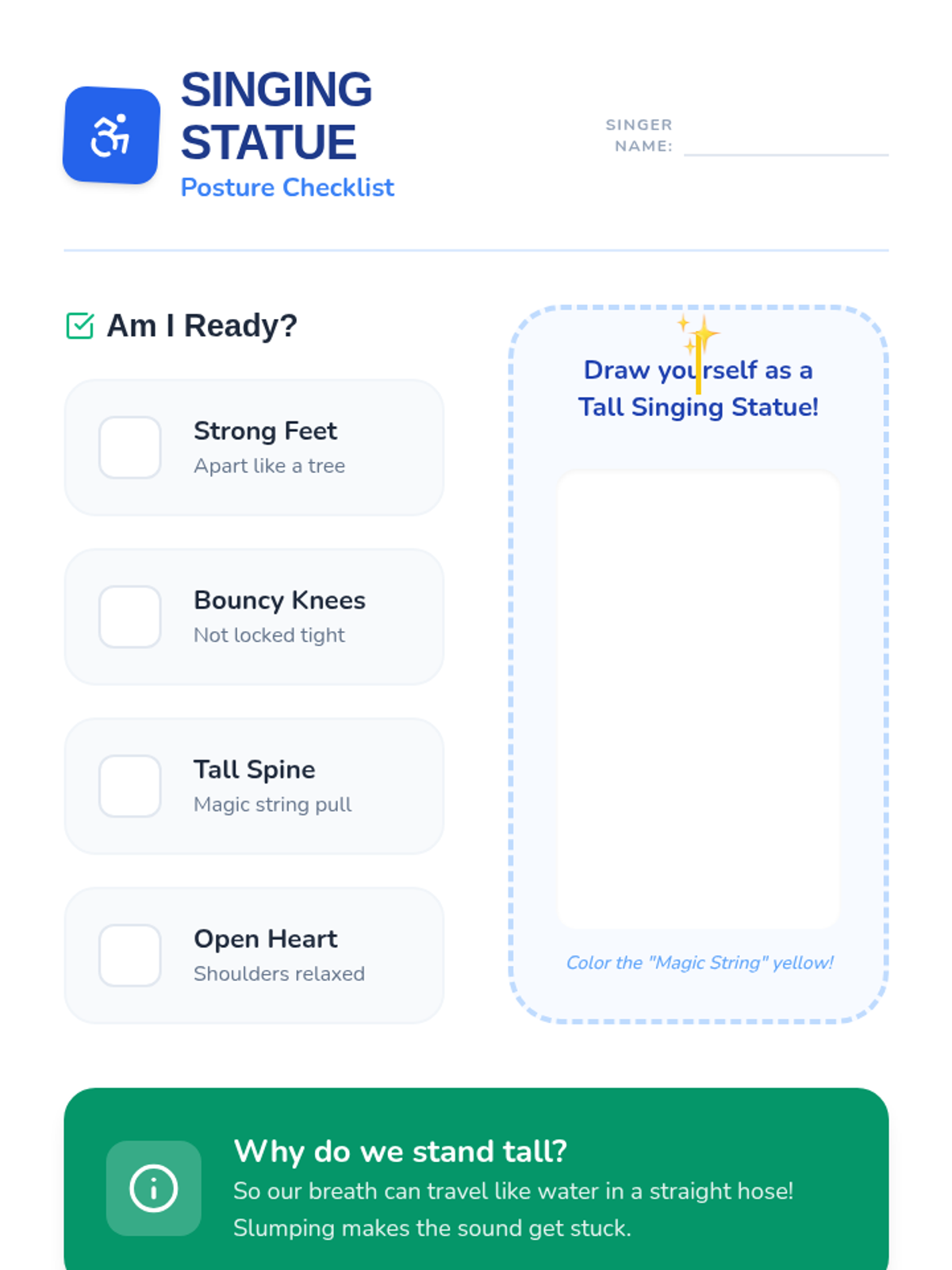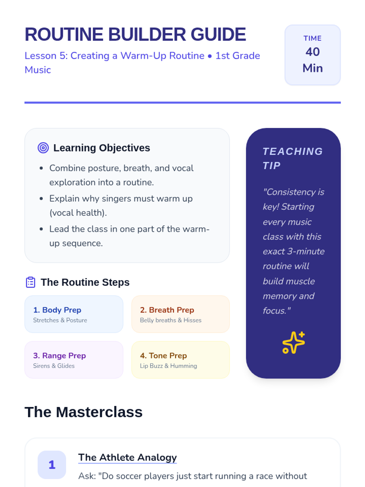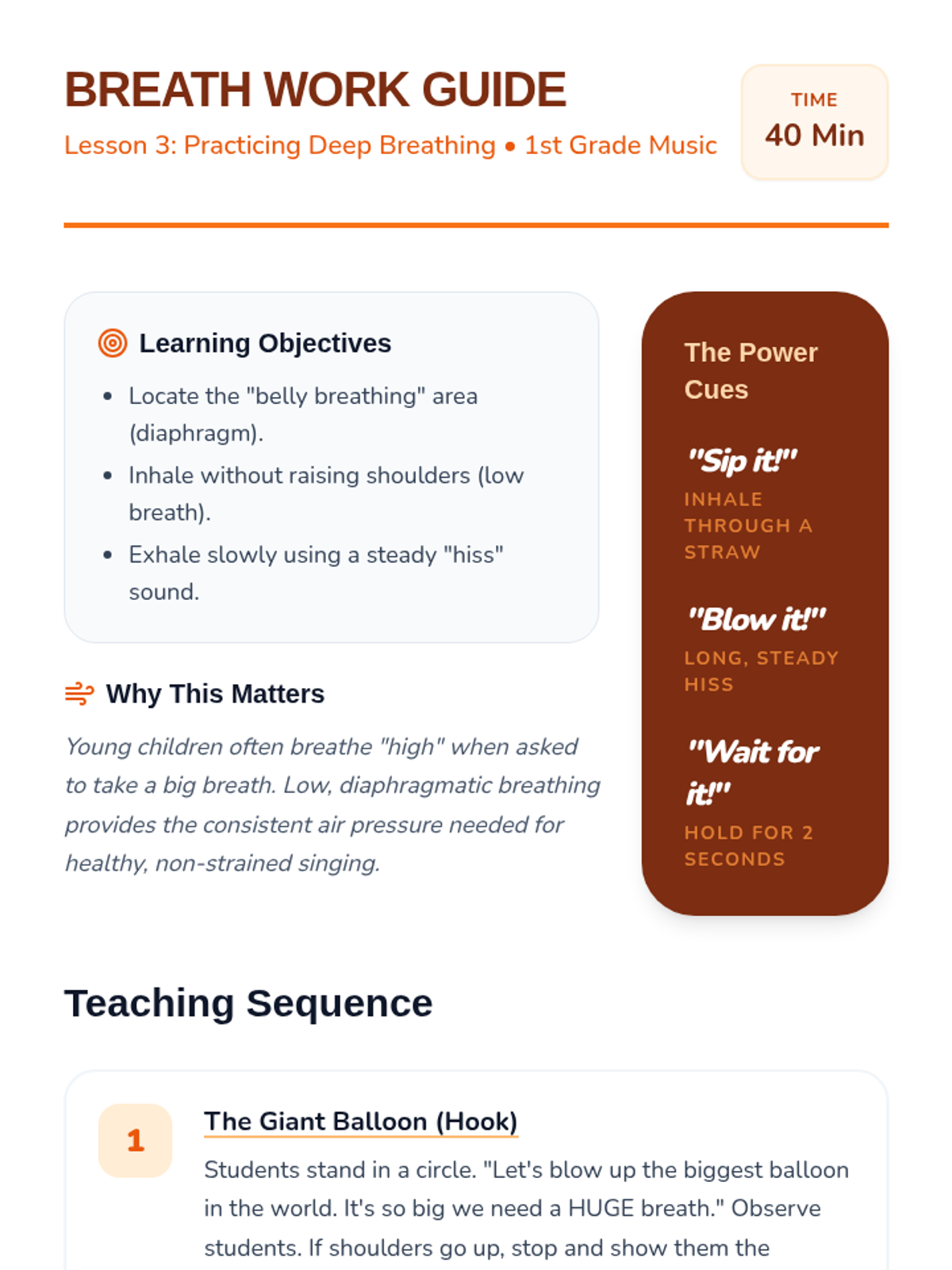 A foundational music sequence for 1st graders focused on vocal health, posture, and breath control through playful exploration. Students learn to treat their body as an instrument, building healthy habits for a lifetime of singing.