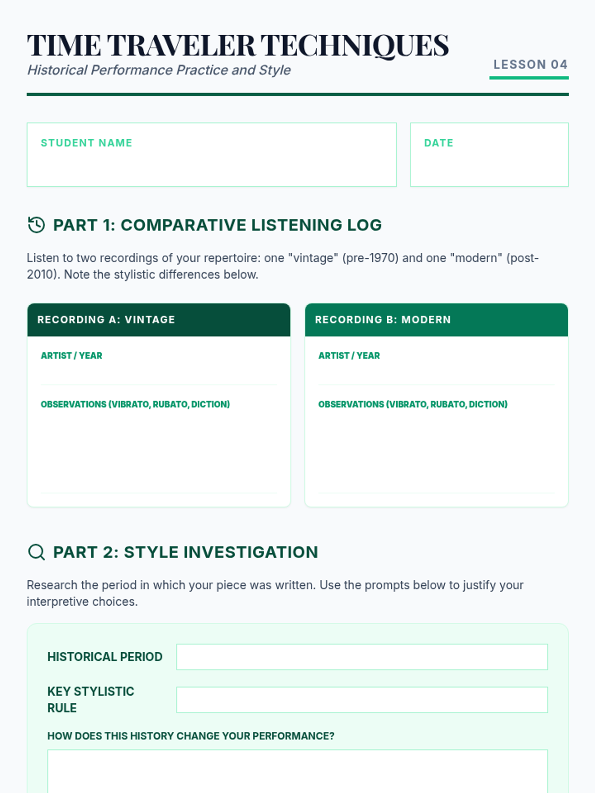 This 4th-grade music history sequence explores the evolution of American music from African roots to Jazz. Students investigate how historical context, community struggle, and cultural migration shaped genres like Spirituals, Blues, Ragtime, and Jazz through active listening, writing, and performance.