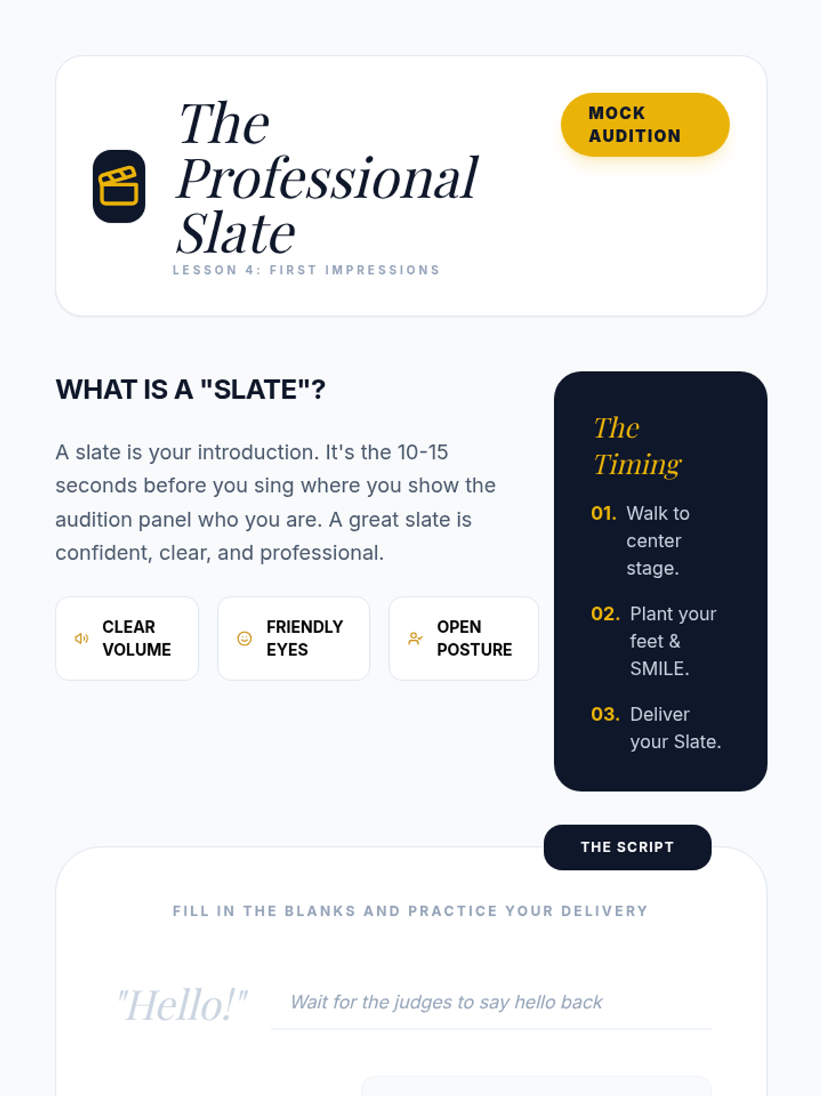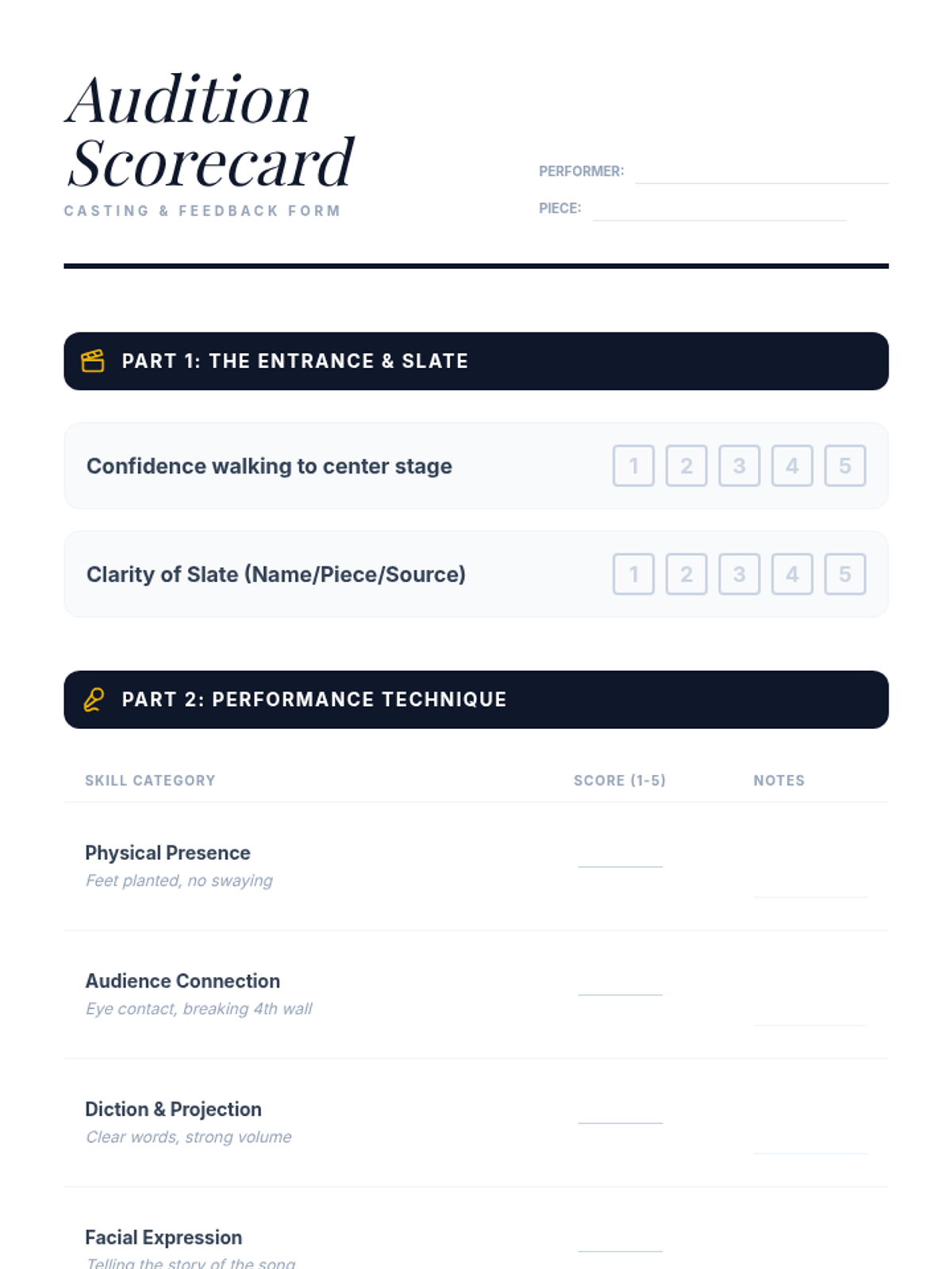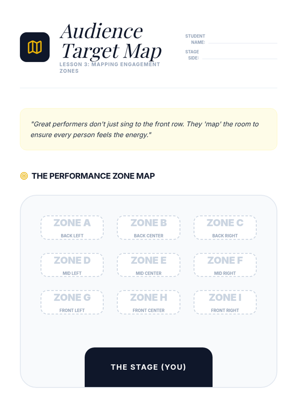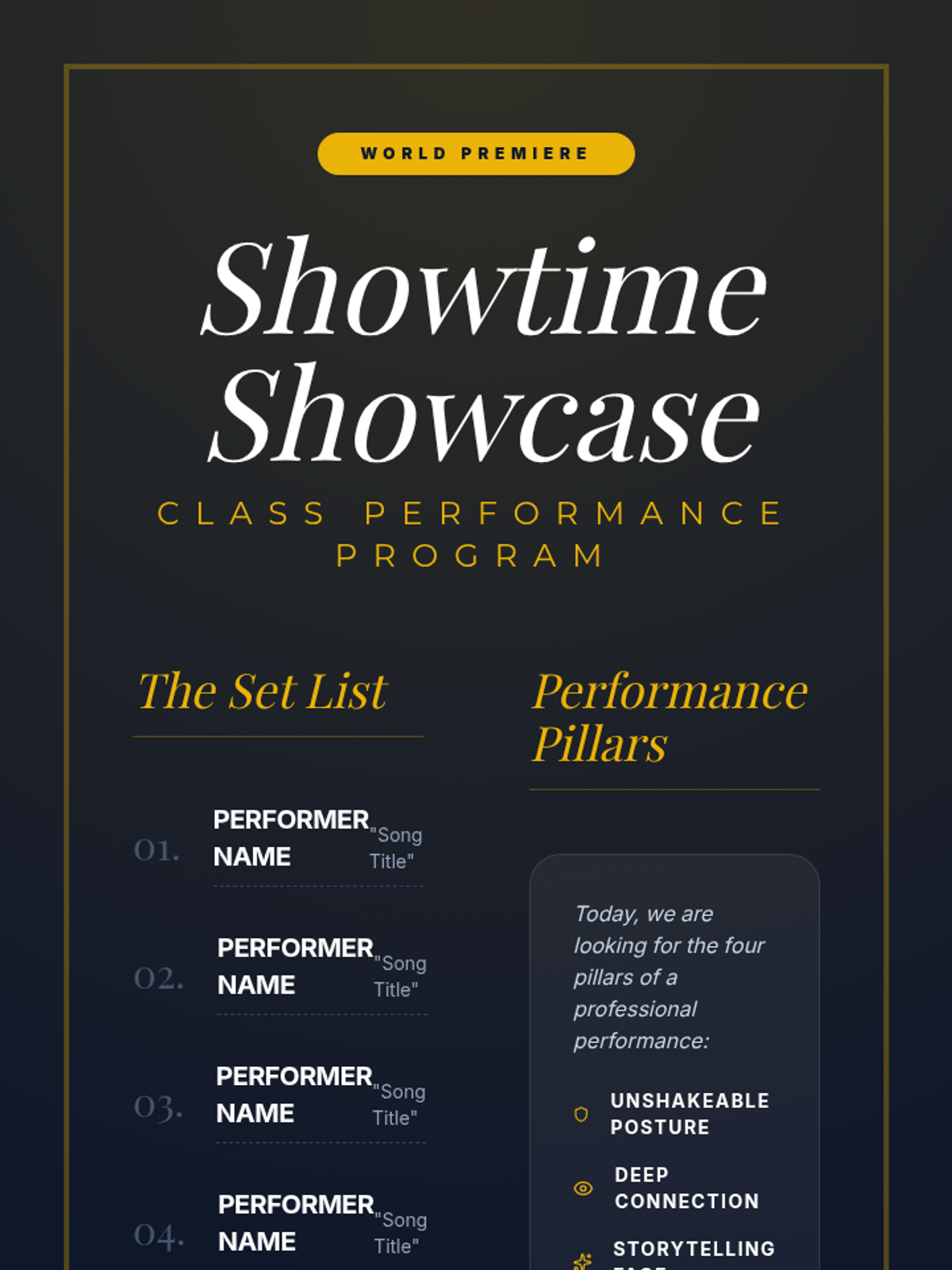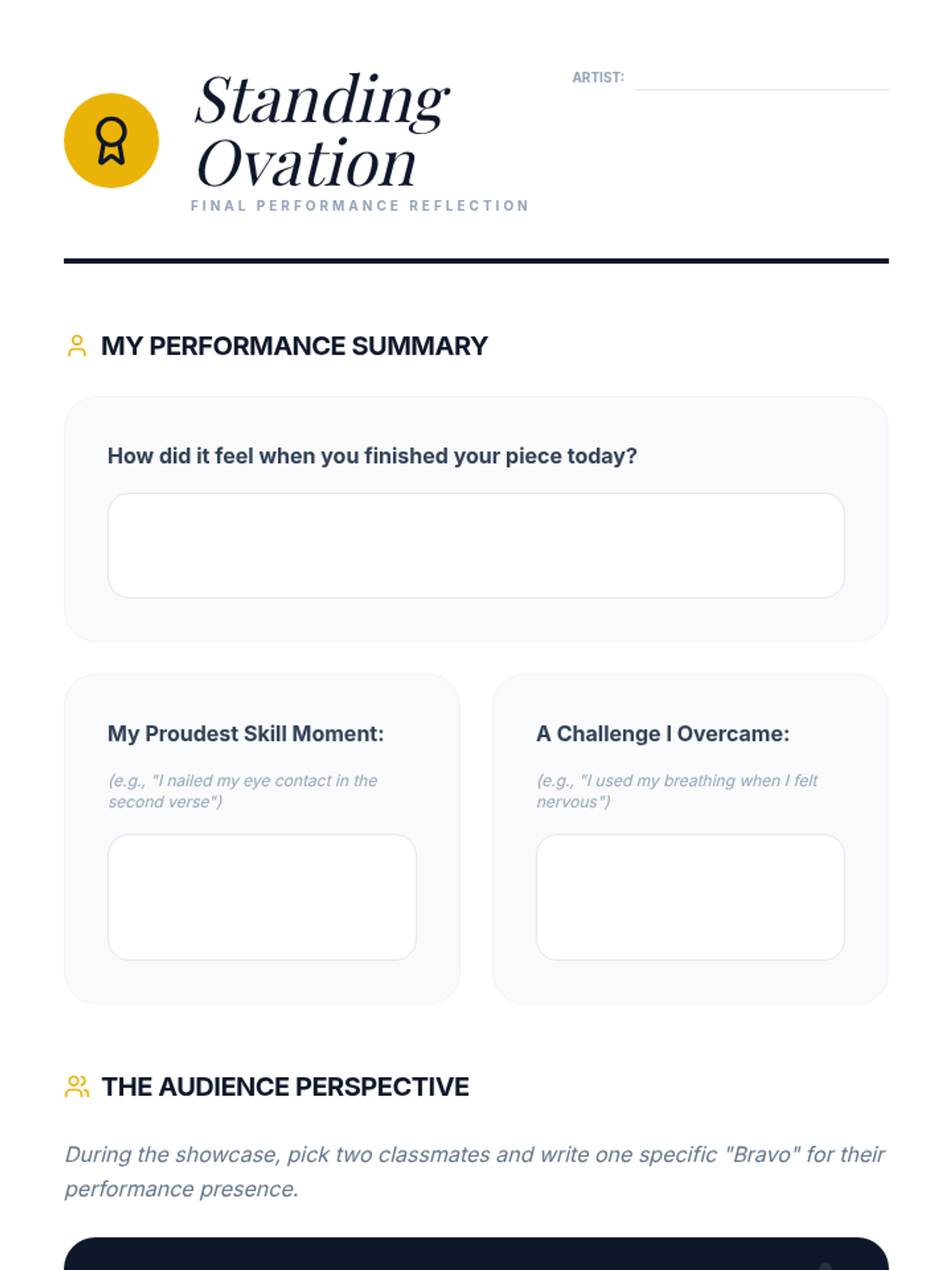 A comprehensive 5th-grade music sequence focused on stage presence, performance anxiety management, and audience connection. Students build professional performance habits through simulations and workshops, culminating in a final showcase.