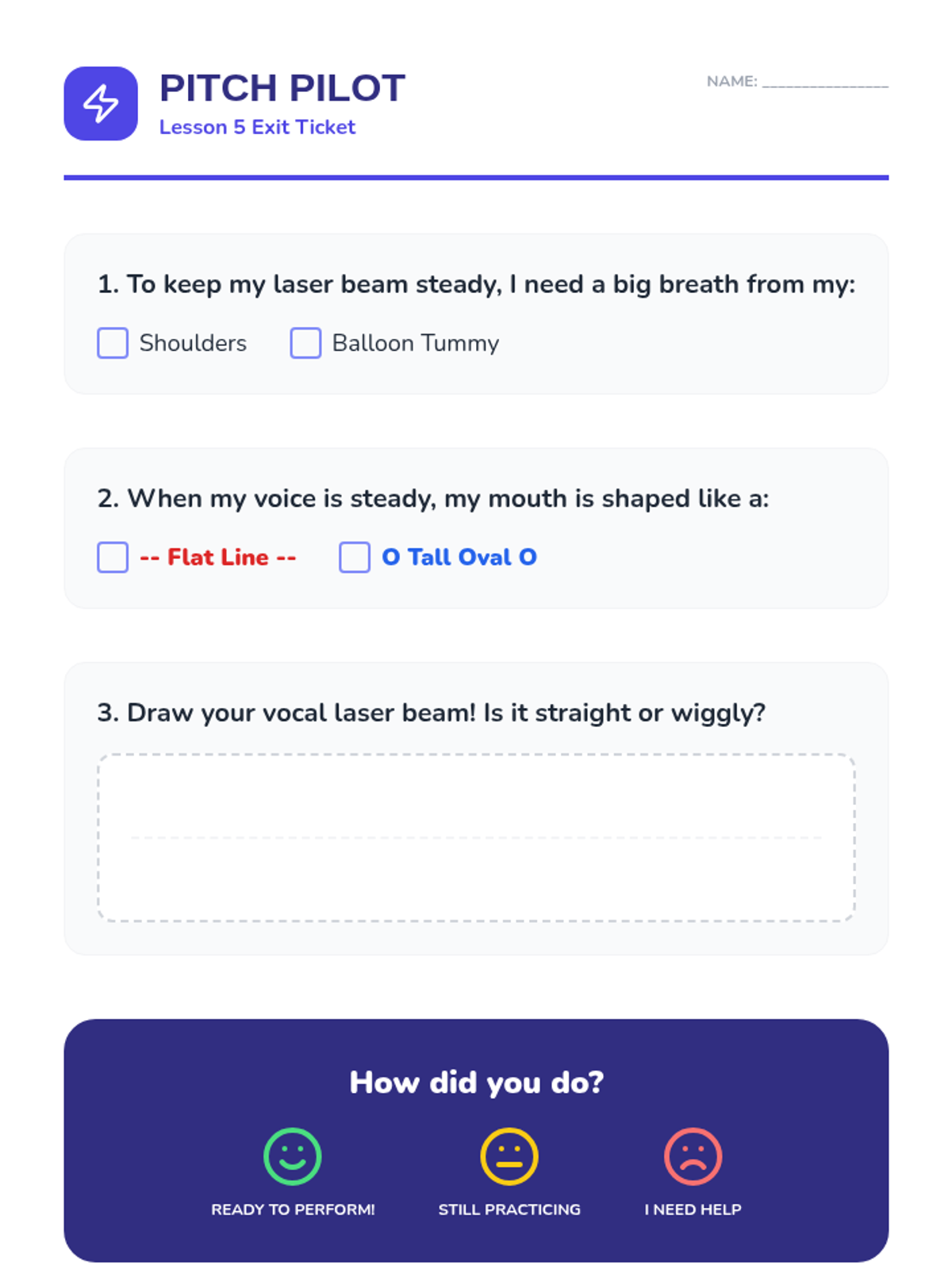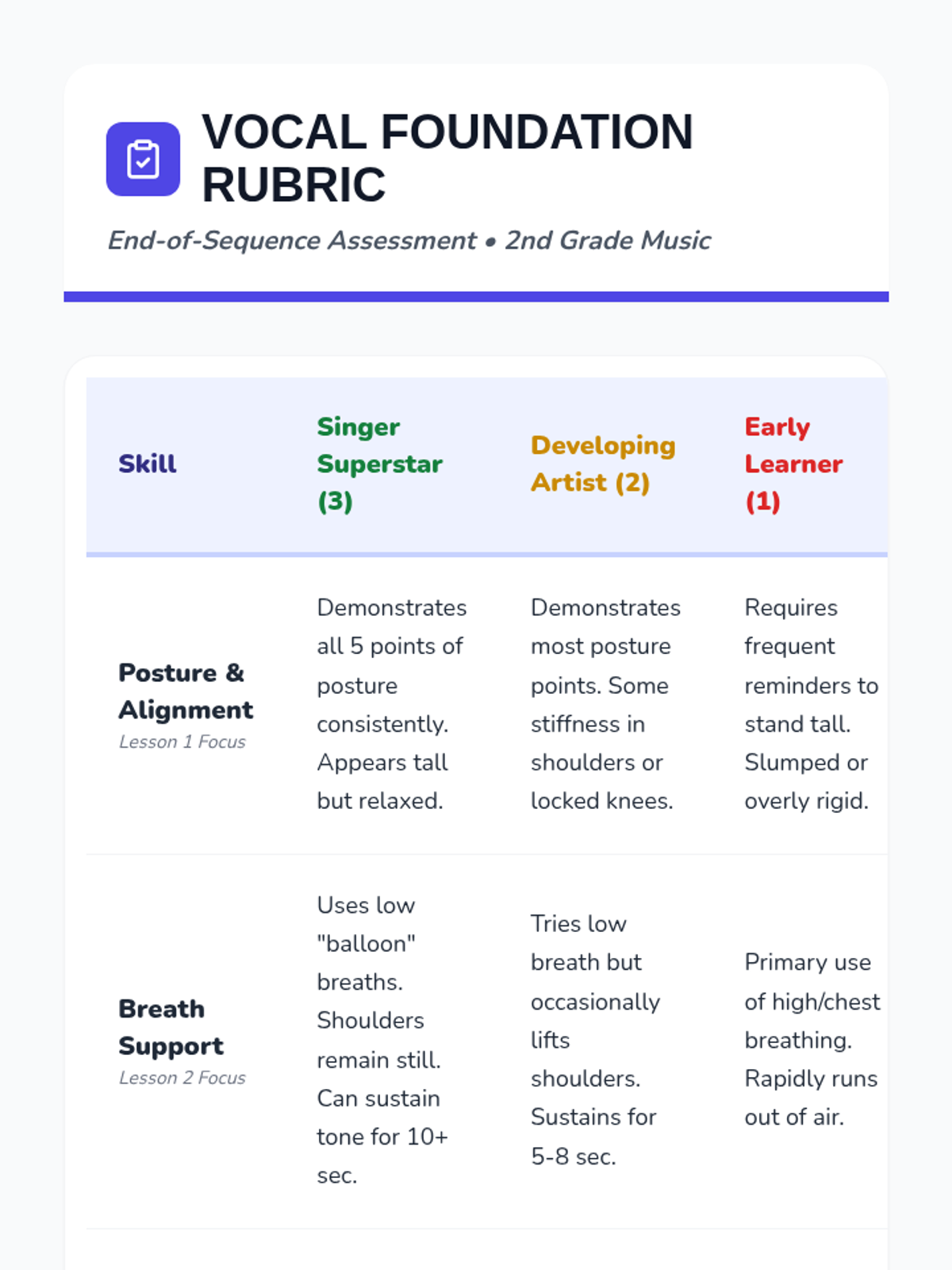 A foundational music sequence for 2nd graders focusing on the physical mechanics of singing. Students explore posture, diaphragmatic breathing, vocal registers, and vowel shapes to build a healthy 'human instrument'.