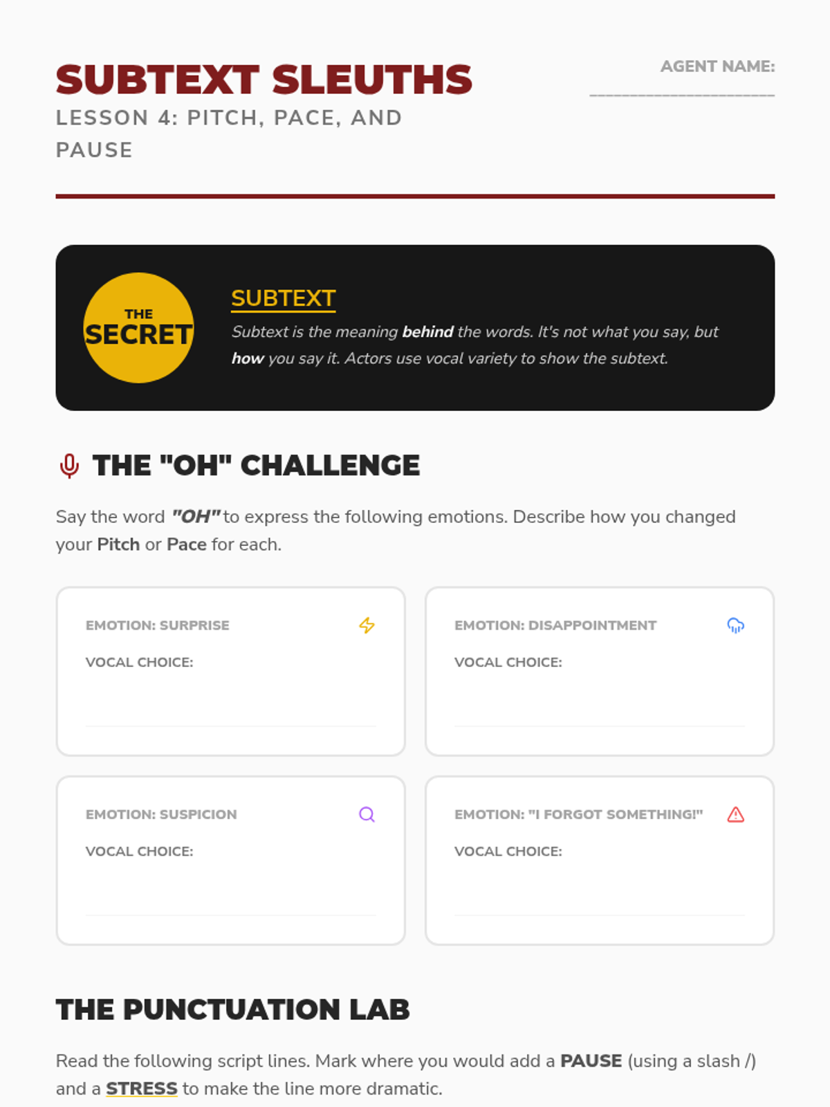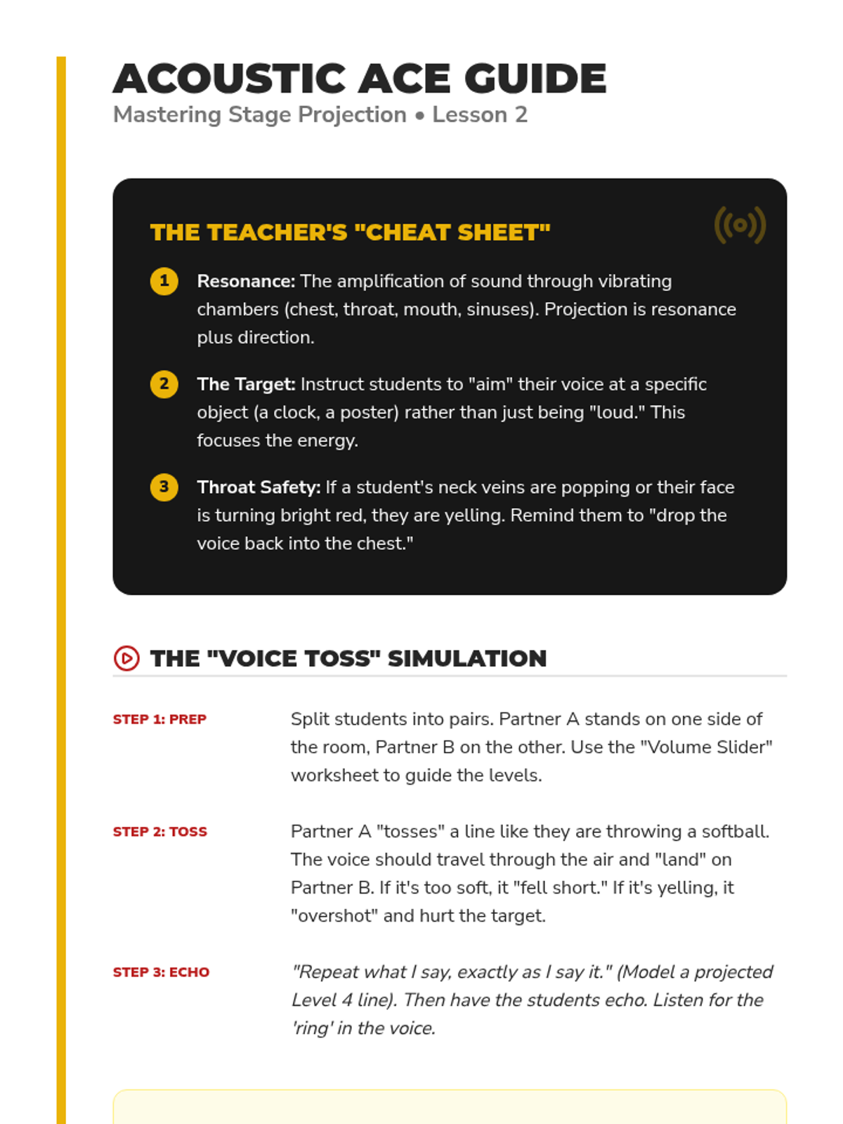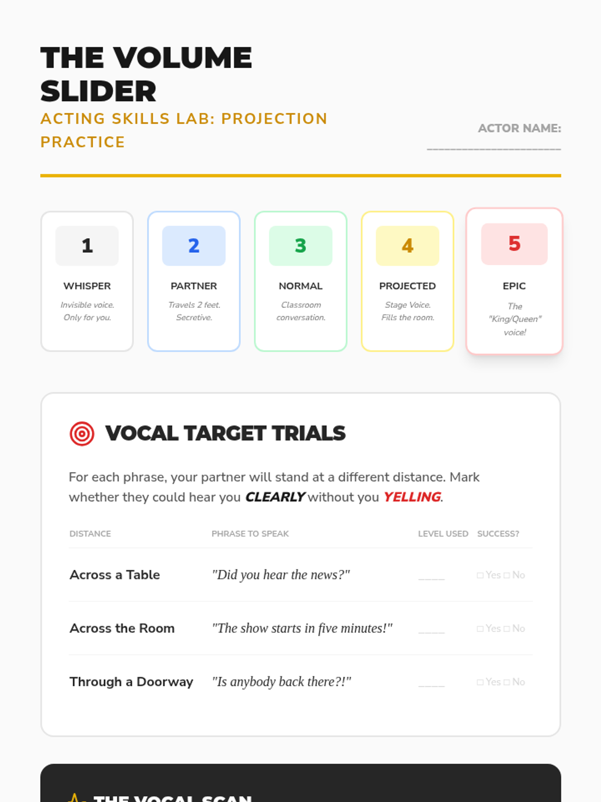 A 5th-grade theater sequence focusing on vocal mechanics, projection, and expressive delivery through workshop-style activities and a culminating Reader's Theater performance.