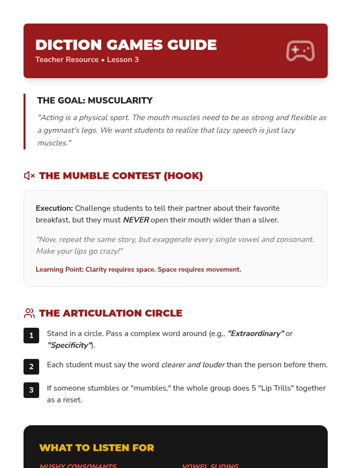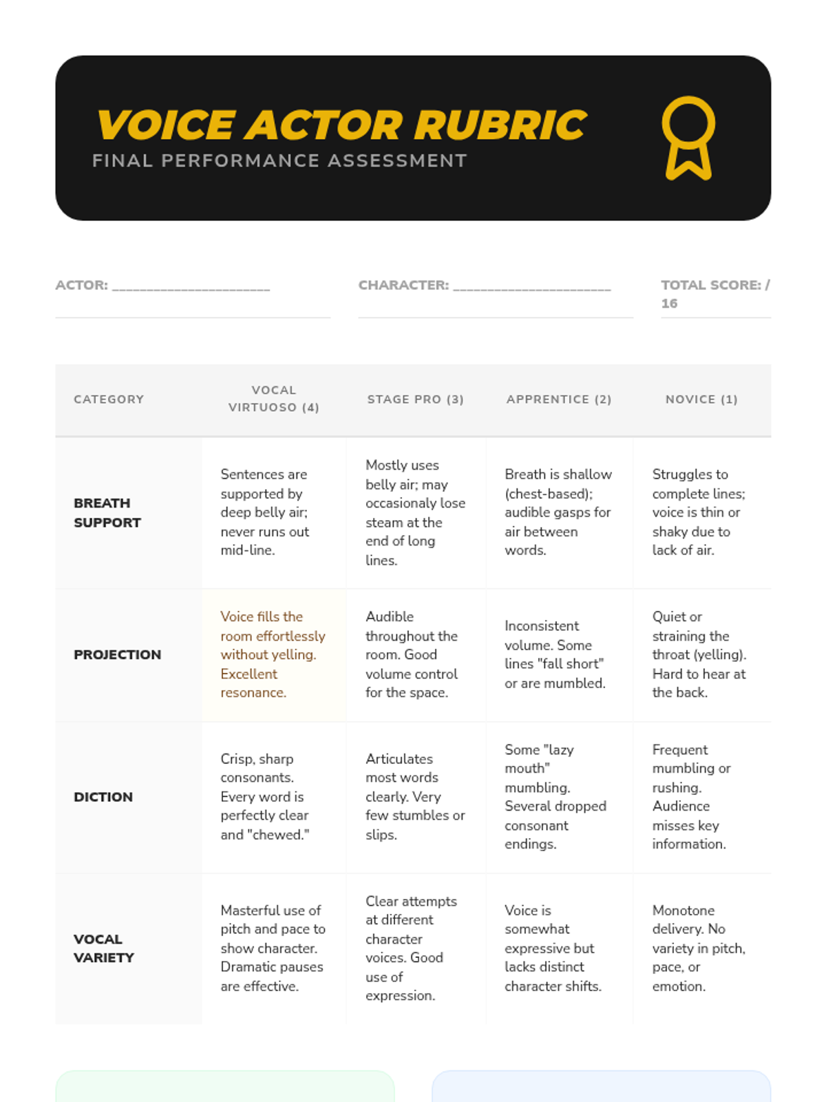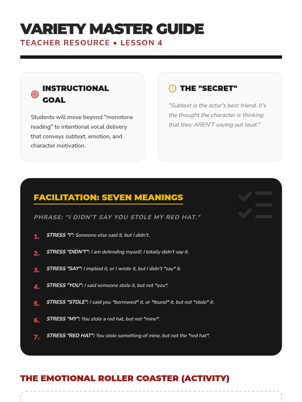 A 5th-grade theater sequence focusing on vocal mechanics, projection, and expressive delivery through workshop-style activities and a culminating Reader's Theater performance.