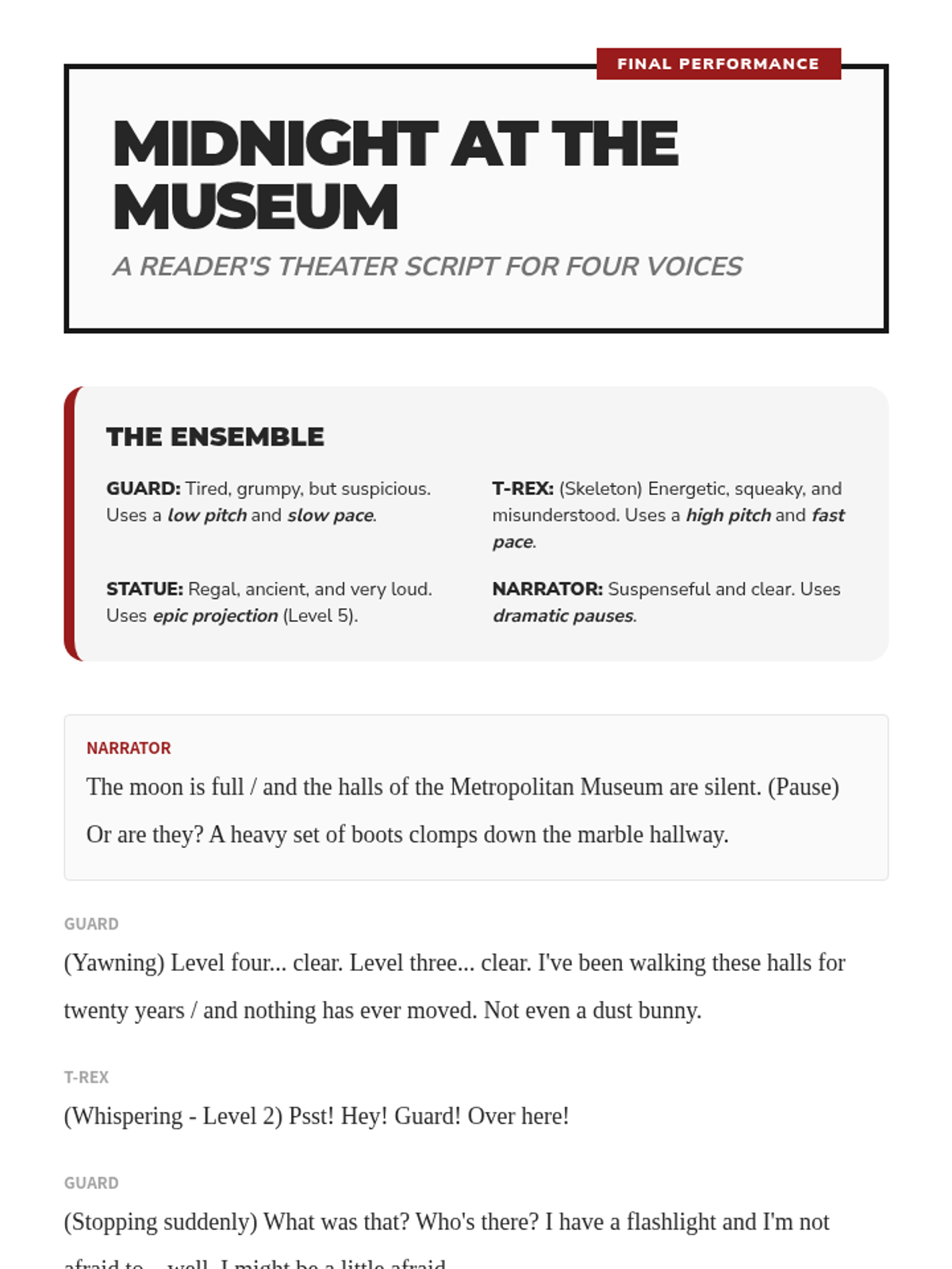 A 5-lesson sequence for 5th-grade students focusing on the iterative process of playwriting, from the first table read to a final, polished performance-ready script. Students develop skills in auditory analysis, dialogue refinement, conciseness, and collaboration.