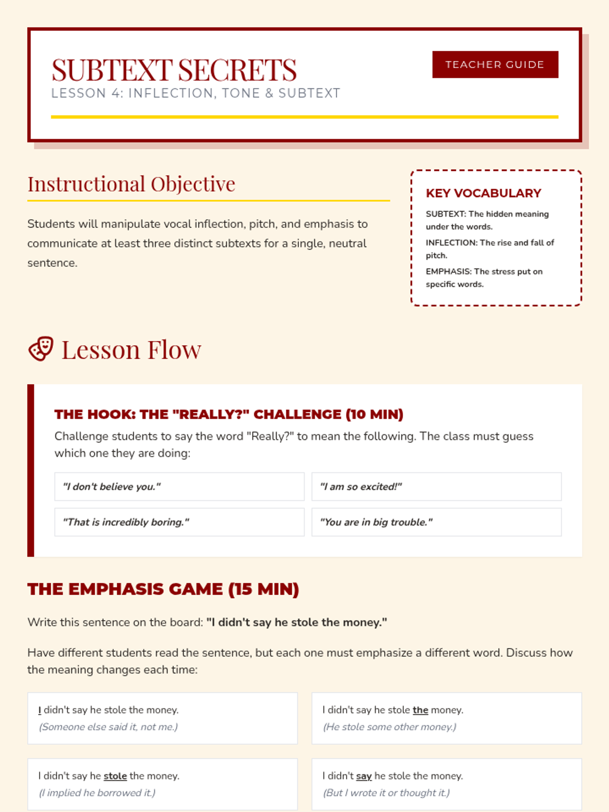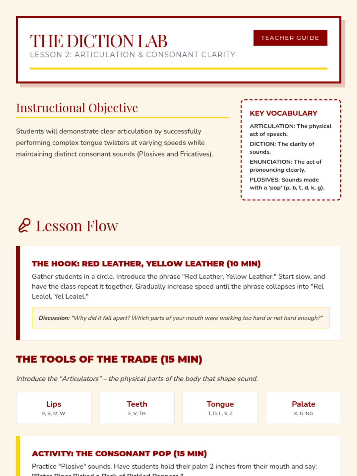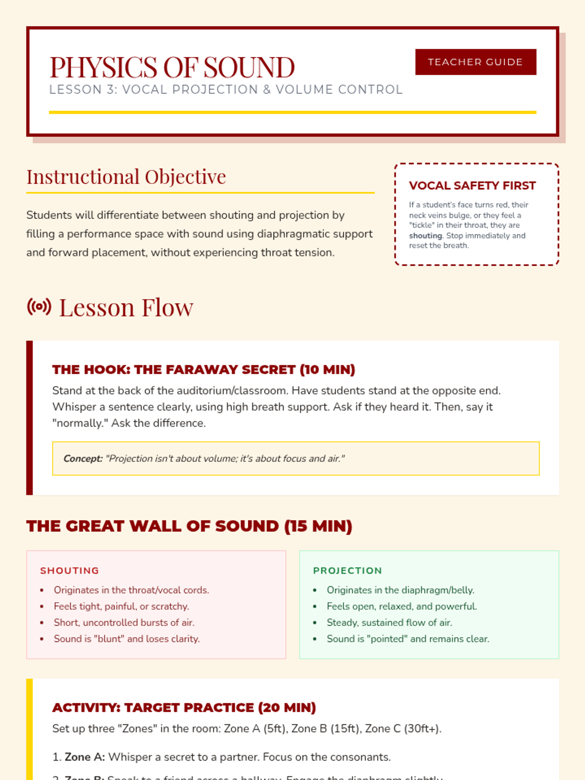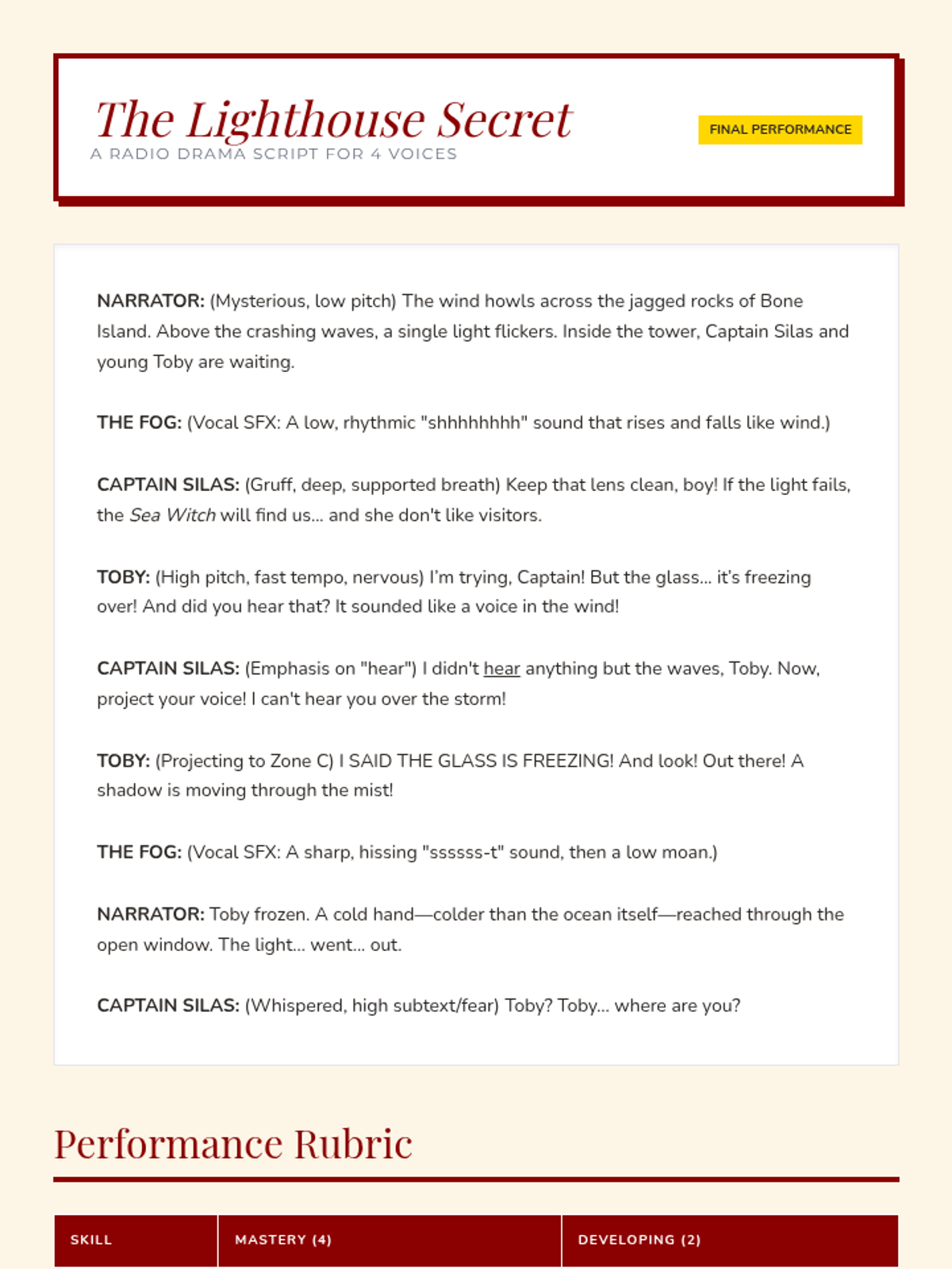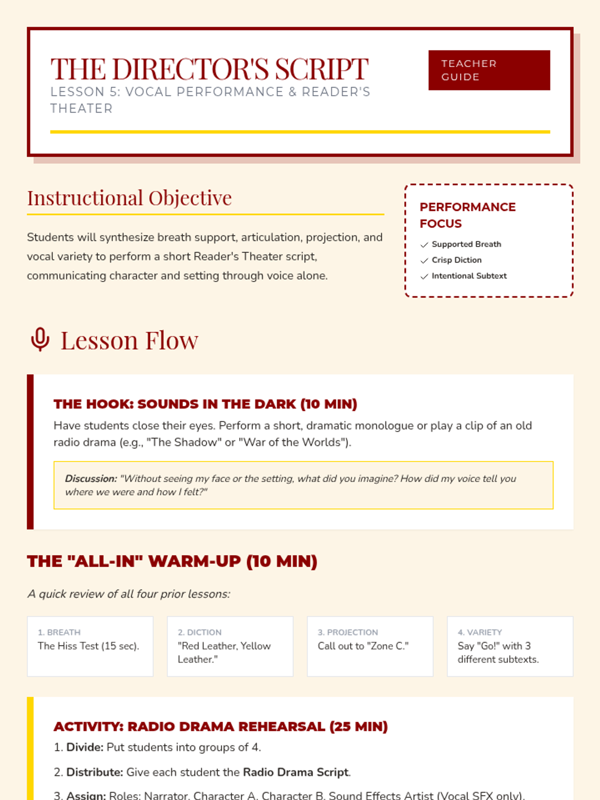 A comprehensive unit for 6th-grade theater students focusing on breath support, articulation, projection, and vocal variety. Students learn to use their voices as powerful tools for storytelling through technical exercises and a final reader's theater performance.