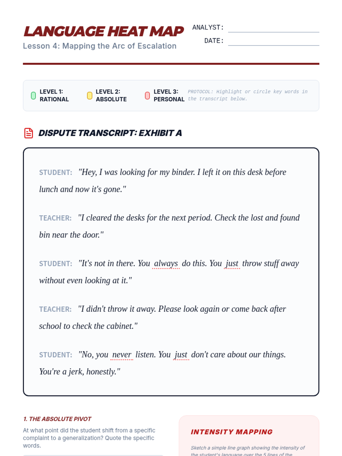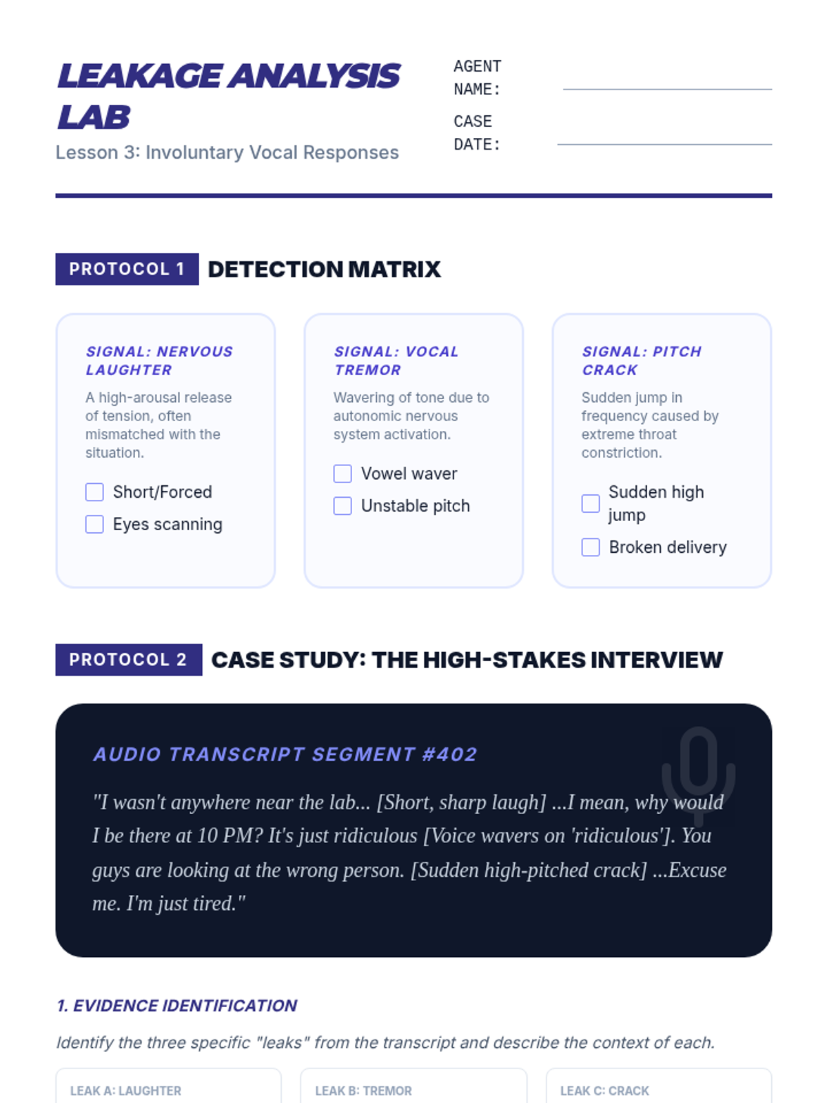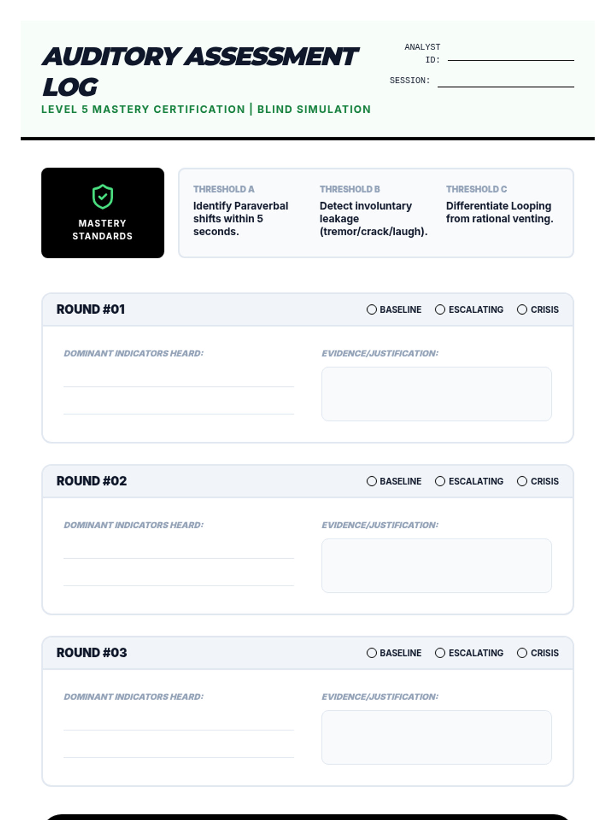 A comprehensive 11th-grade sequence focusing on auditory and paraverbal warning signs of behavioral escalation. Students learn to analyze tone, volume, cadence, and speech patterns to identify emotional states and prevent conflict.