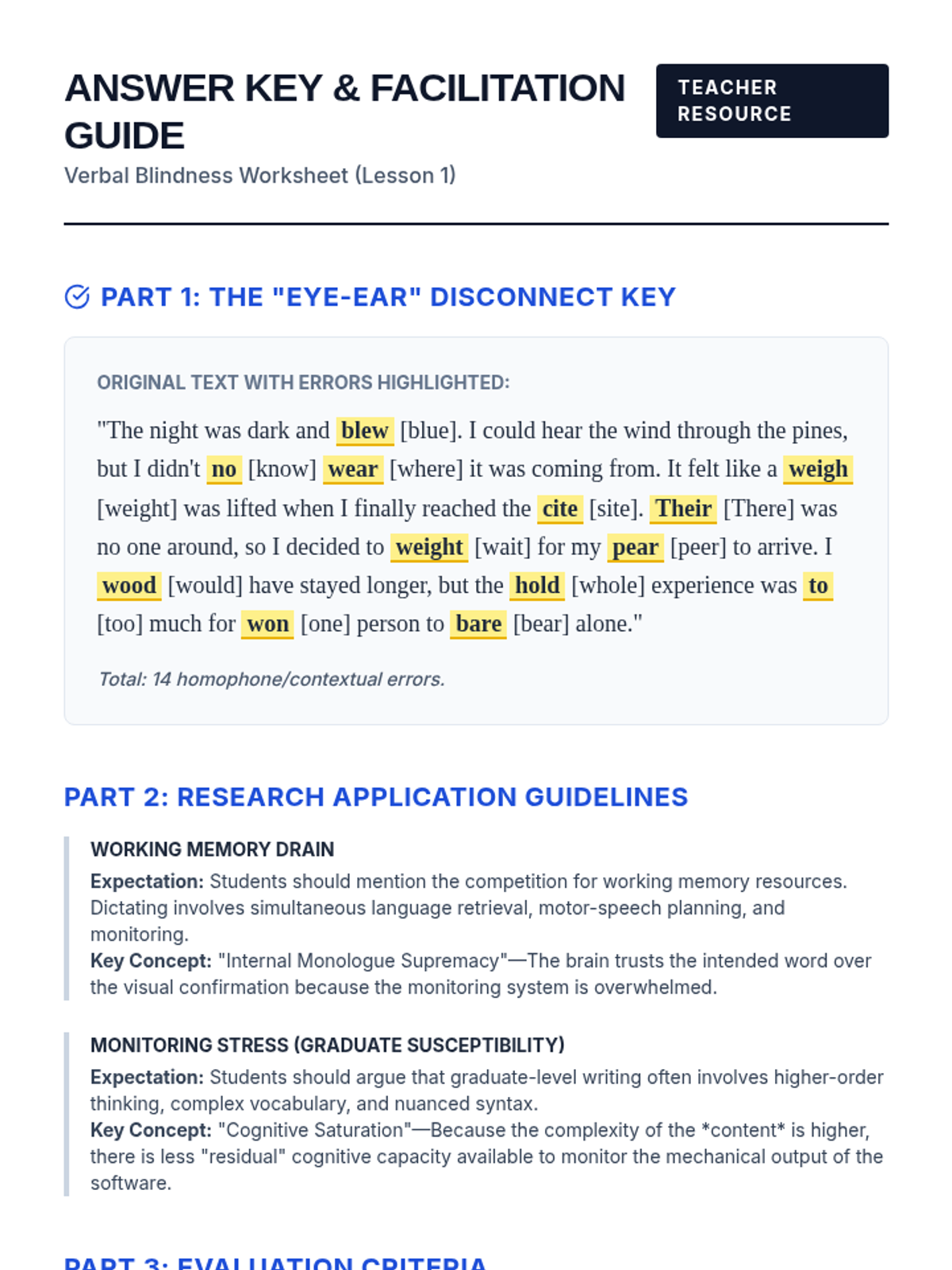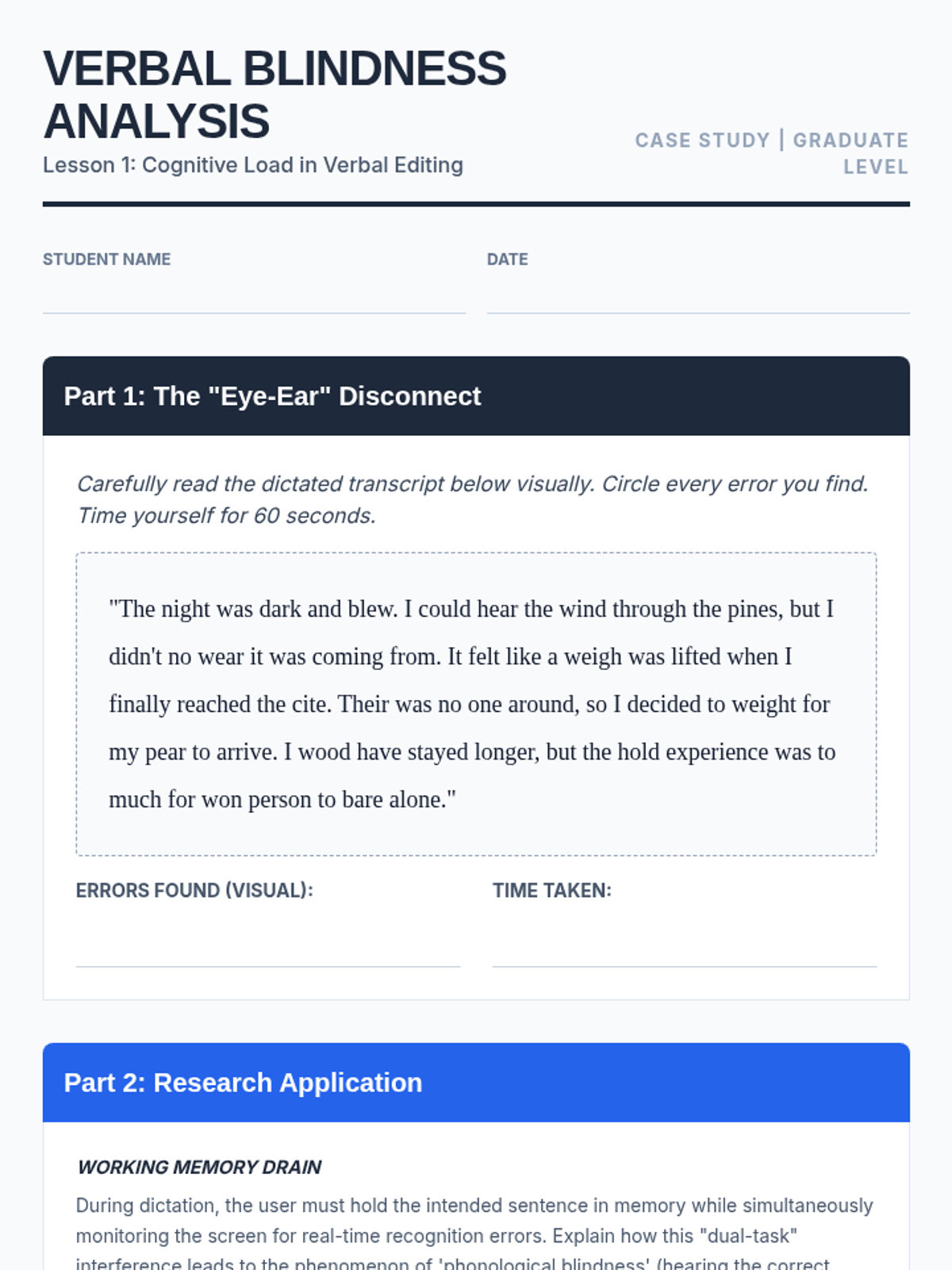 This graduate-level sequence focuses on the cognitive and technical workflows of verbal editing in assistive technology. Students explore the shift from visual to auditory processing, master error correction techniques, and develop professional checklists for speech recognition users.