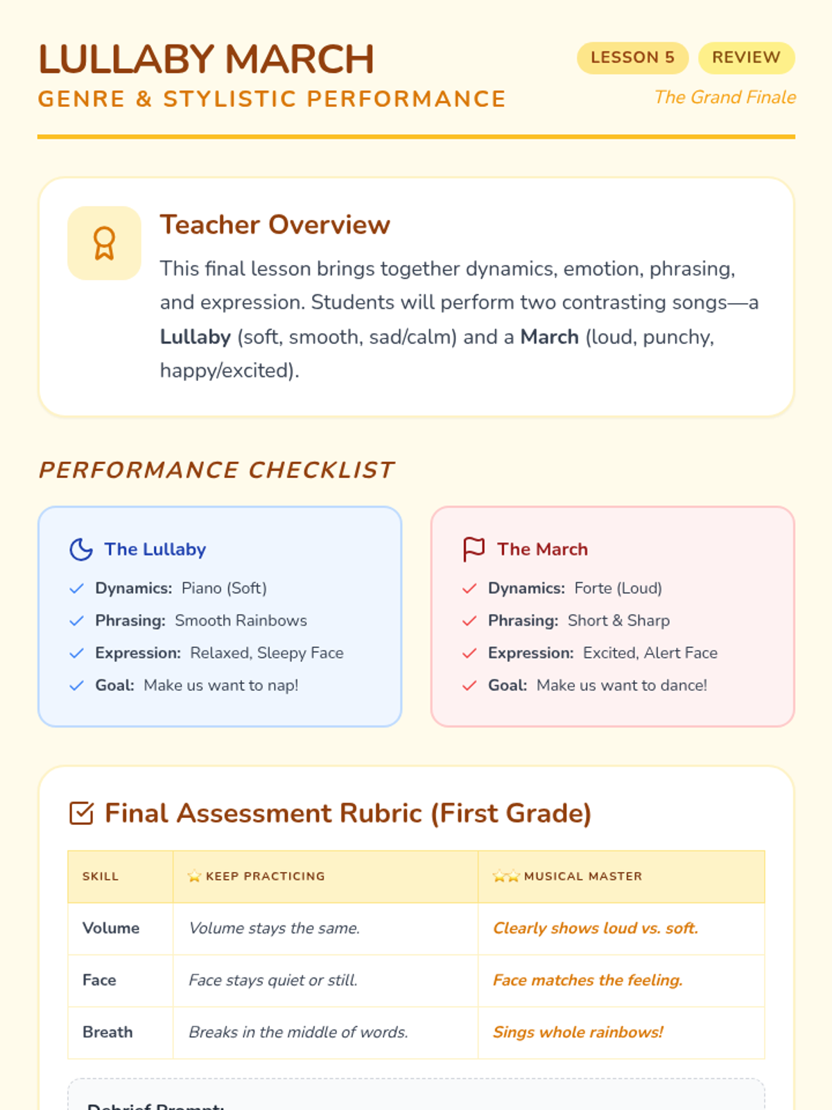 This sequence guides 1st-grade students through the transition from singers to performers. Over five lessons, students master the physical discipline of the performer's stance, visual focus, stage etiquette (entrances and bows), and the full rehearsal process, culminating in a classroom concert.