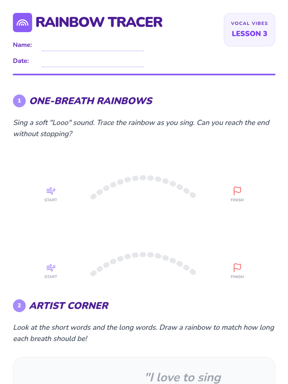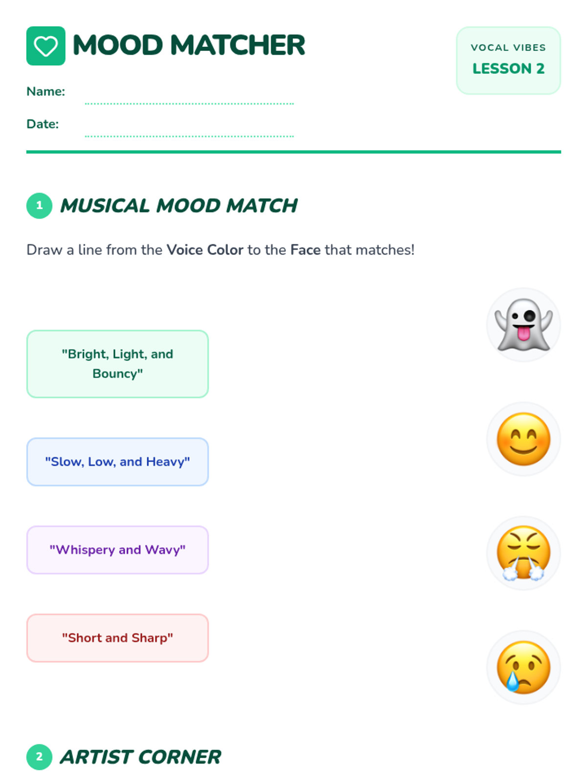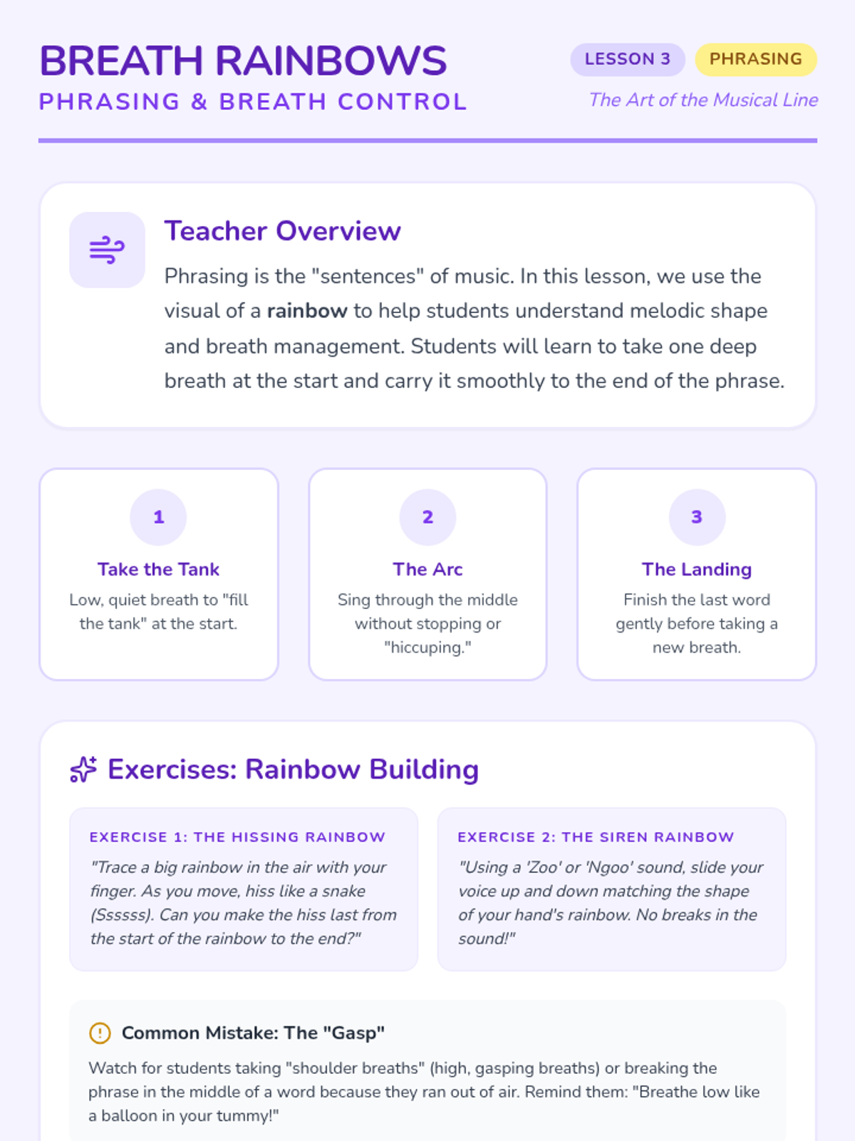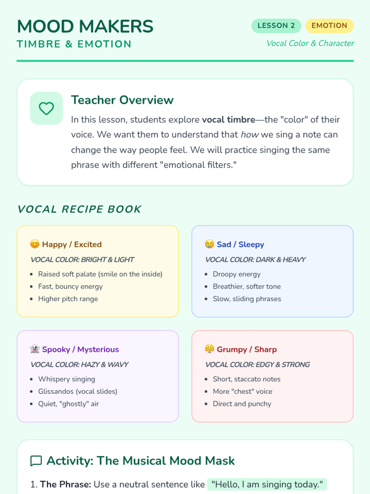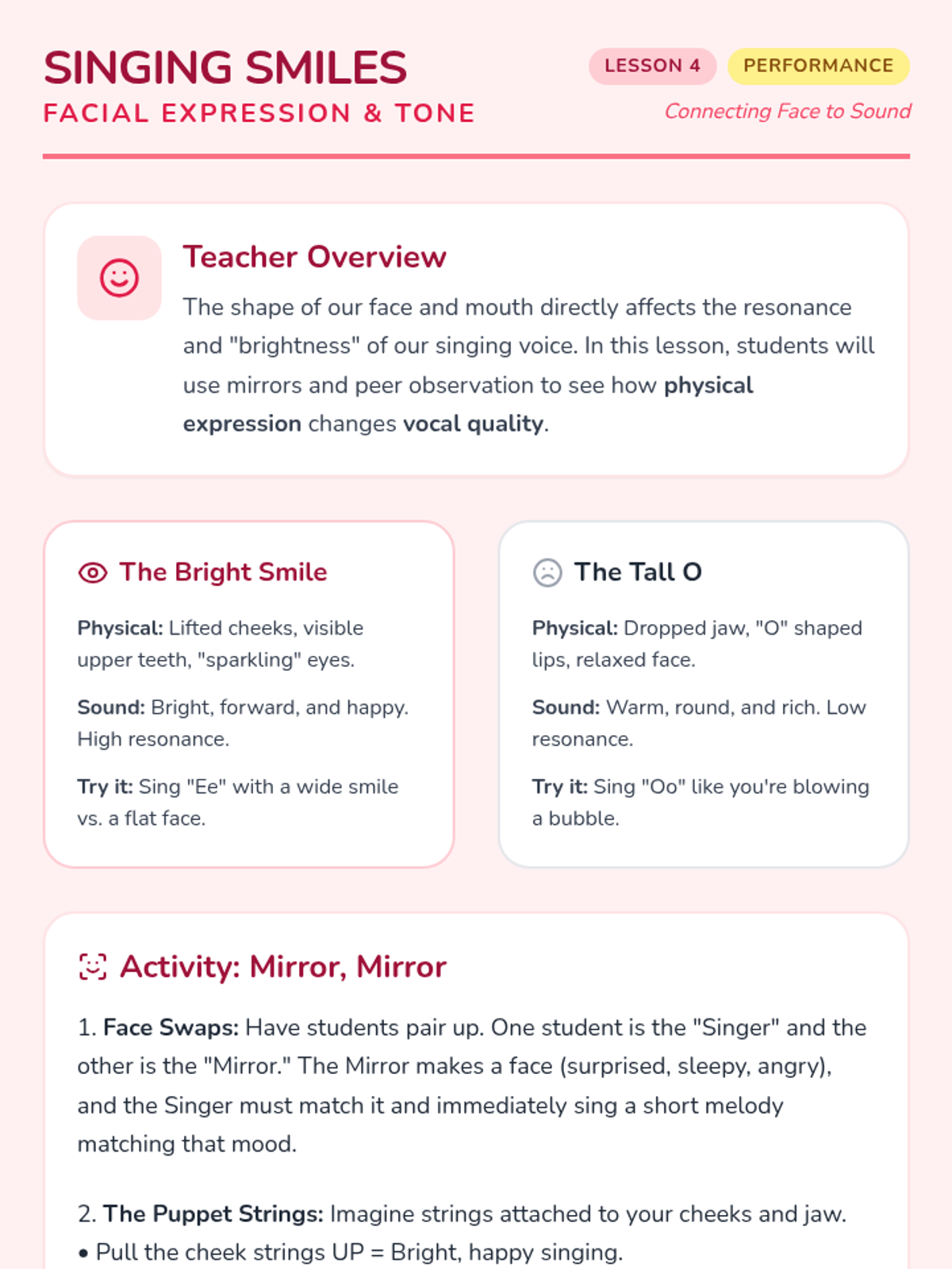 A foundational music sequence for 1st graders focused on vocal health, posture, and breath control through playful exploration. Students learn to treat their body as an instrument, building healthy habits for a lifetime of singing.