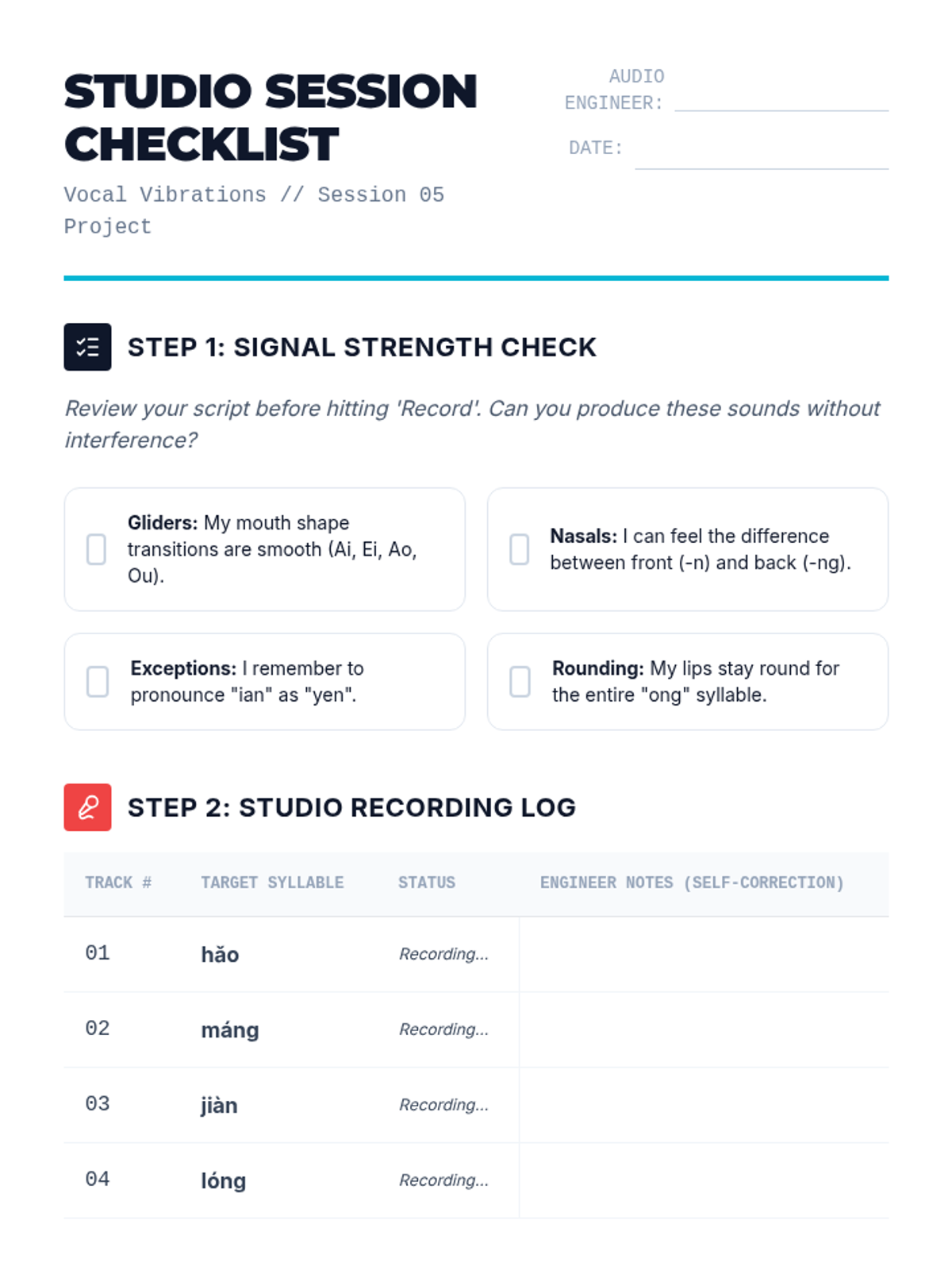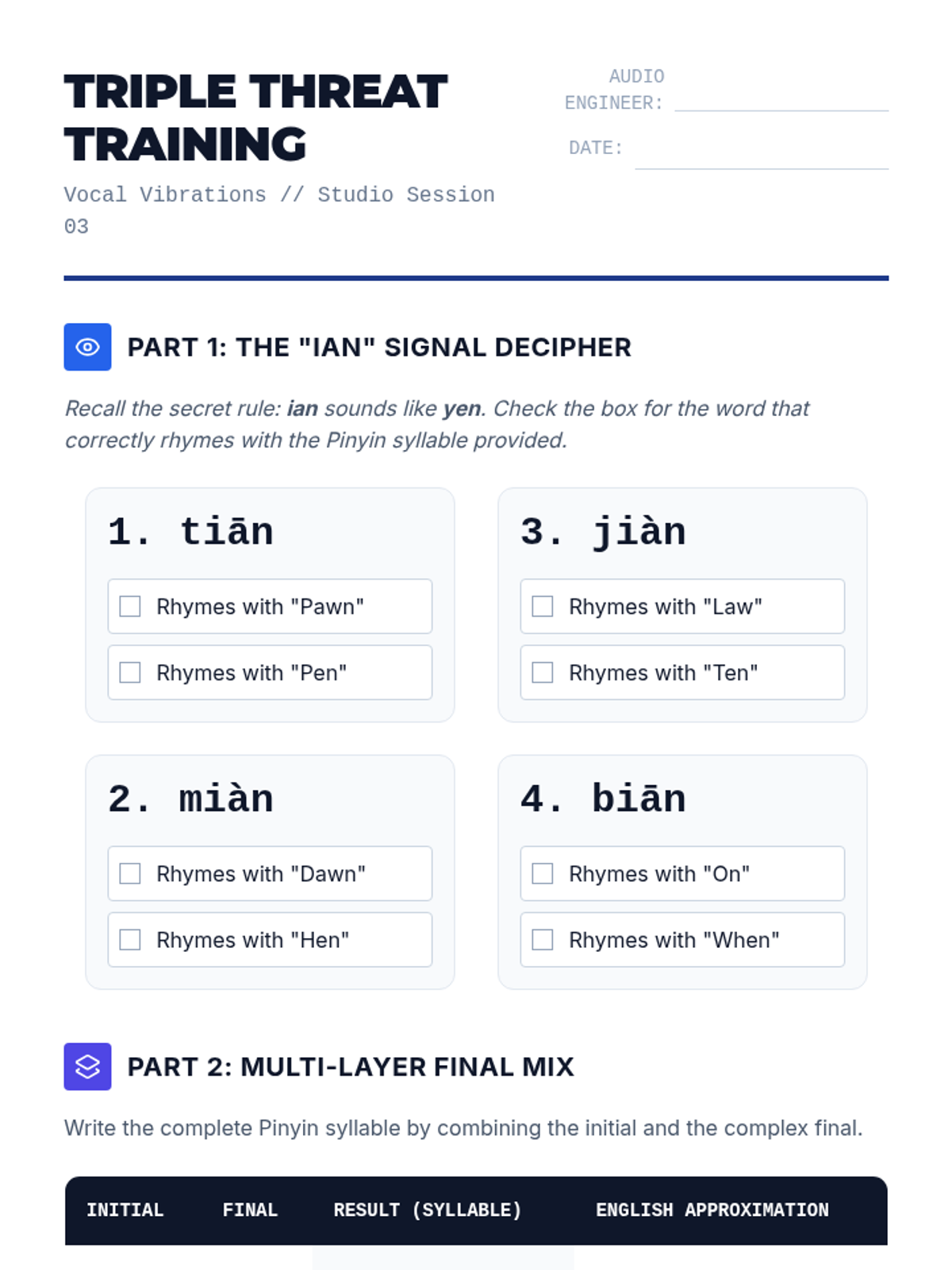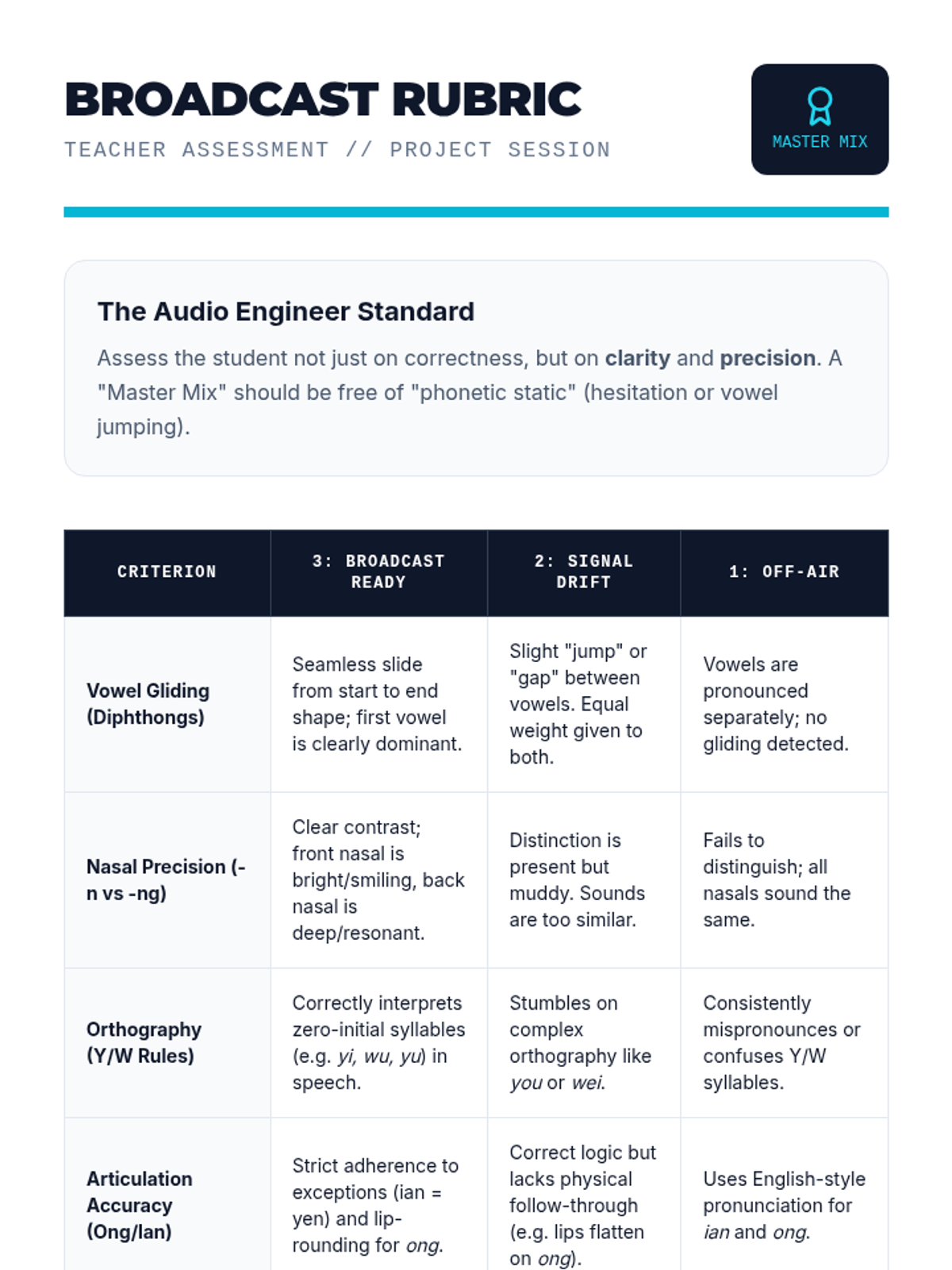 A specialized sequence on Mandarin Pinyin compound and nasal finals, using an 'Audio Engineering' theme to help students master complex vowel glides and subtle nasal distinctions. Students progress from basic diphthongs to orthographic rules, concluding with a recording project.