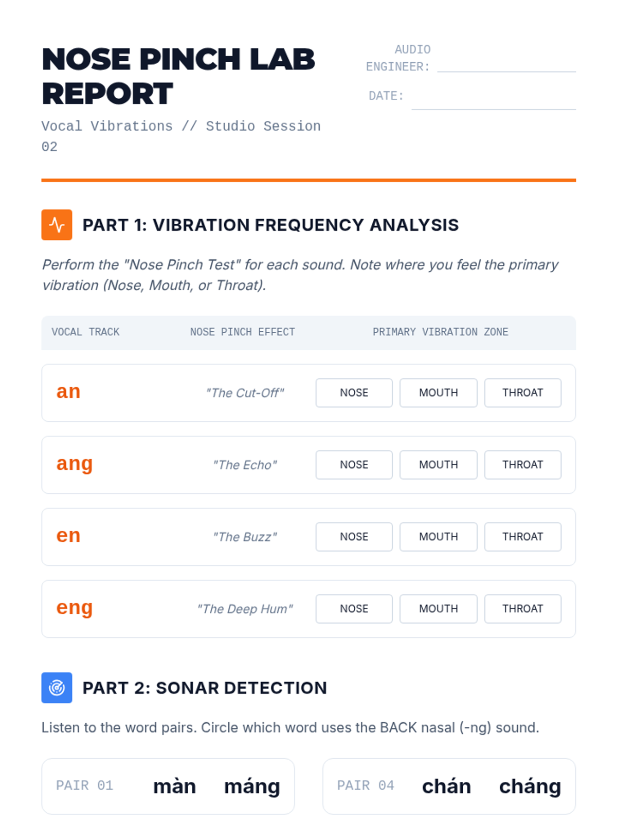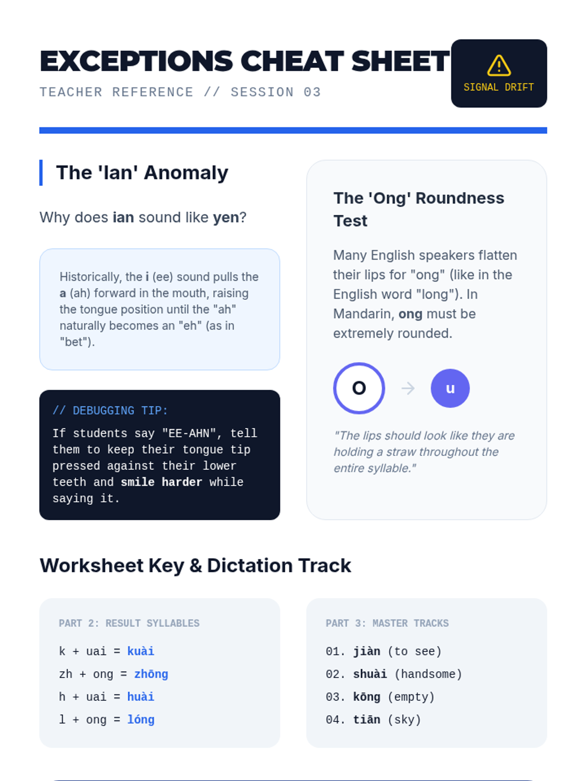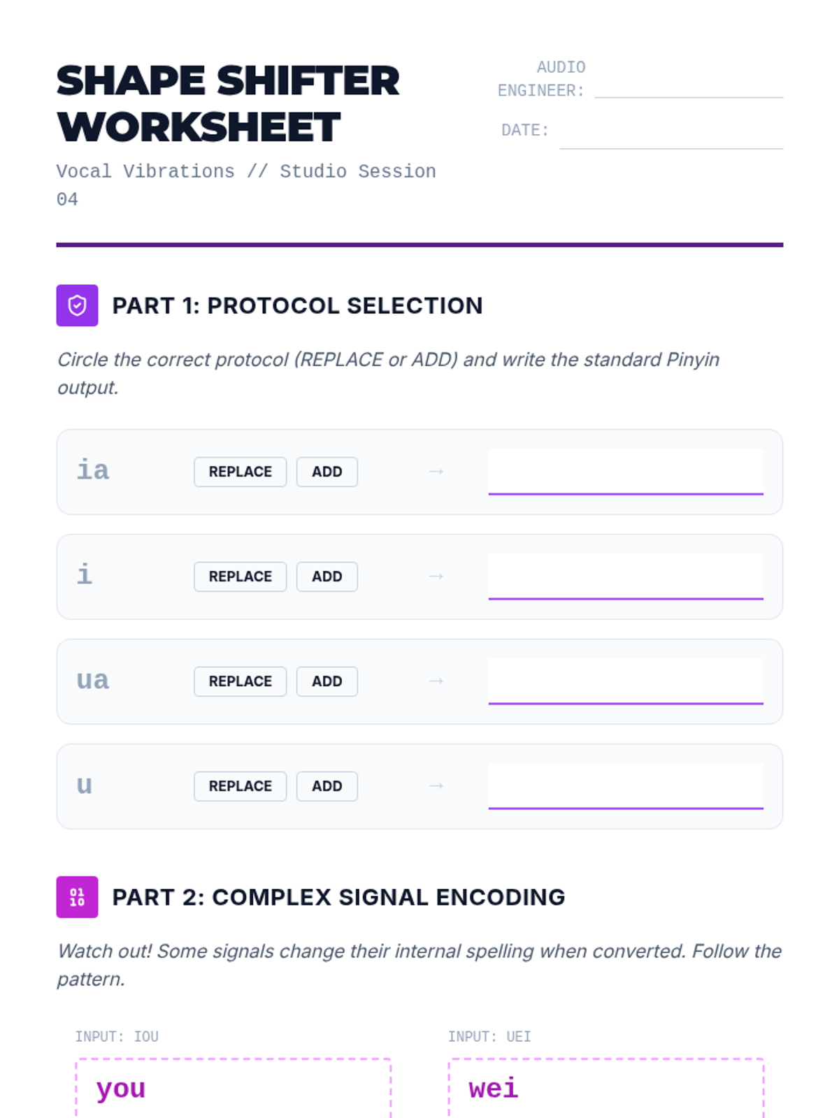 A specialized sequence on Mandarin Pinyin compound and nasal finals, using an 'Audio Engineering' theme to help students master complex vowel glides and subtle nasal distinctions. Students progress from basic diphthongs to orthographic rules, concluding with a recording project.