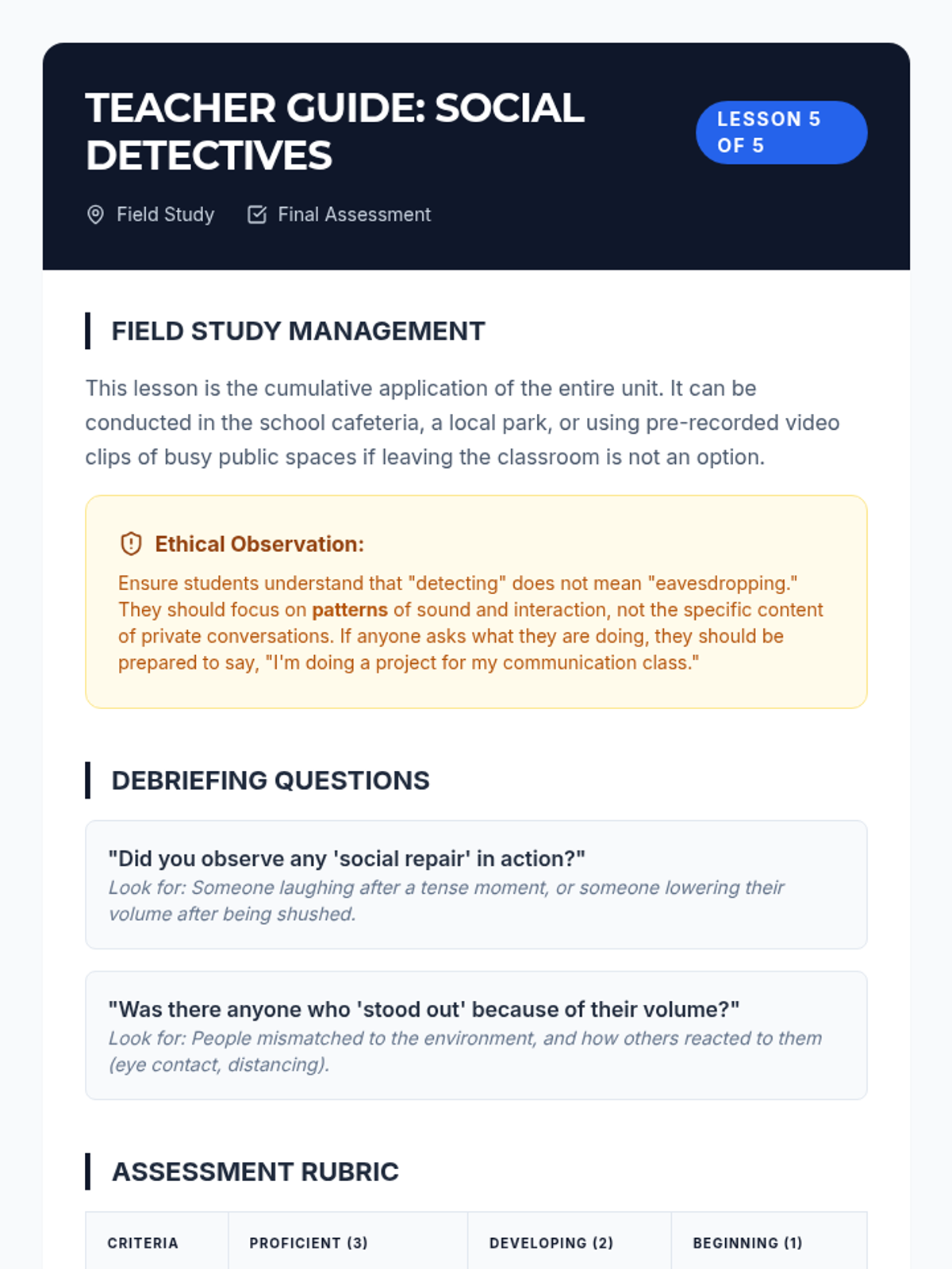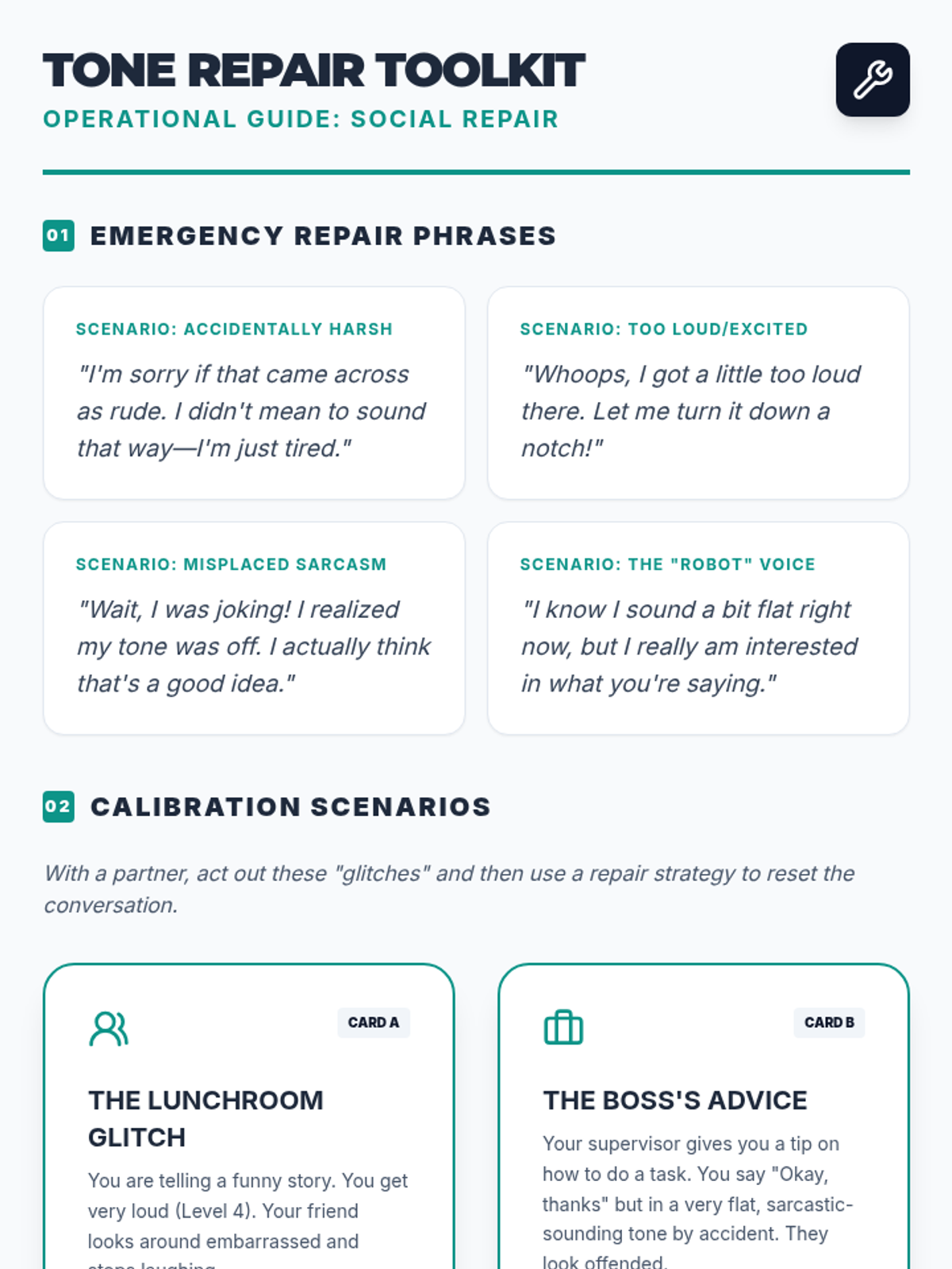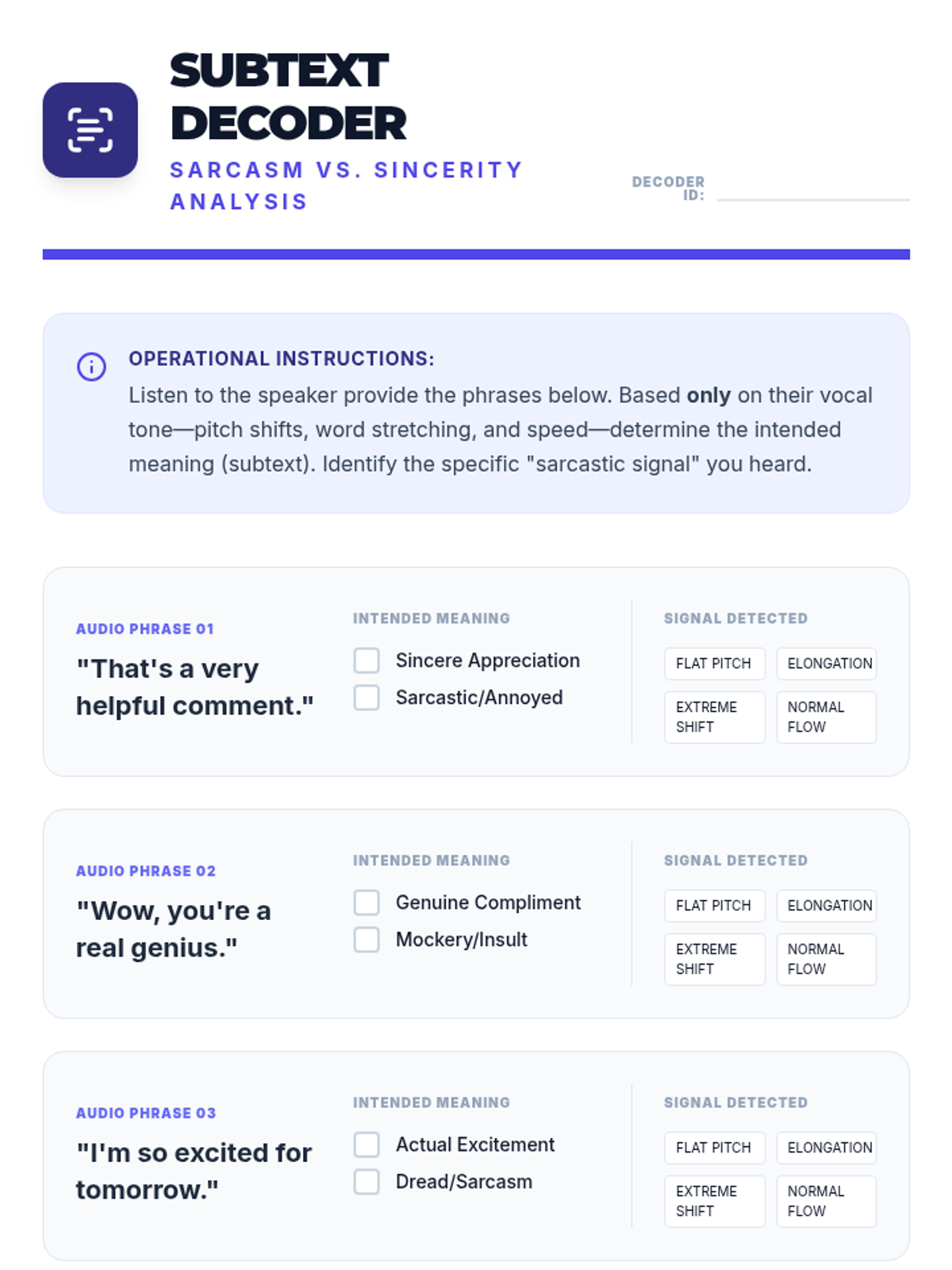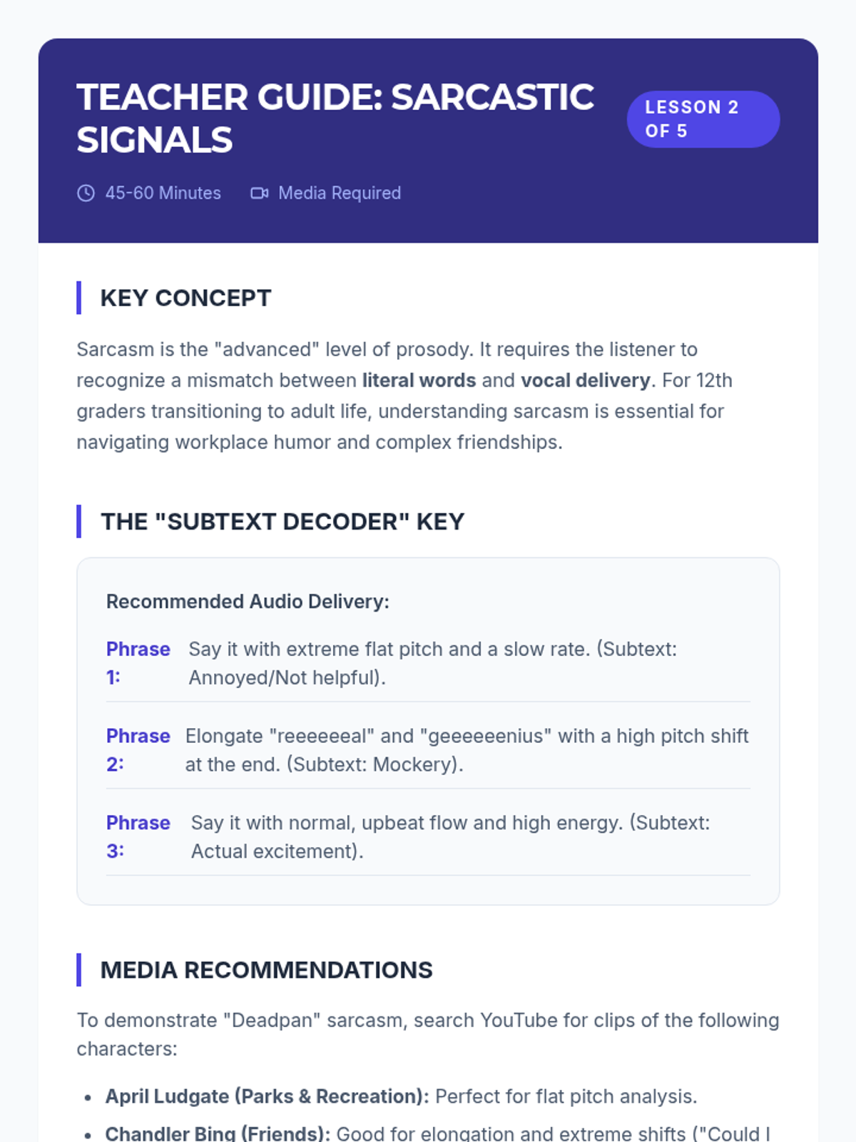 This sequence explores the nuances of social communication for 12th-grade students, focusing on how pitch, volume, and inflection (prosody) shape meaning. Through technical analysis, case studies, and field observations, students learn to detect sarcasm, regulate their own vocal delivery, and repair social misunderstandings in adult contexts.