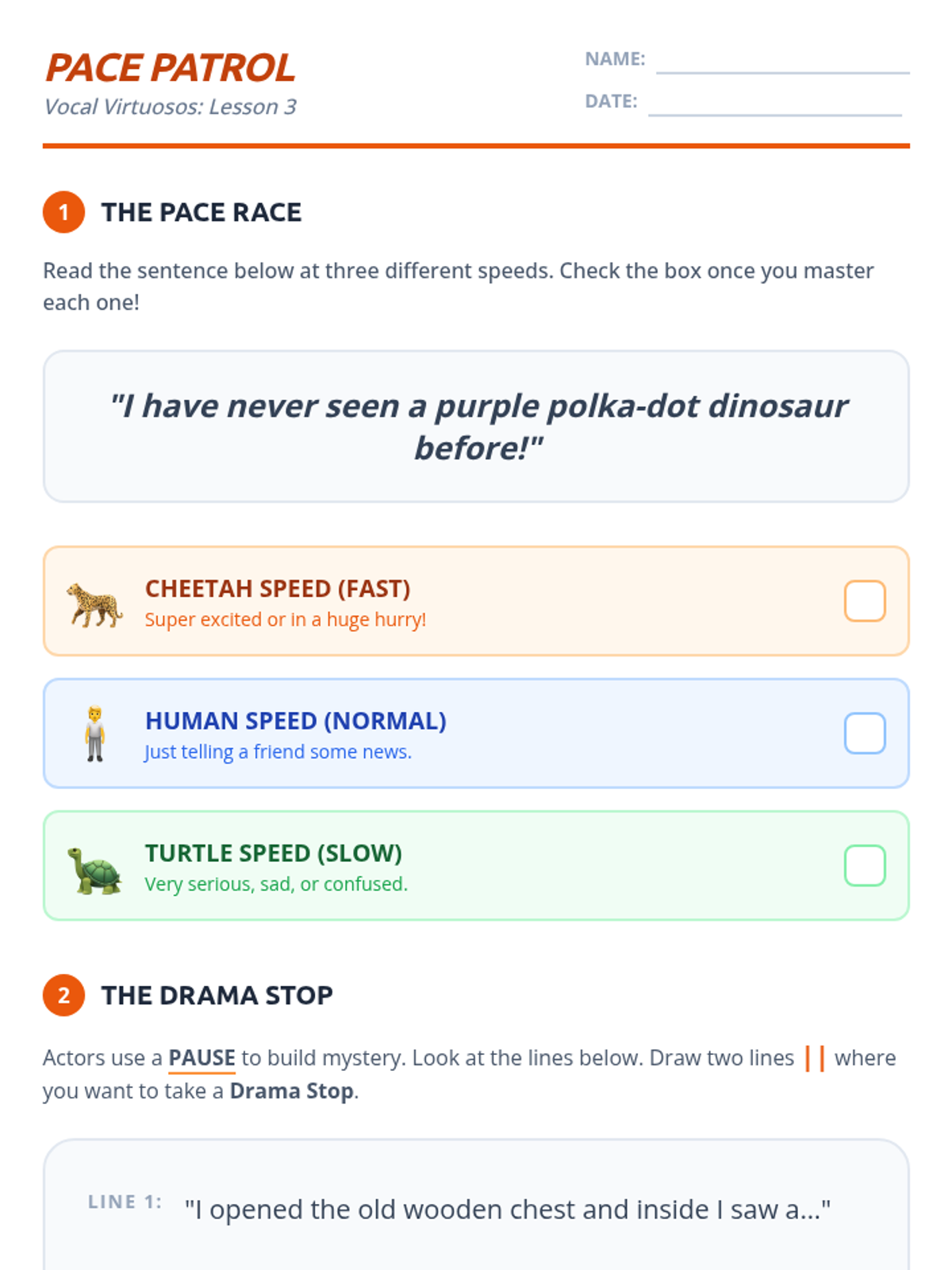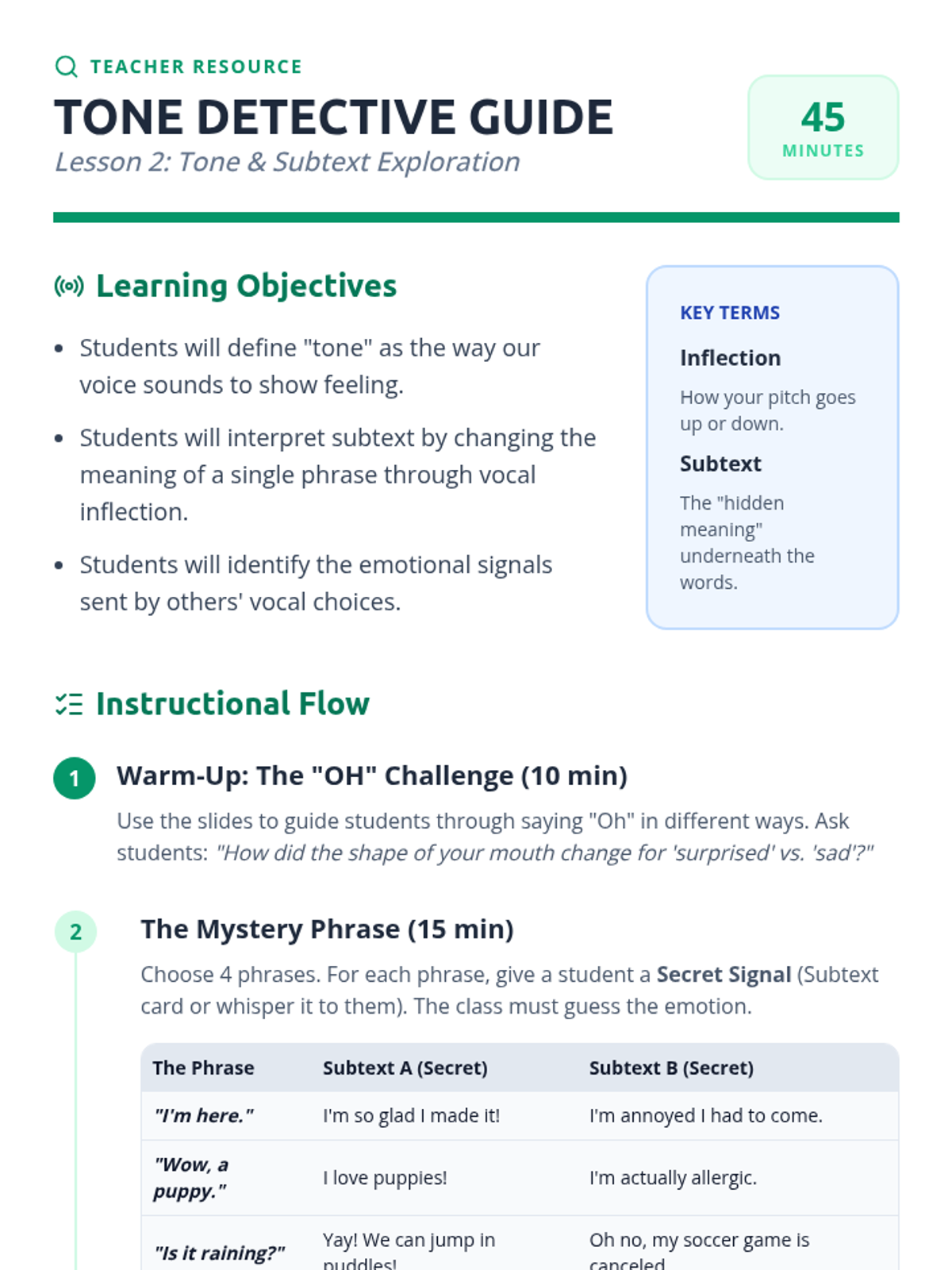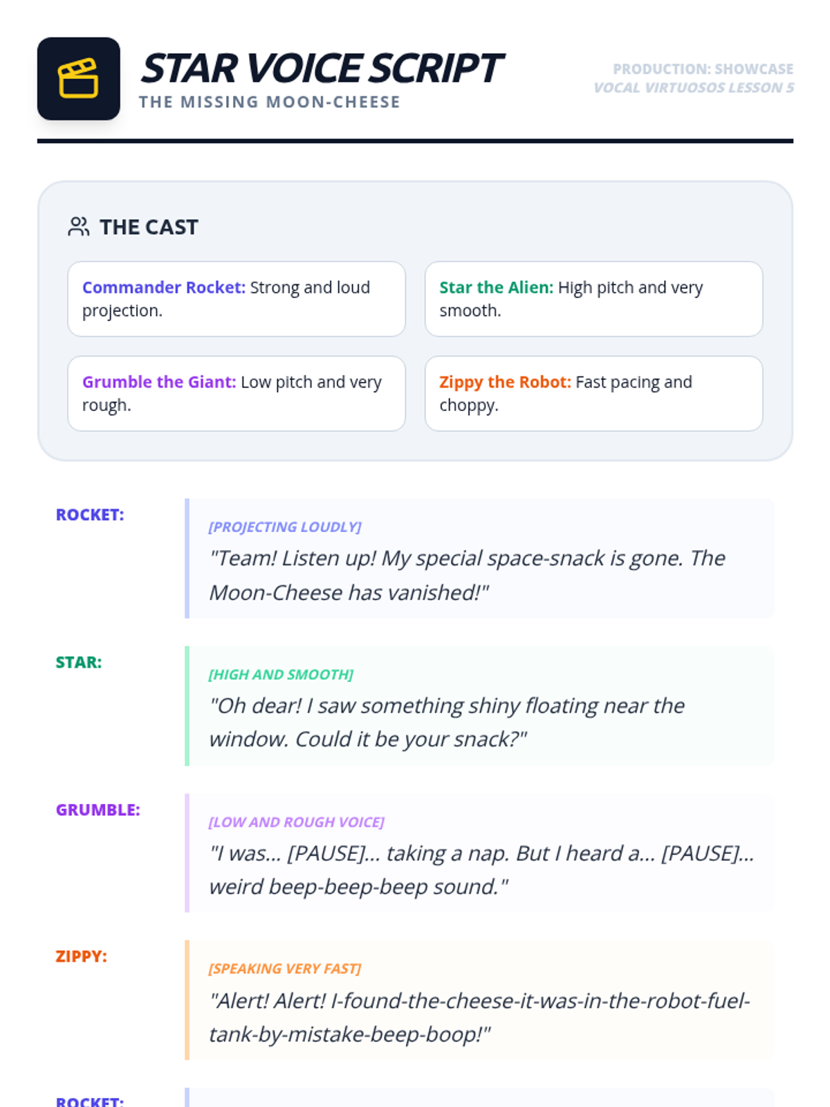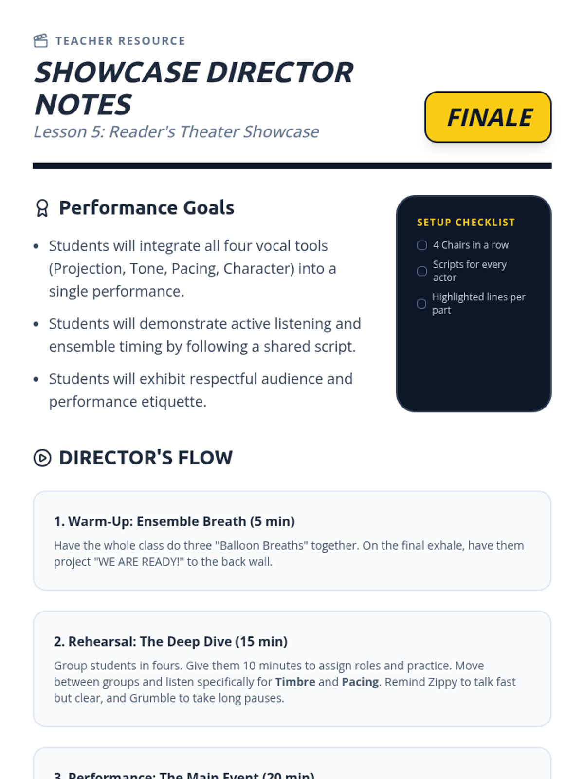 A workshop-style sequence for 2nd graders focusing on vocal projection, tone, pacing, and character voice development, culminating in a Reader's Theater showcase. Students learn to use their voices as instruments to convey meaning and create characters.