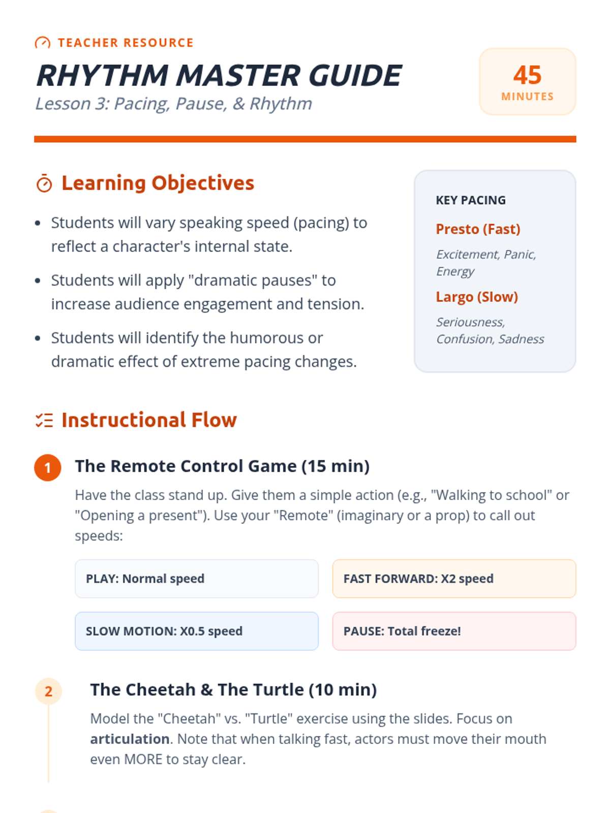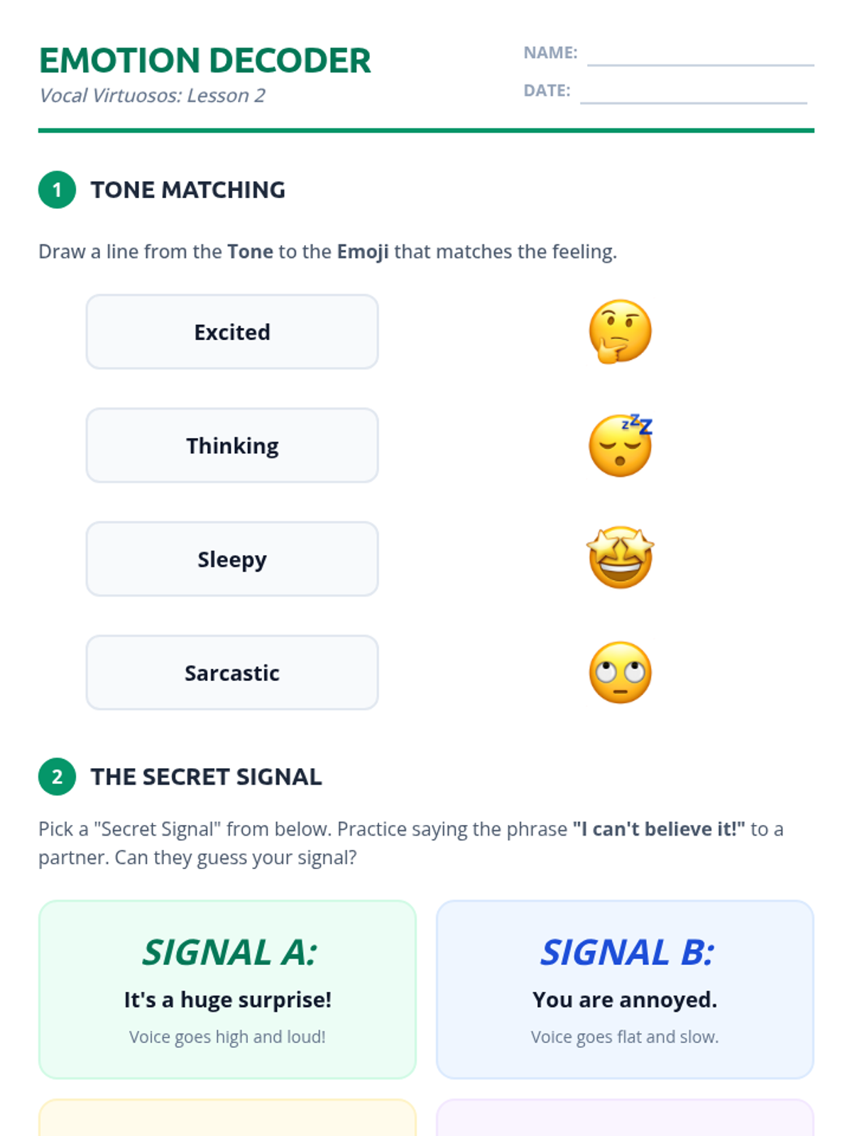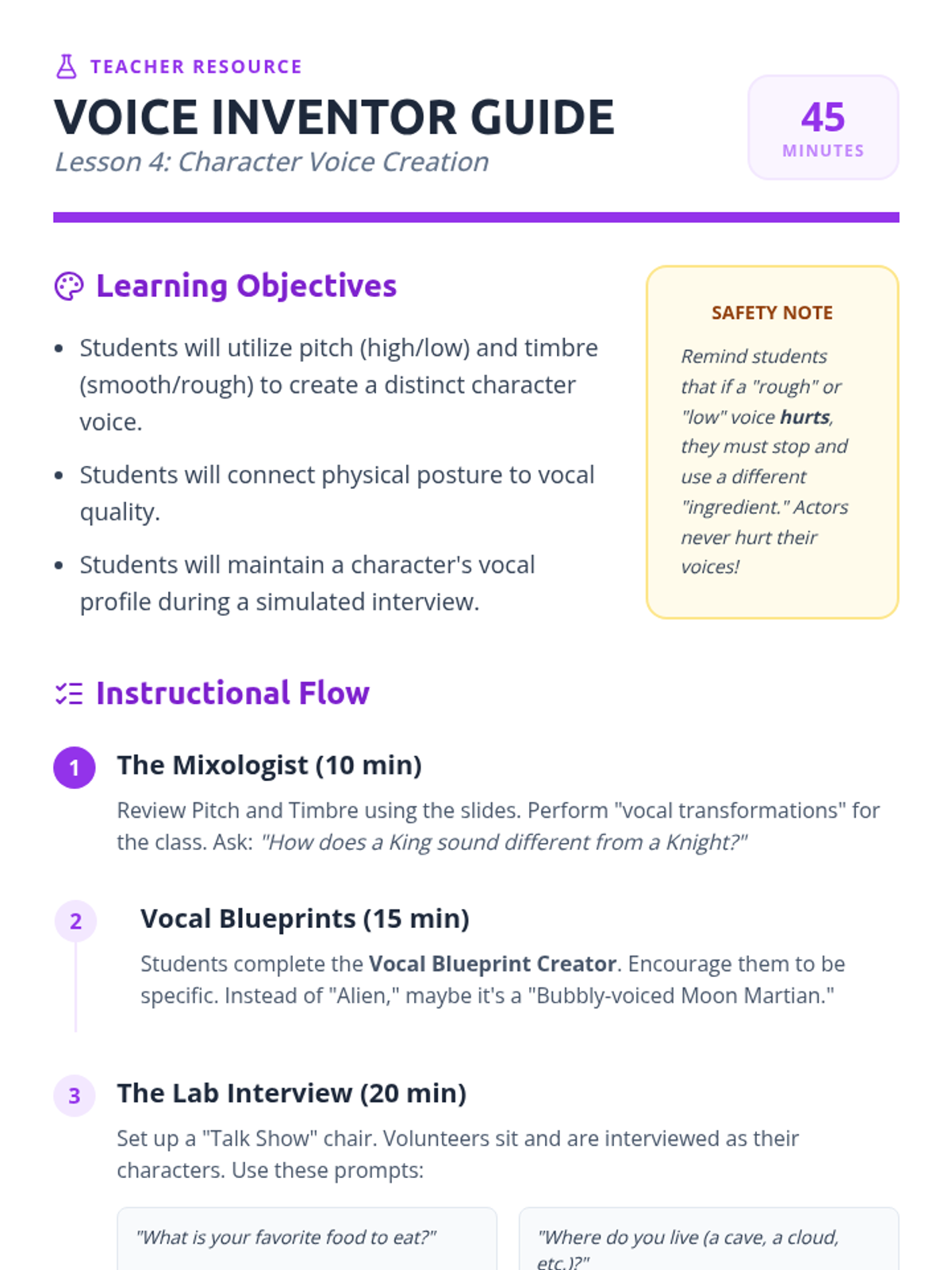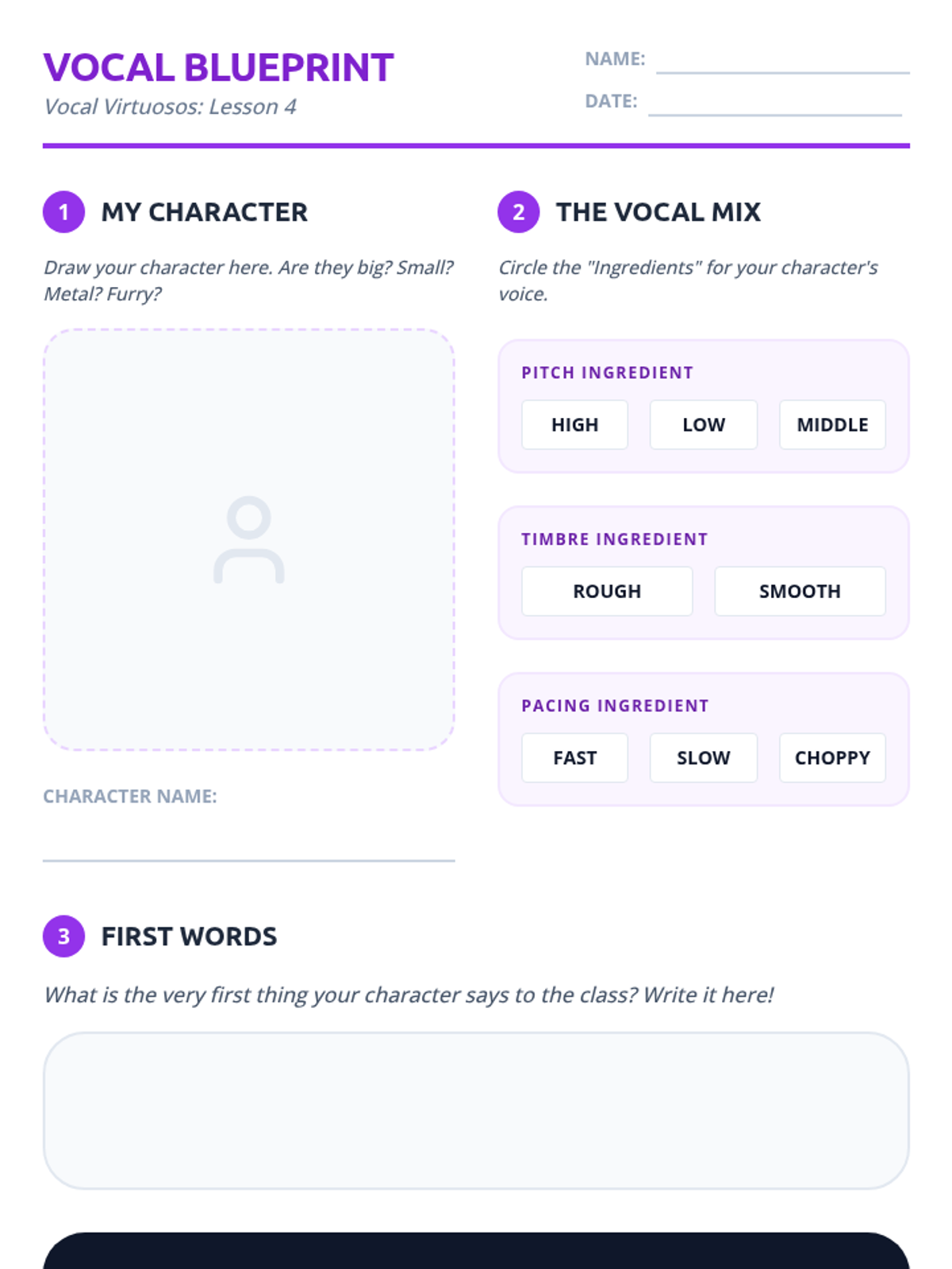 A workshop-style sequence for 2nd graders focusing on vocal projection, tone, pacing, and character voice development, culminating in a Reader's Theater showcase. Students learn to use their voices as instruments to convey meaning and create characters.