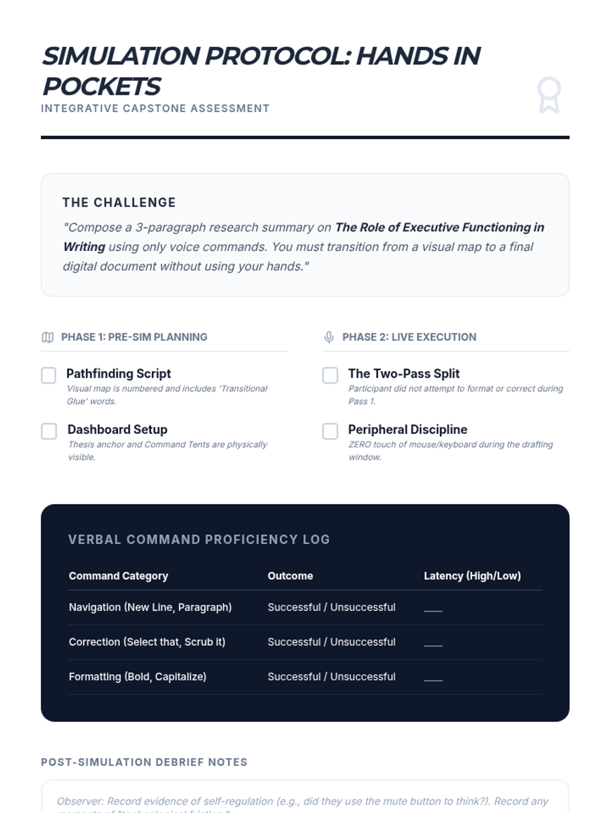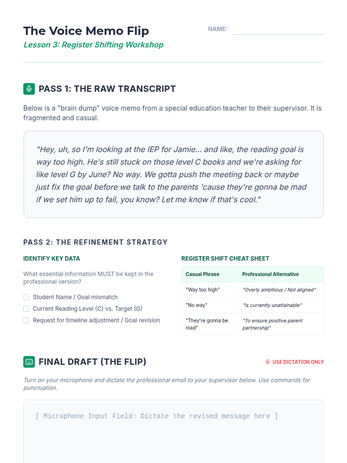 This sequence explores the executive functioning challenges of voice-based composition for students with disabilities. Graduate students will learn to move beyond teaching 'how to dictate' and instead focus on 'how to think' for dictation, covering pre-writing, cognitive cueing, and workflow integration.