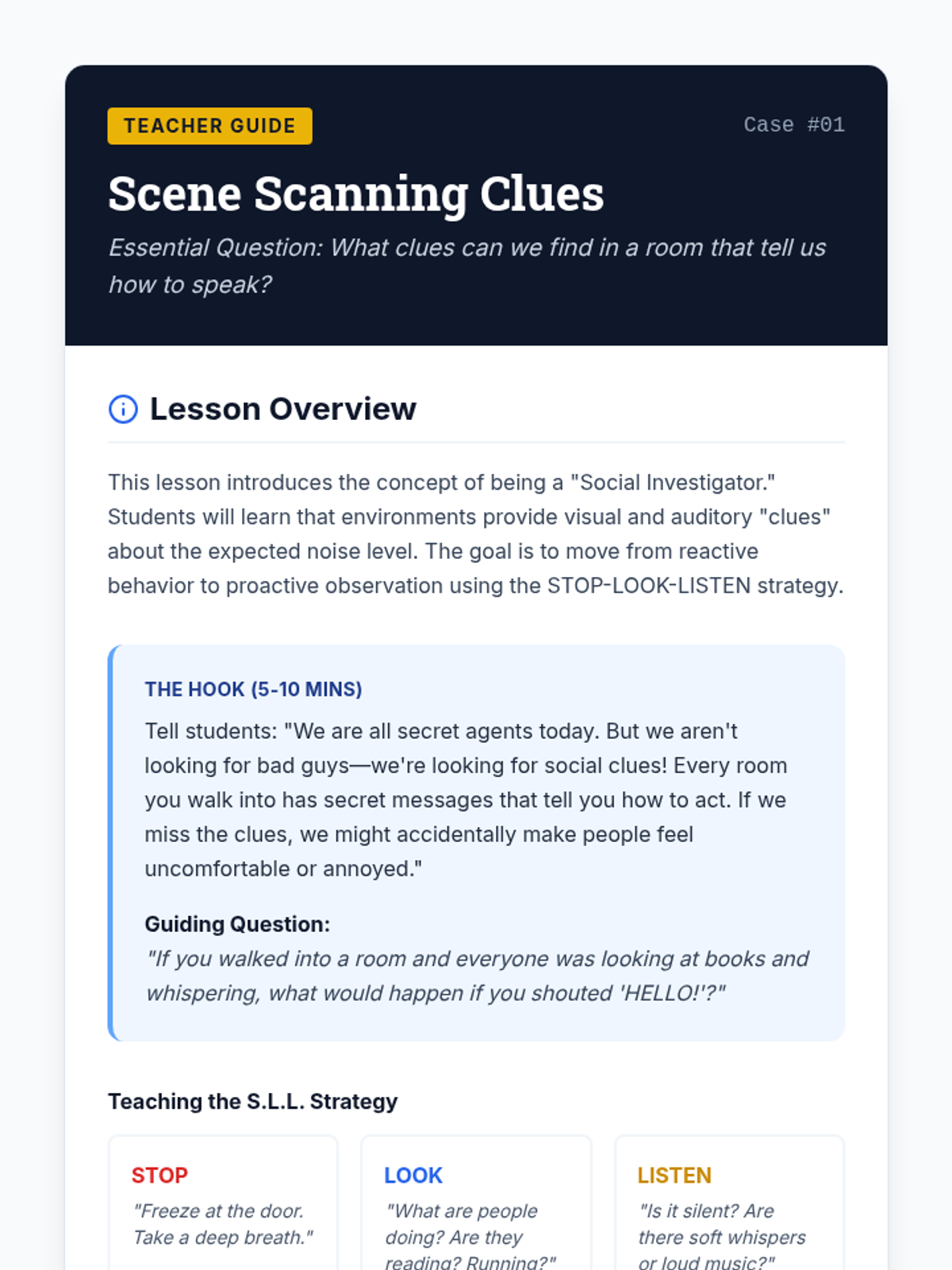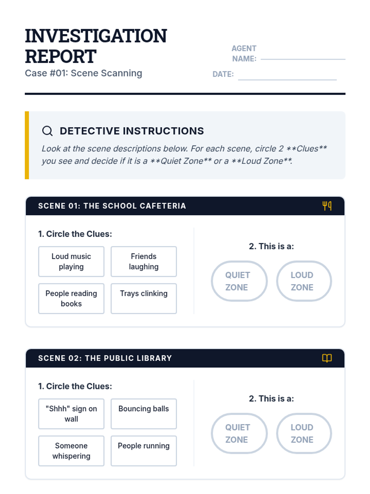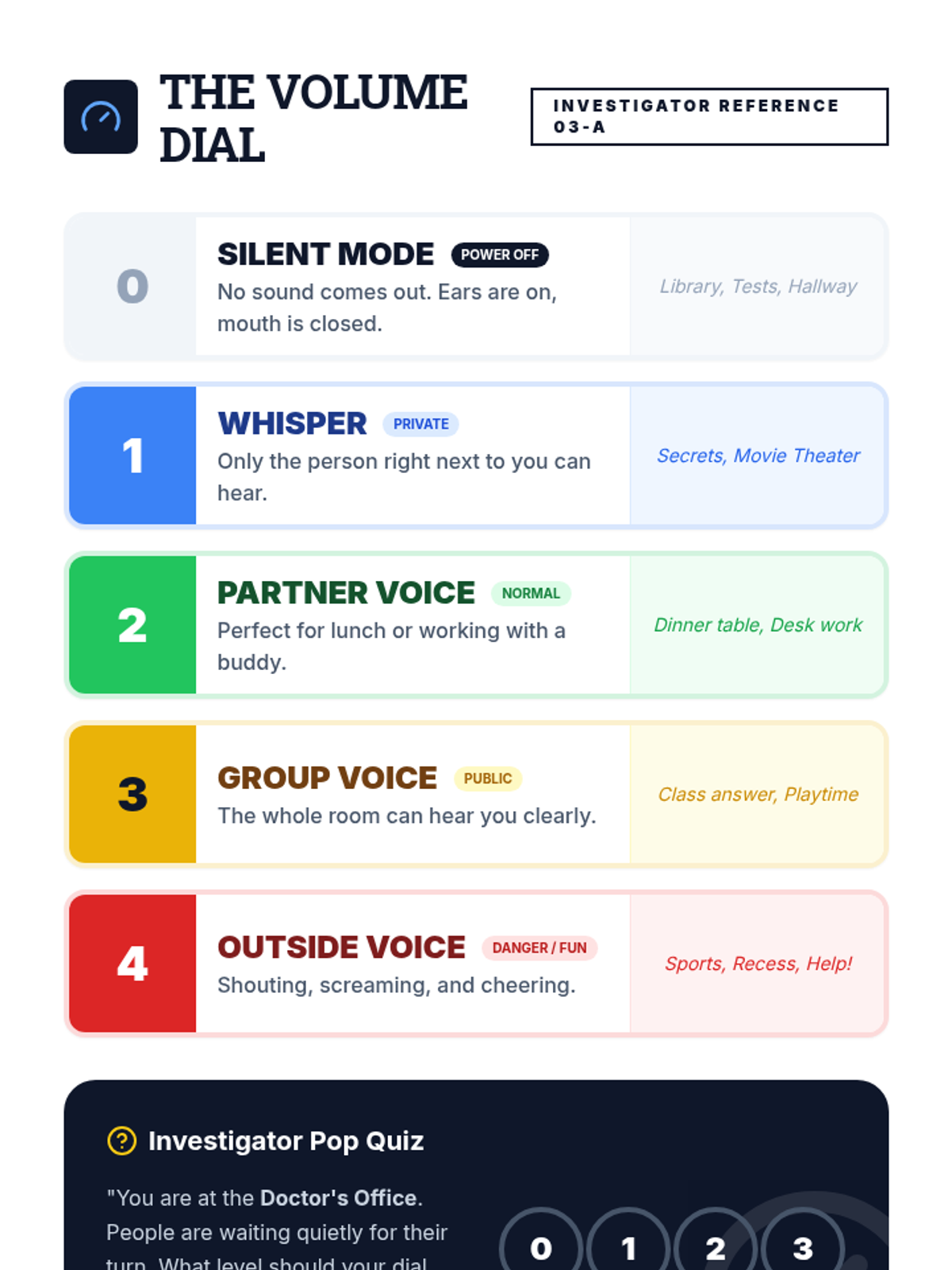 This sequence uses a detective theme to help 3rd-grade students with social communication challenges master vocal volume and tone. By treating students as 'Social Investigators,' the lessons move from environmental observation to empathetic reflection and practical application across different settings.