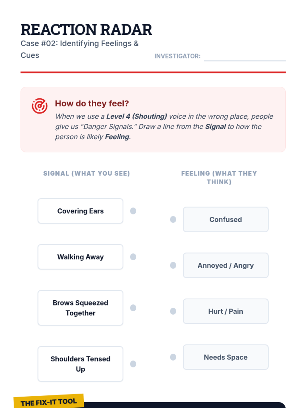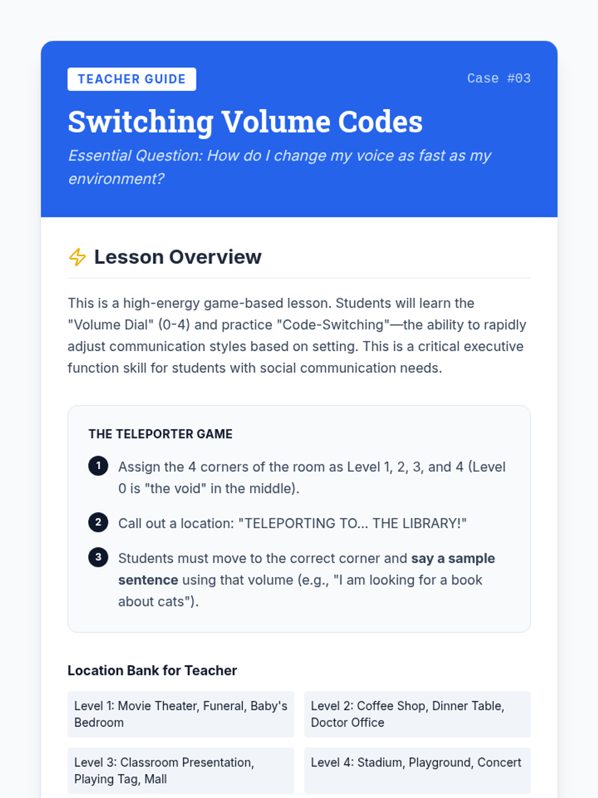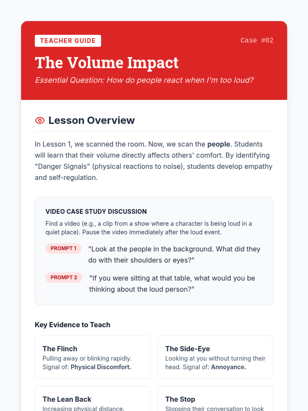 This sequence uses a detective theme to help 3rd-grade students with social communication challenges master vocal volume and tone. By treating students as 'Social Investigators,' the lessons move from environmental observation to empathetic reflection and practical application across different settings.
