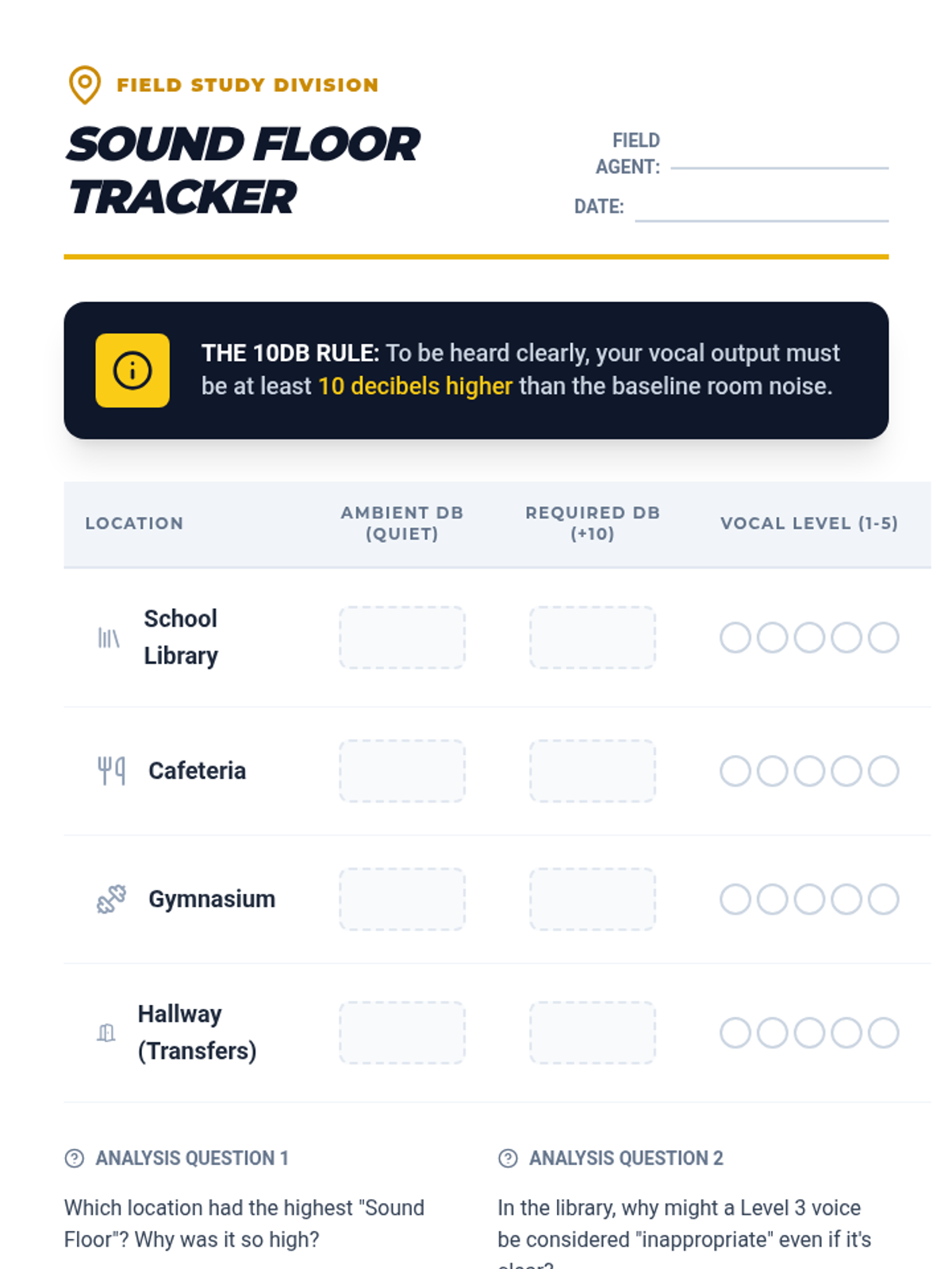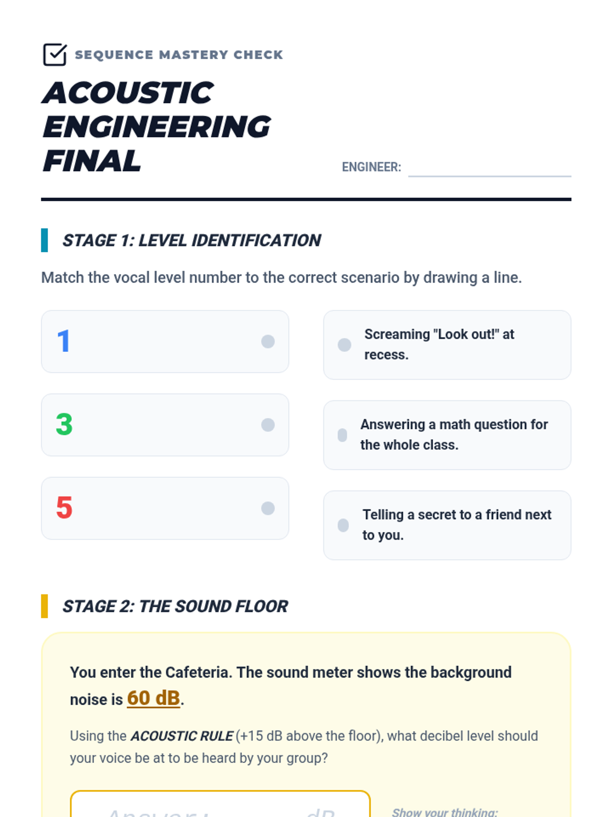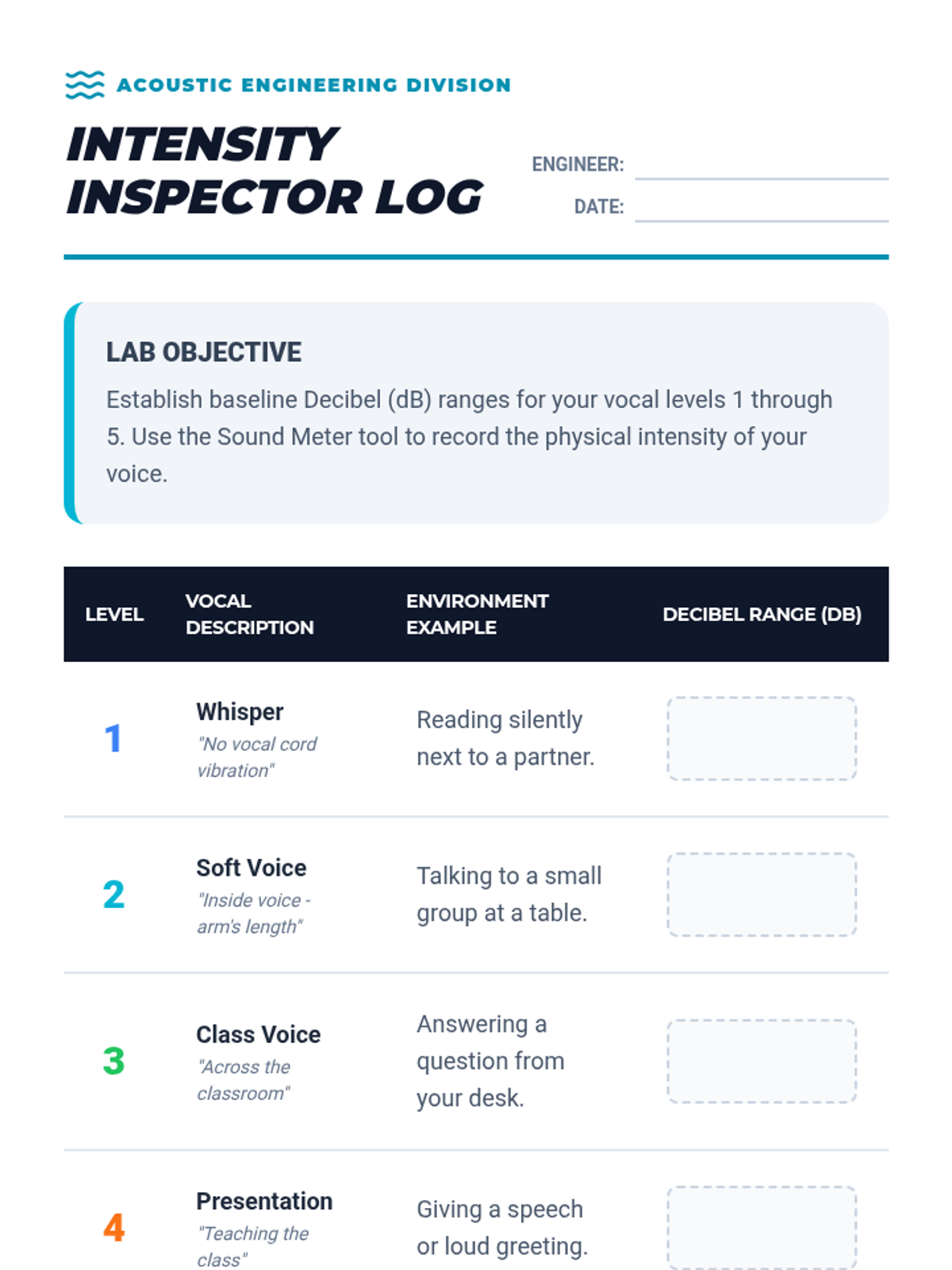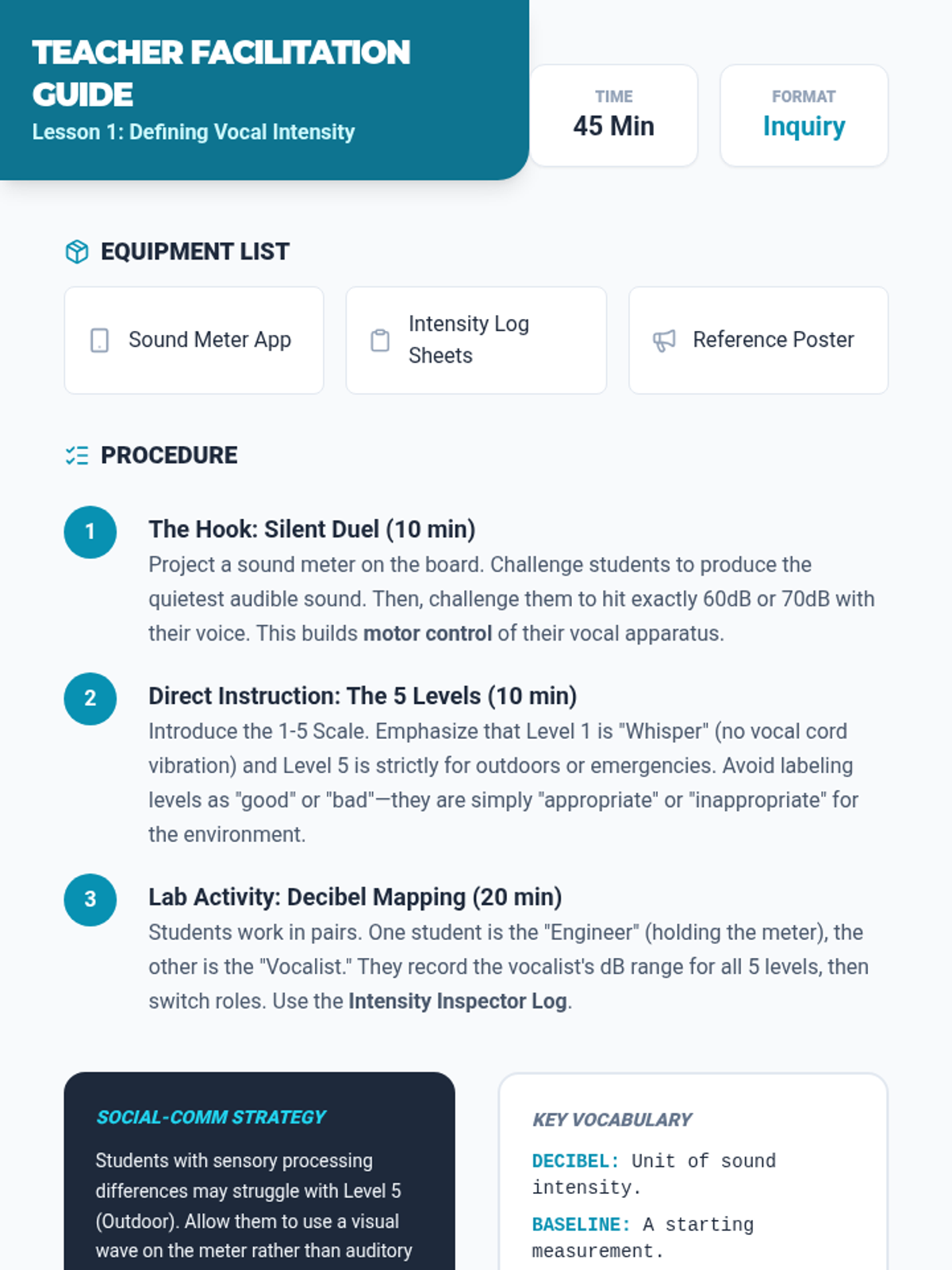 A 5-lesson sequence for 5th grade social communication, focusing on understanding and regulating vocal volume through a scientific, inquiry-based approach. Students explore volume as a measurable property, analyze environmental noise, and develop personal self-regulation strategies.