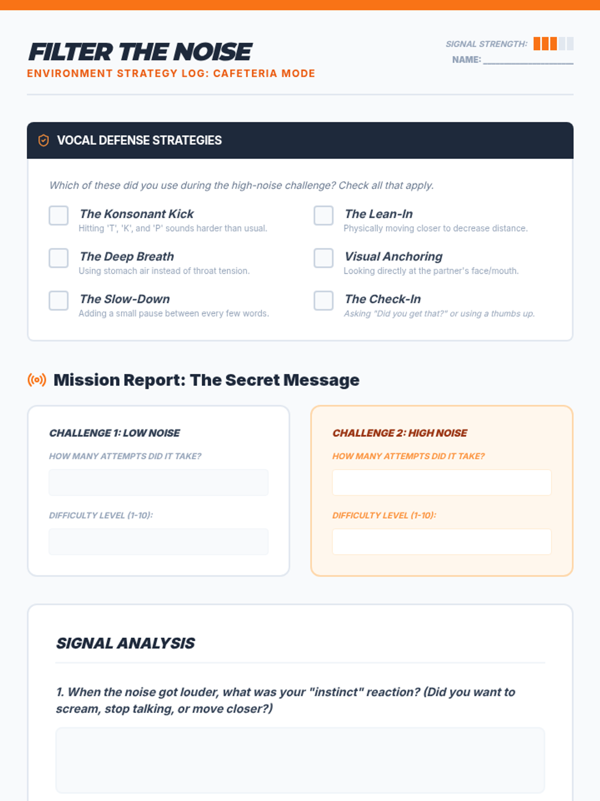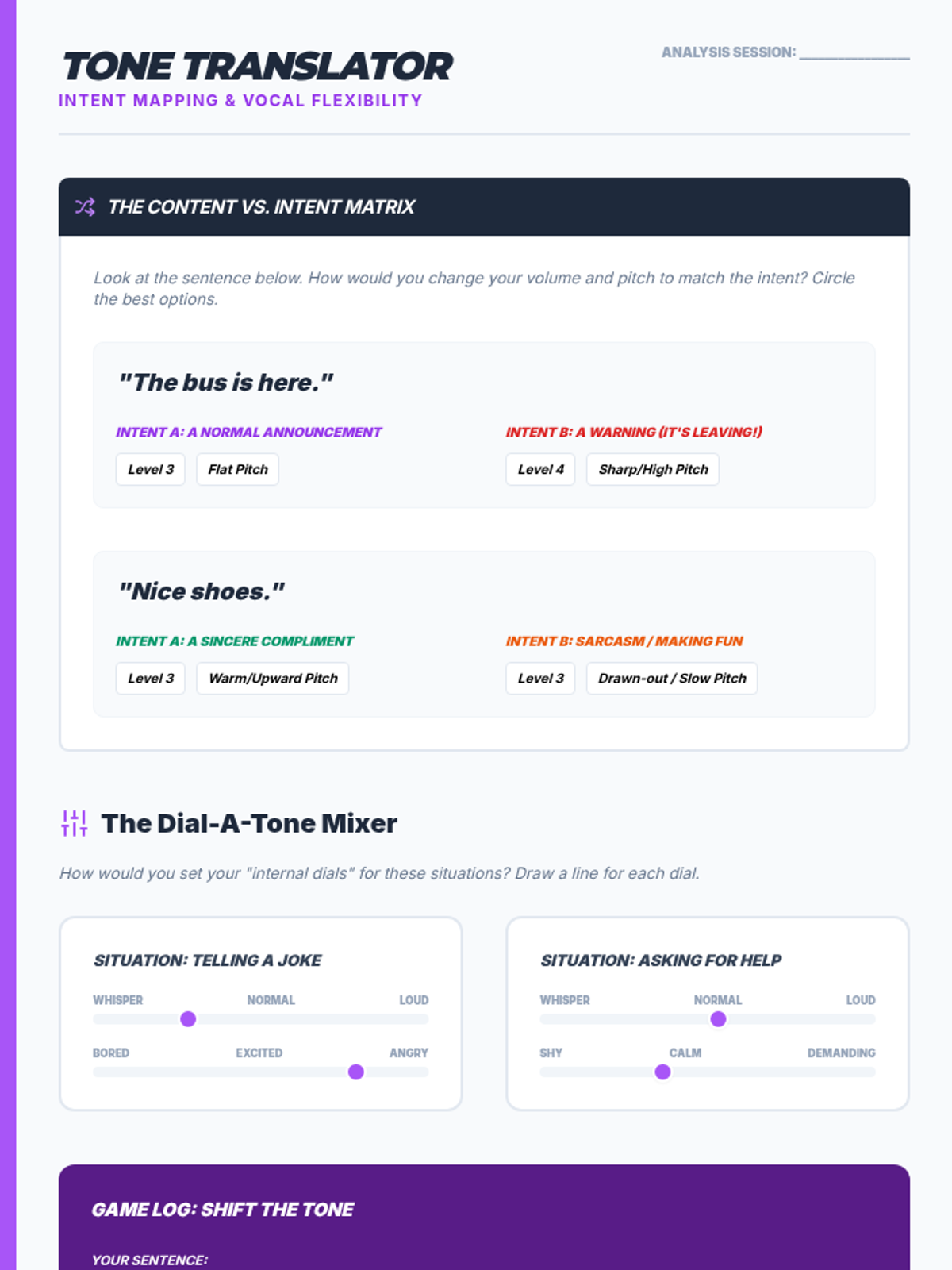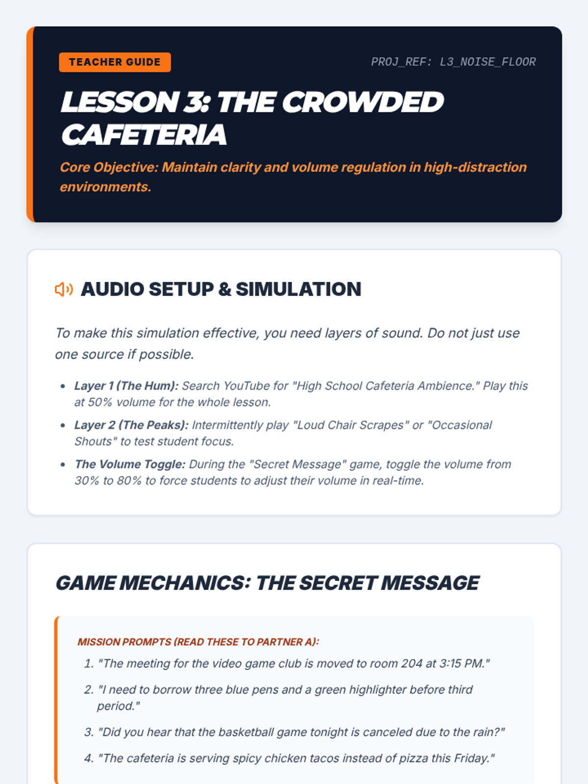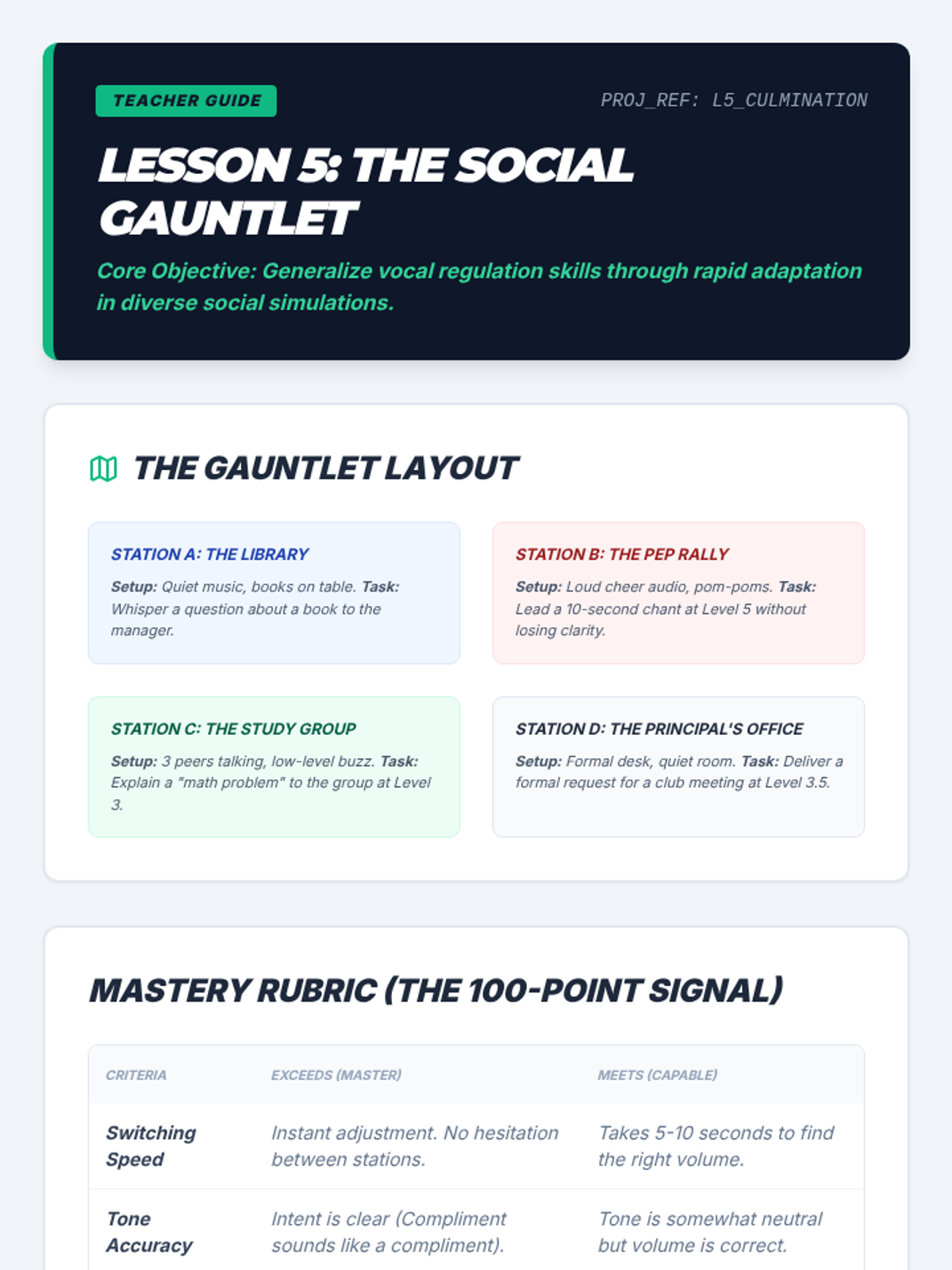 A 5-lesson sequence for 9th-grade students focusing on social communication through the lens of volume and tone regulation. Students will move from basic calibration of their 'internal volume knob' to high-stakes social and vocational simulations requiring rapid adaptation.