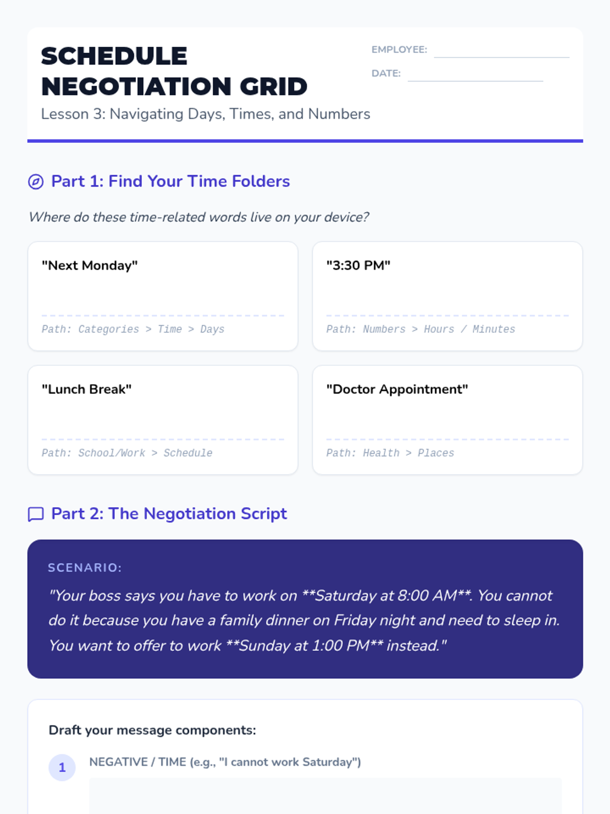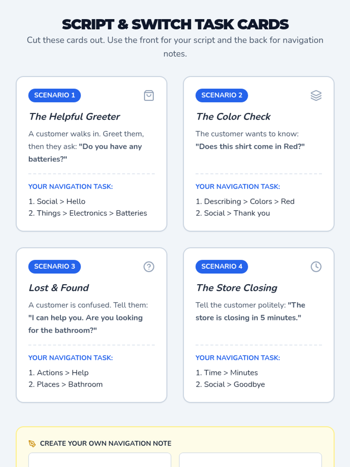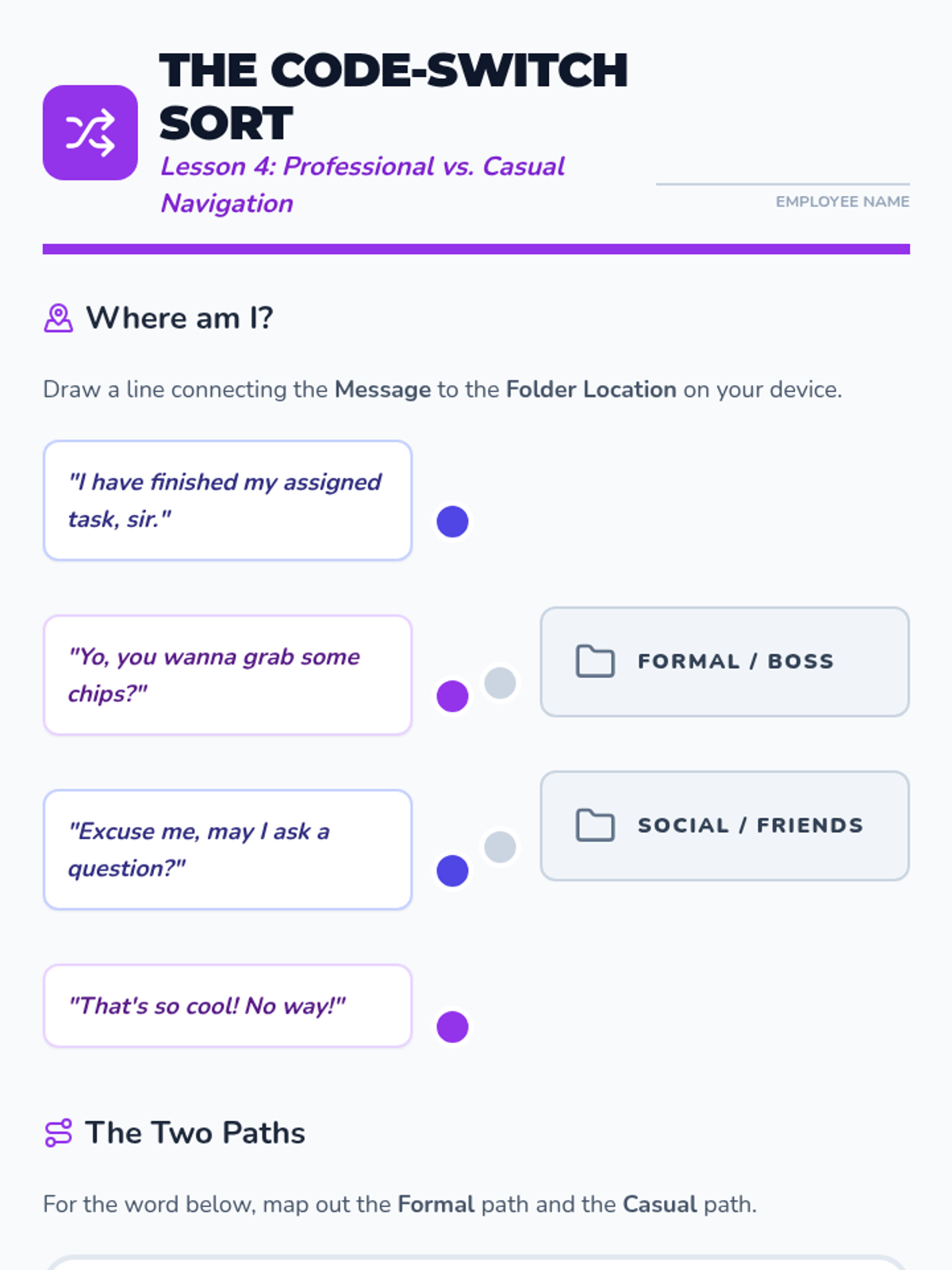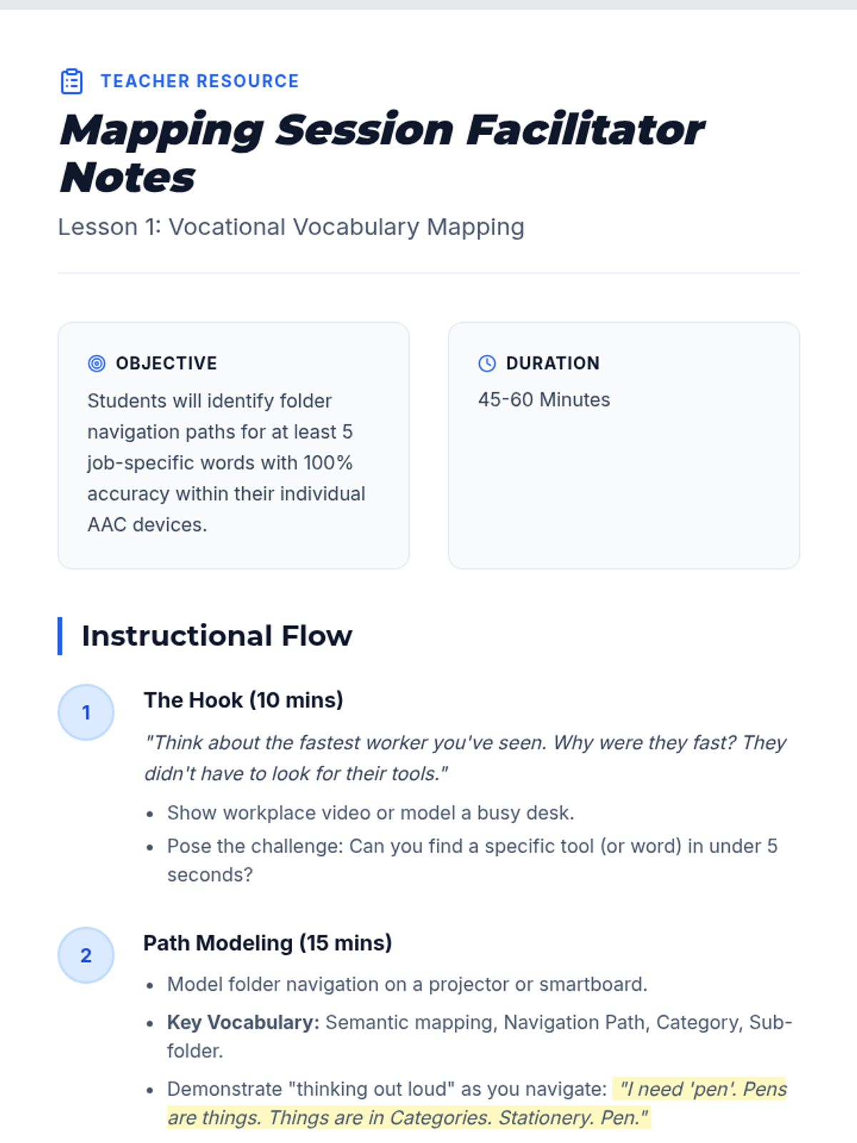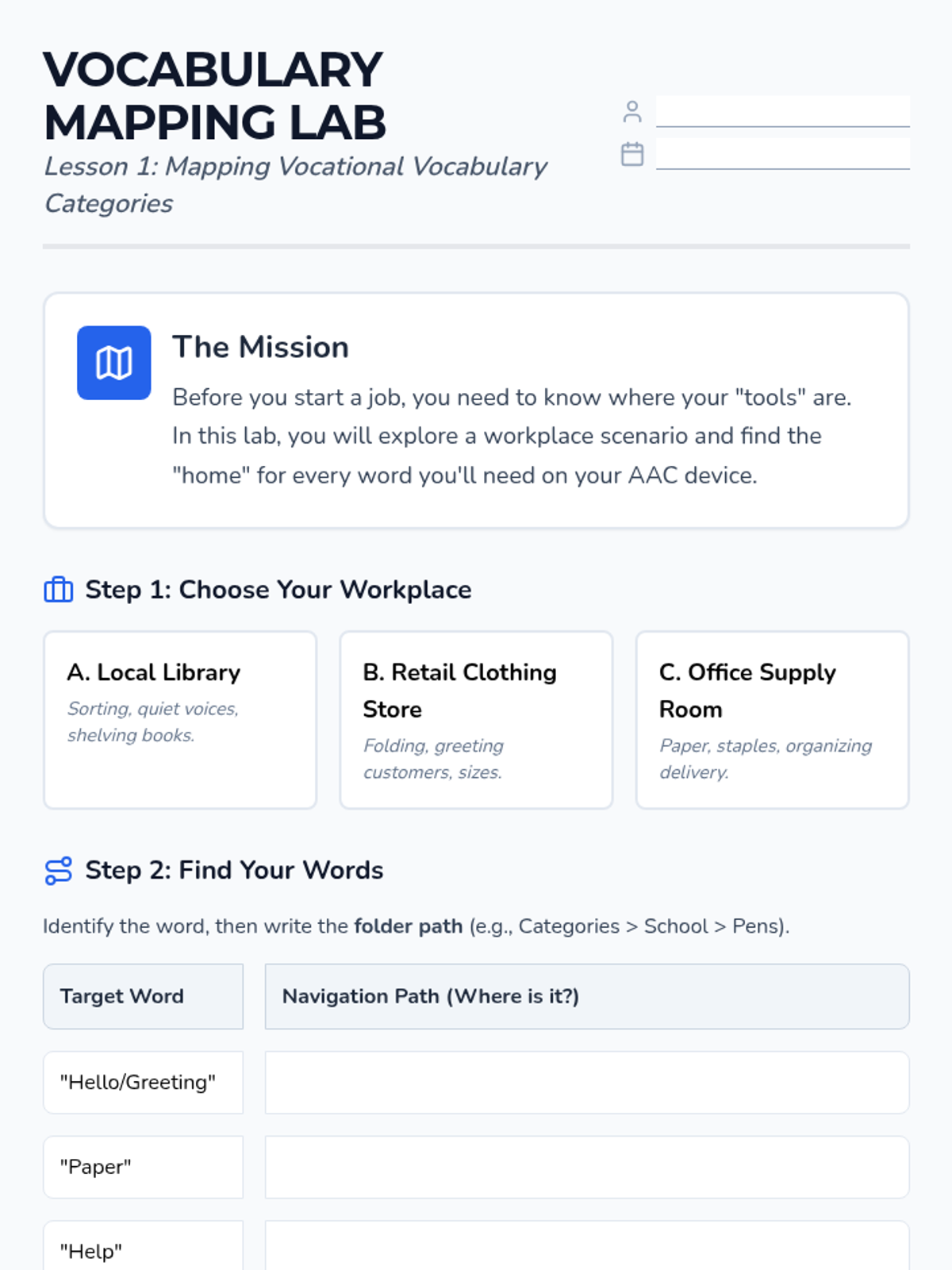 This sequence prepares 12th-grade transition students to navigate their AAC devices efficiently within workplace environments. It focuses on semantic mapping, rapid switching between social and functional folders, and context-dependent communication strategies.
