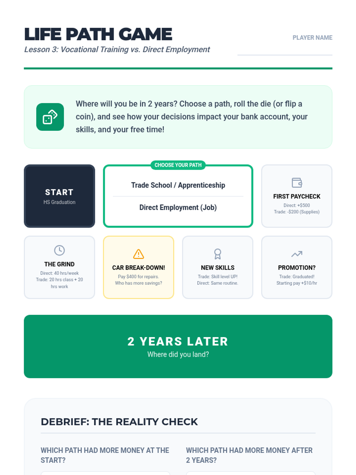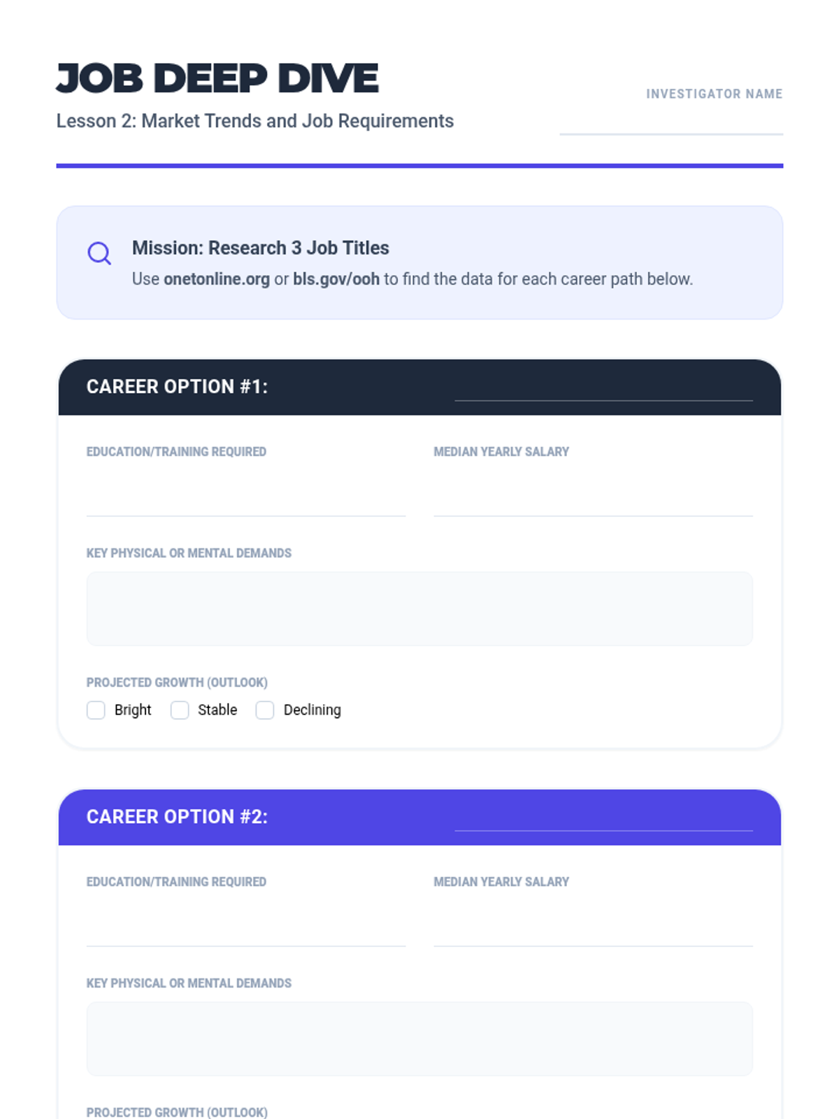 A career-readiness sequence designed for older students and undergraduates to identify their current skills, potential growth areas, and personality types using the Ikigai and Quadrant of Success models. Students move from auditing their time to creating a strategic roadmap for professional development.