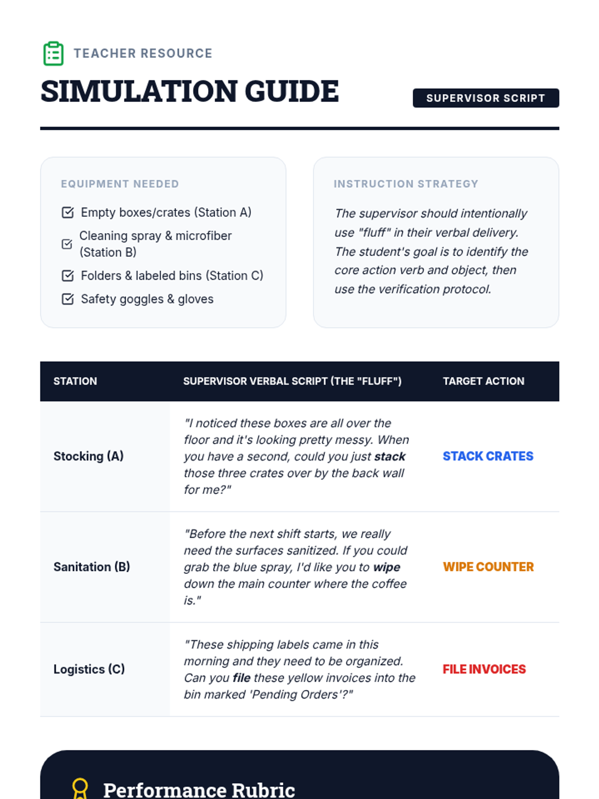This sequence focuses on teaching 12th-grade students with working memory needs how to isolate, rehearse, and verify single-step verbal and visual instructions in a vocational setting. Through simulations and skill-building activities, students learn to filter extraneous information and prioritize safety and accuracy over speed.