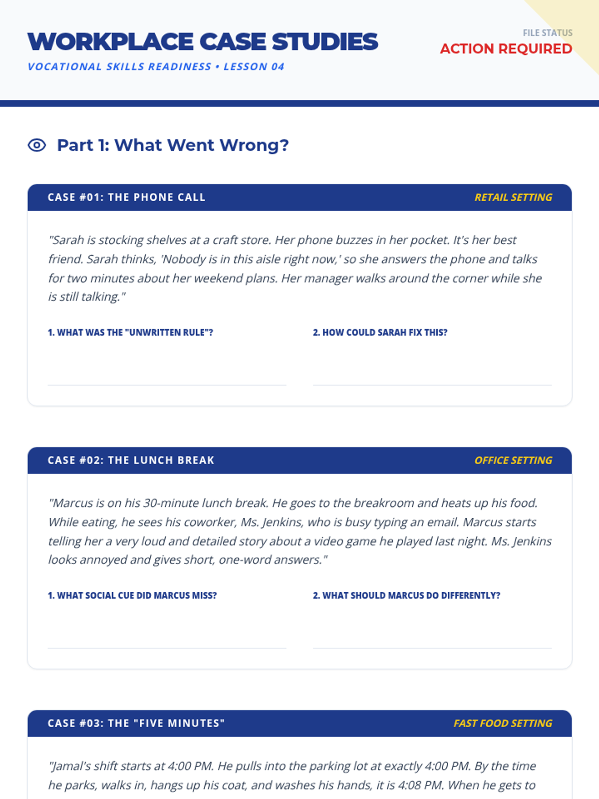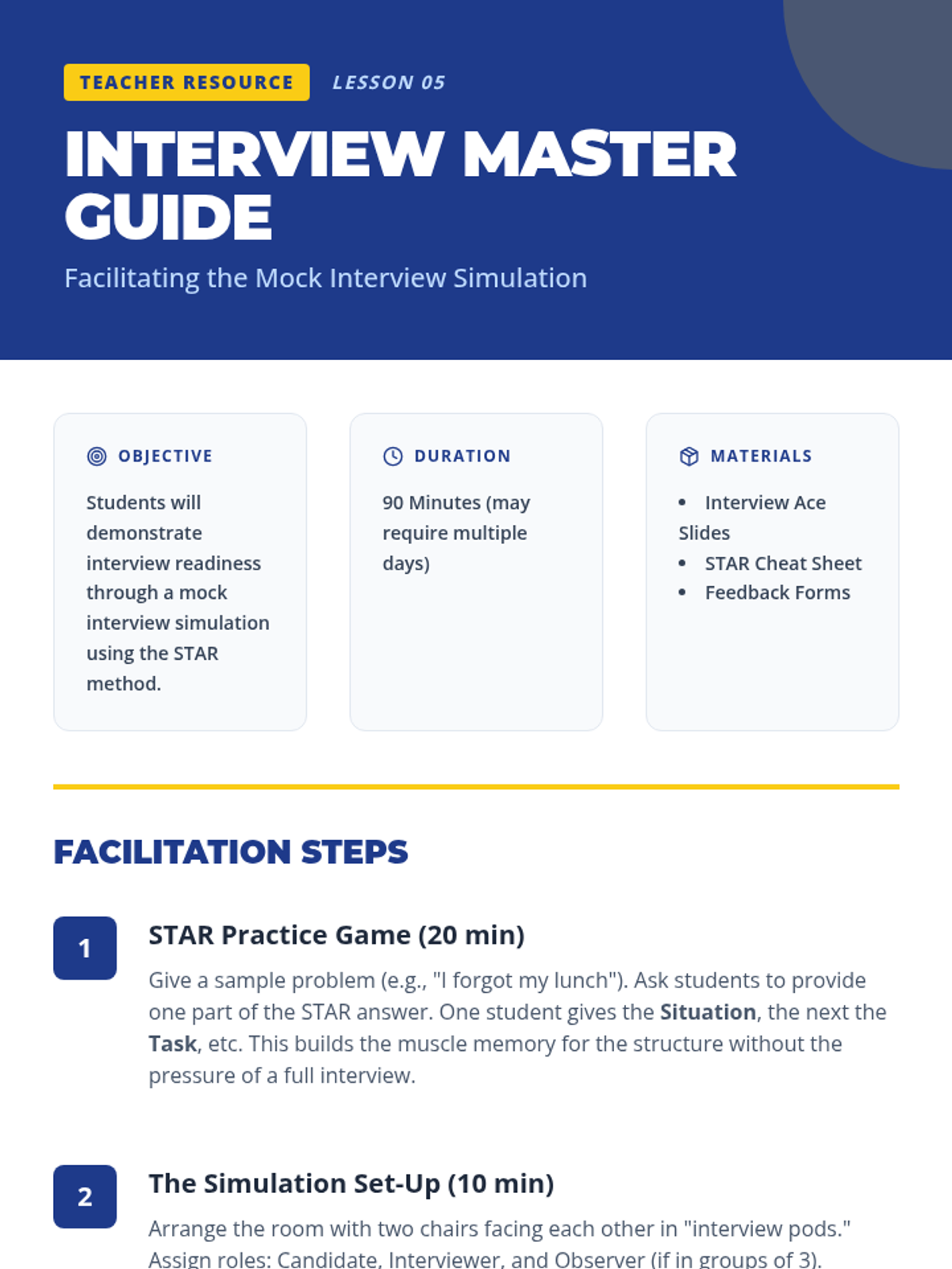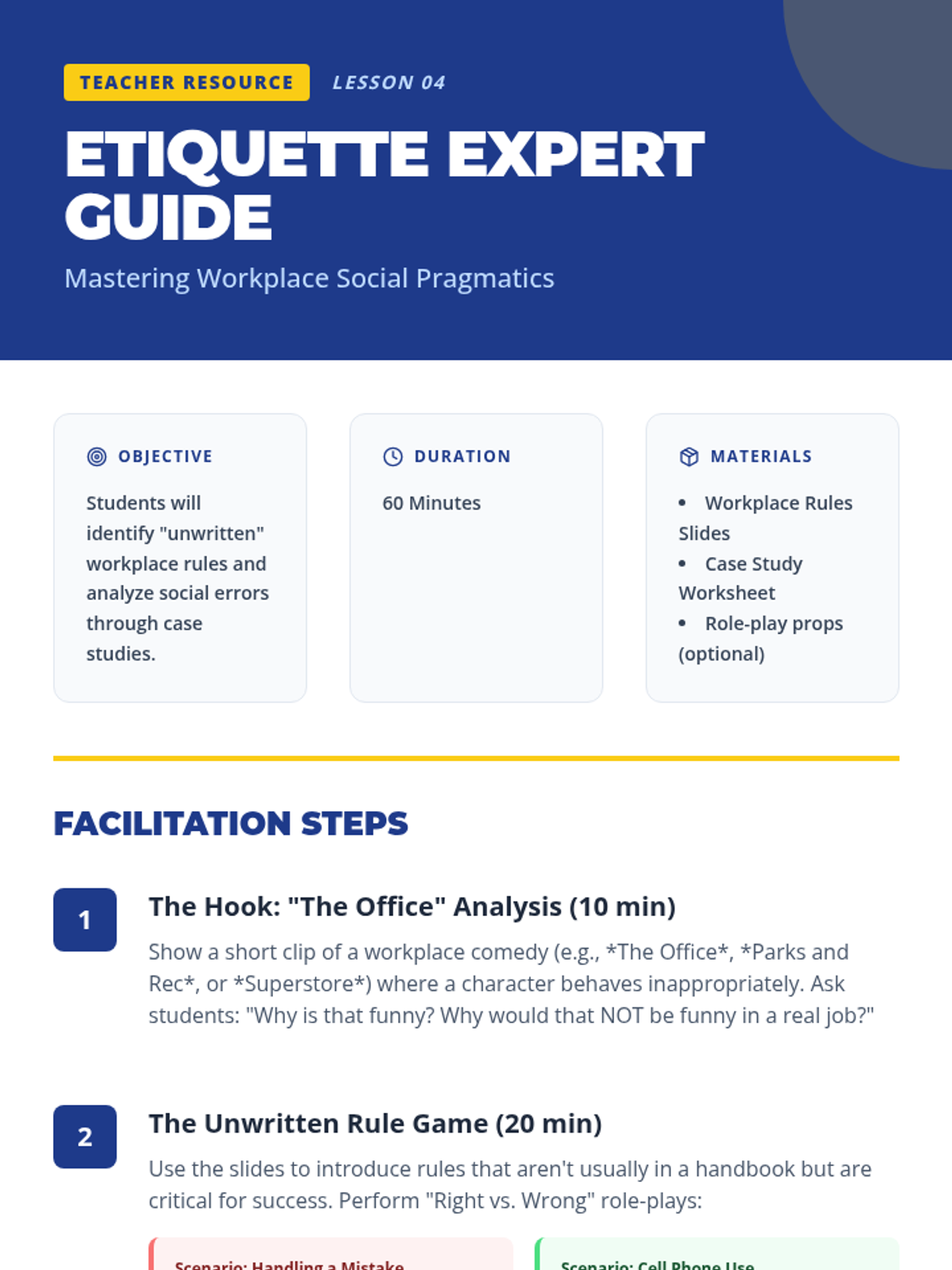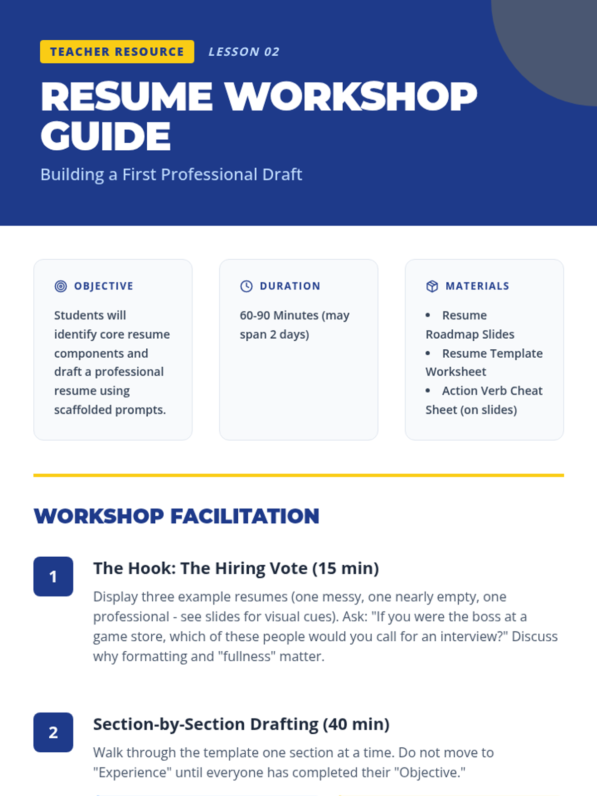 A comprehensive sequence designed for 10th-grade Special Education students to build vocational readiness. It covers identifying soft skills, crafting resumes, completing applications, mastering workplace etiquette, and practicing mock interviews to prepare students for the transition to employment.