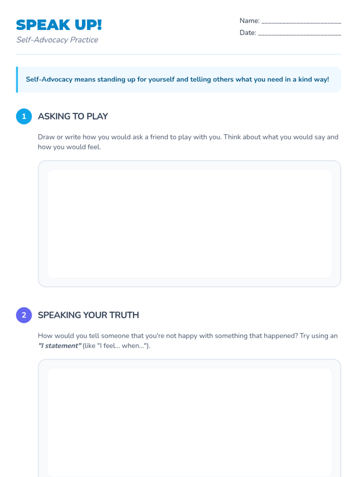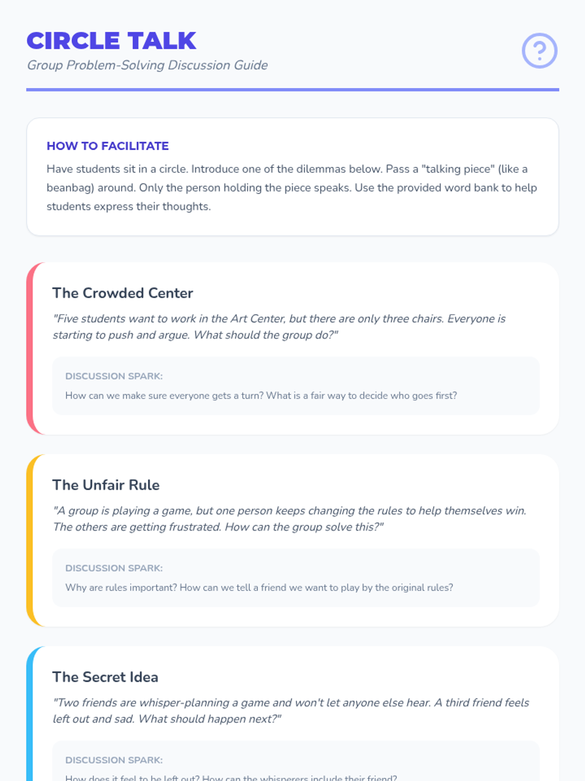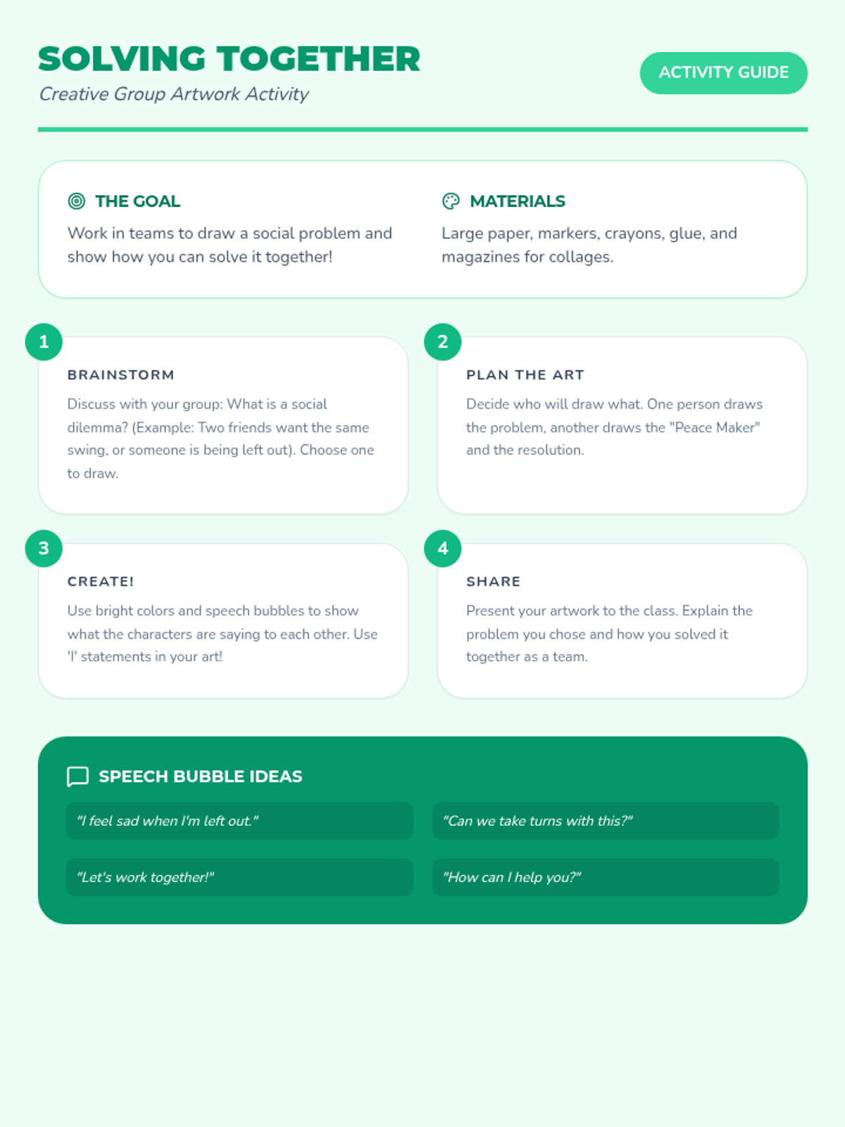 A series of seven 25-minute lessons for 2nd graders focused on self-advocacy, emotional regulation, conflict resolution, and collaborative problem-solving. Students develop social-emotional skills through stories, role-playing, and creative group projects.