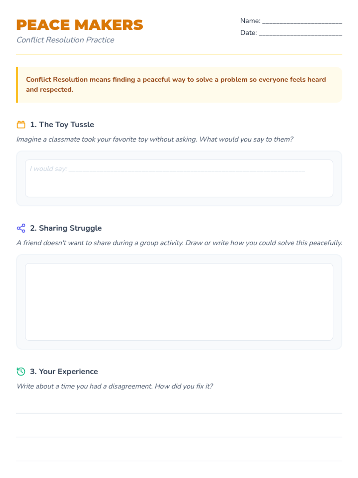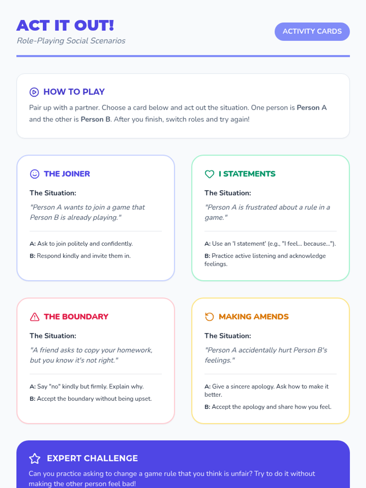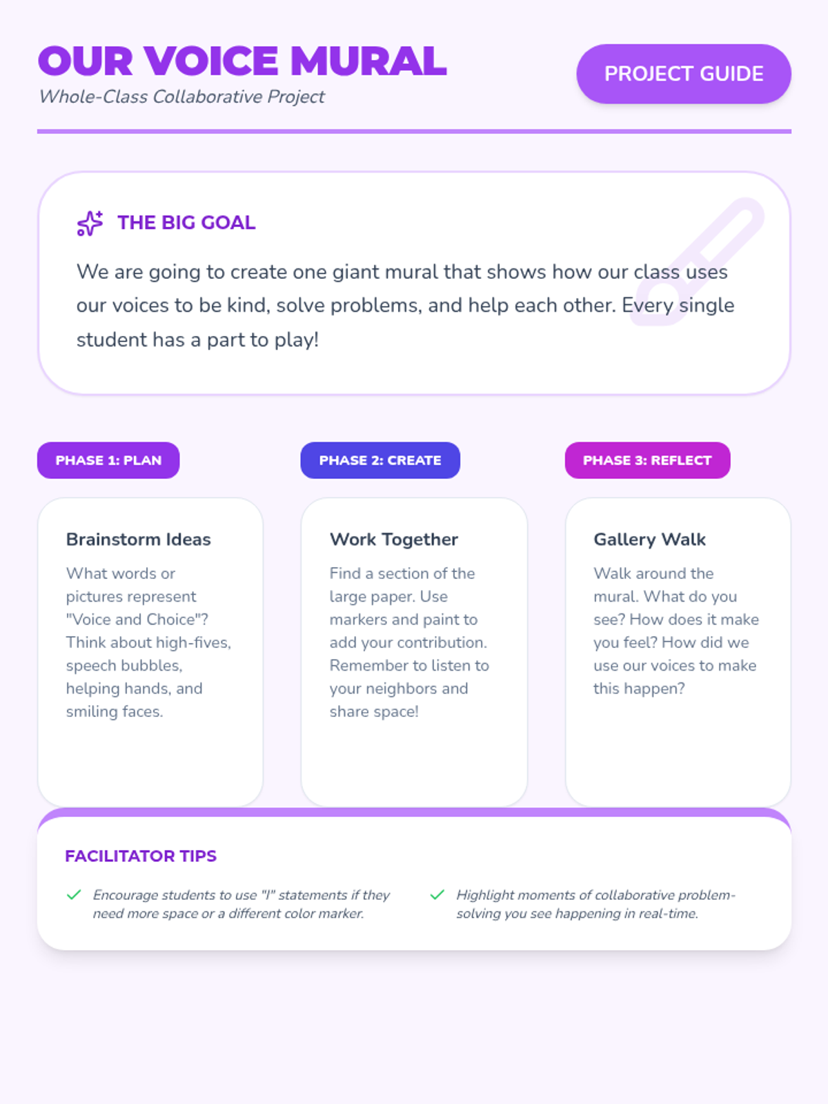 A series of seven 25-minute lessons for 2nd graders focused on self-advocacy, emotional regulation, conflict resolution, and collaborative problem-solving. Students develop social-emotional skills through stories, role-playing, and creative group projects.