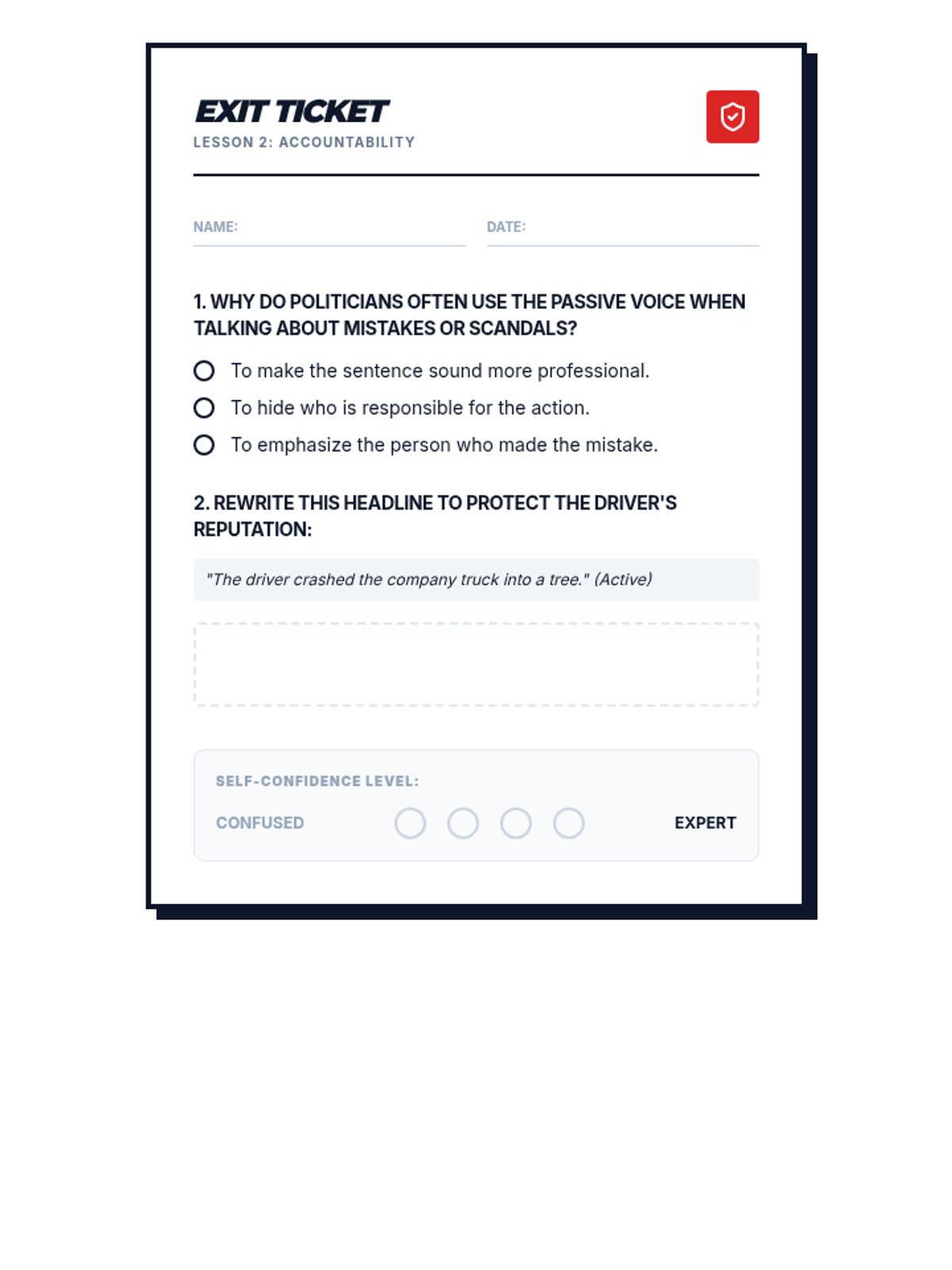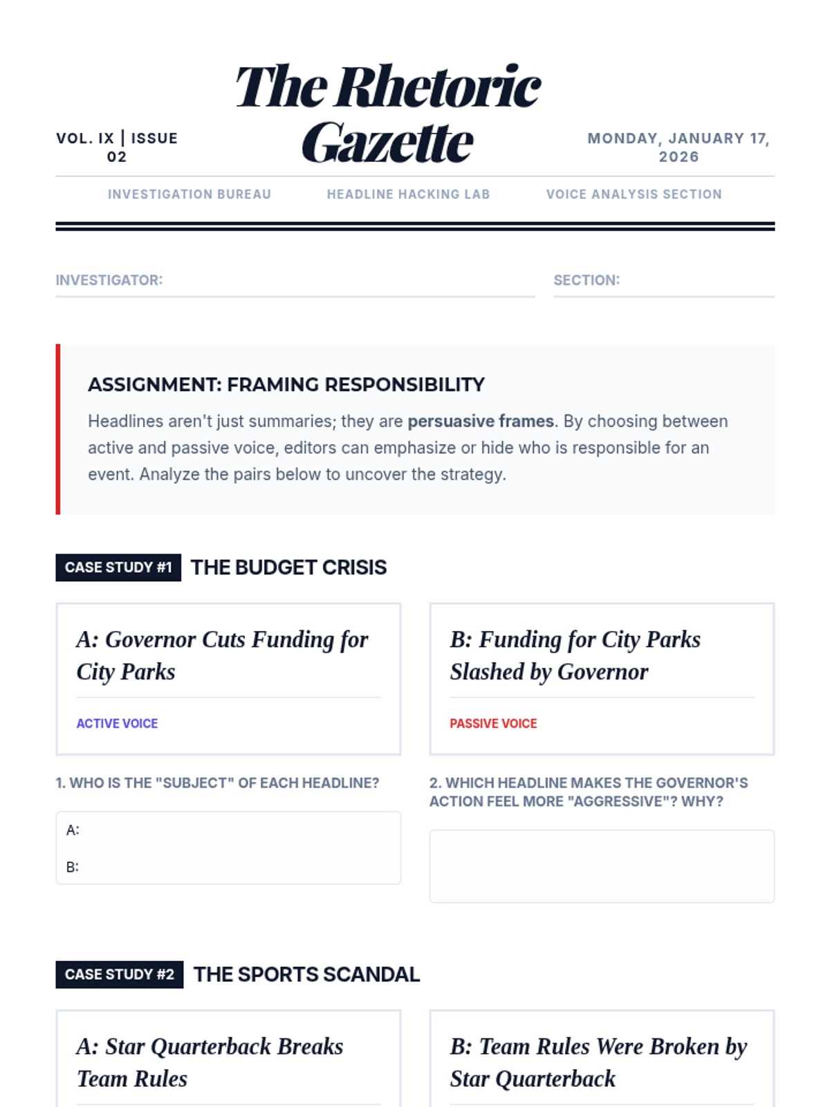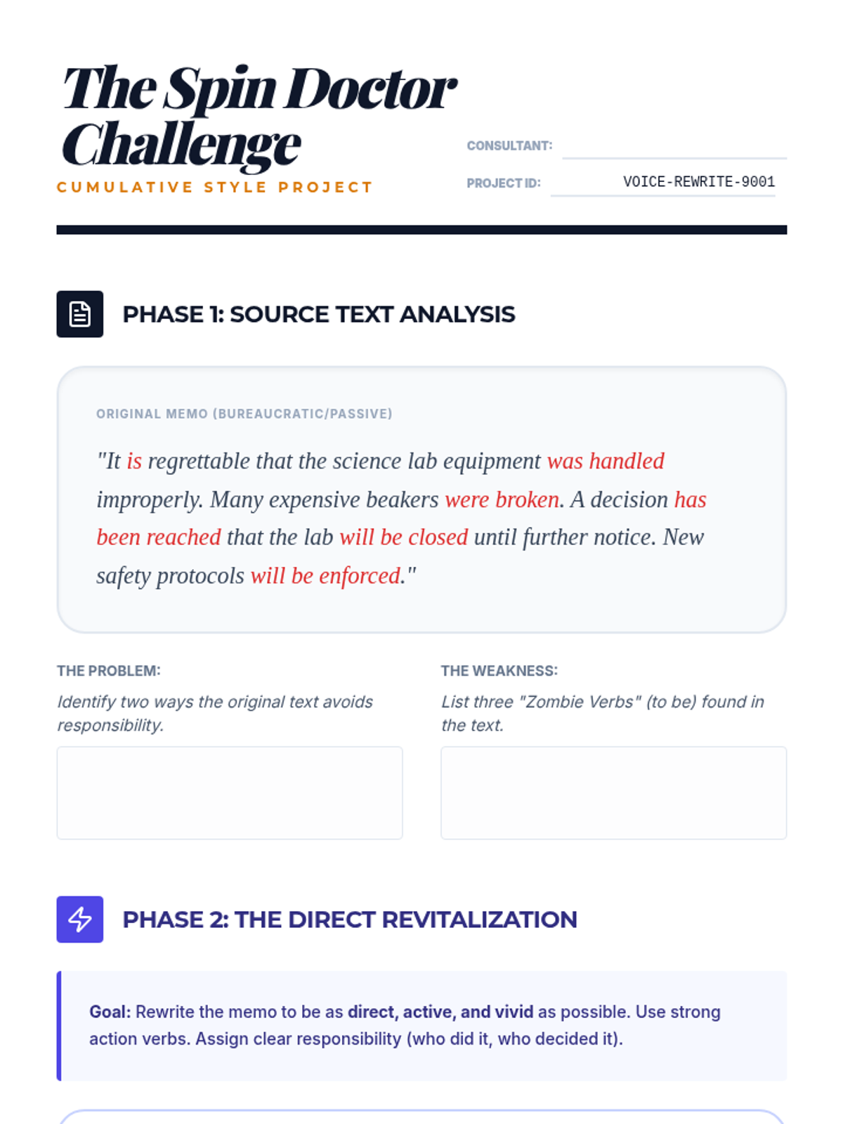 A project-based sequence for 9th-grade students exploring the rhetorical power of active and passive voice. Students move from basic identification to analyzing how voice affects accountability in news and politics, and eventually master the use of strong, vivid verbs to enhance their writing style.