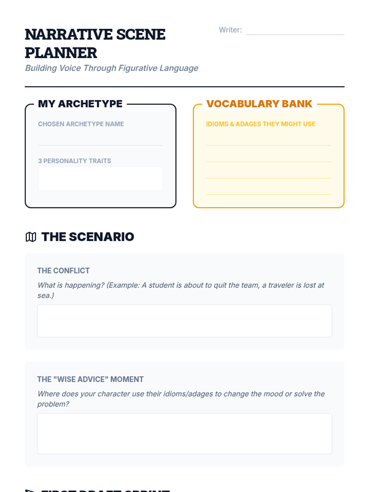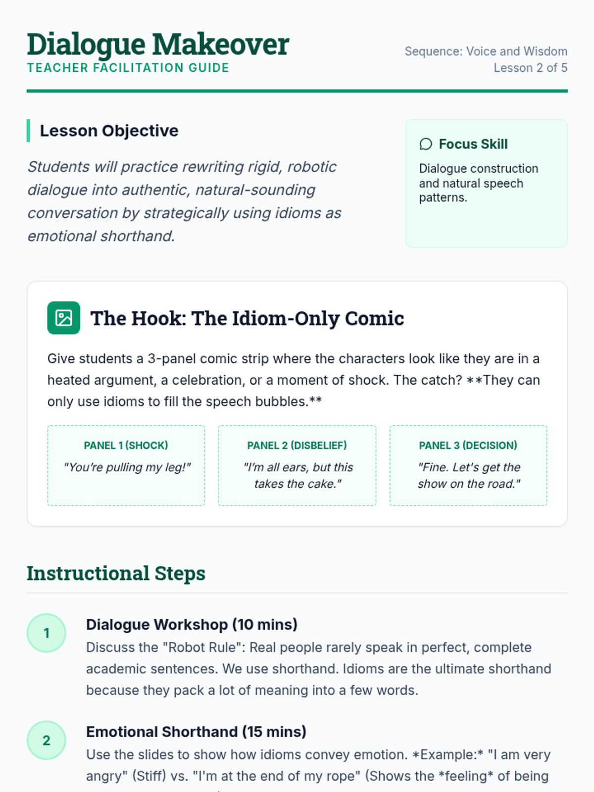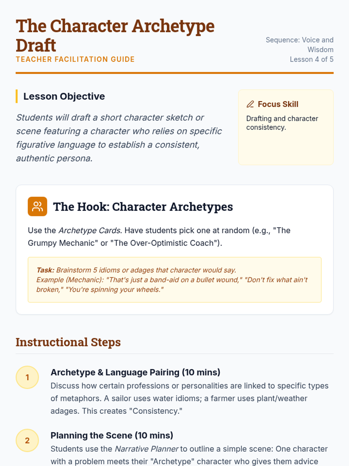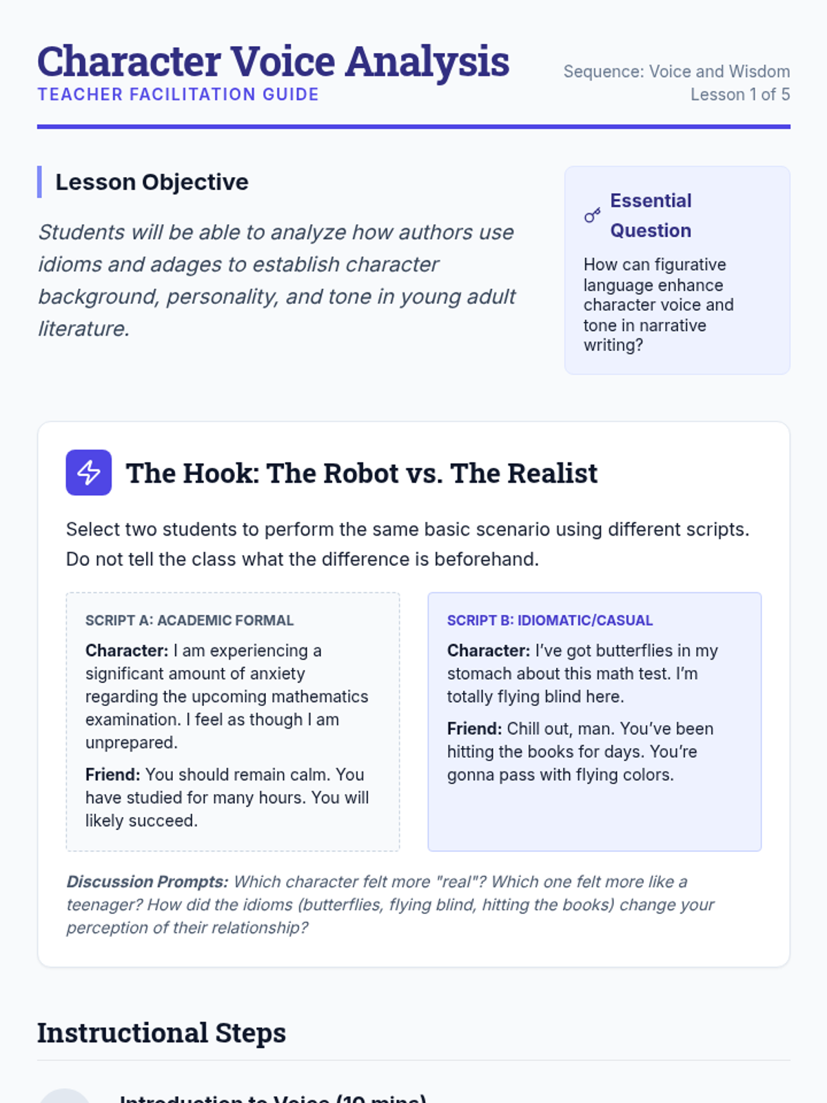 A 5-lesson sequence for 7th-grade students focusing on the use of idioms and adages to enhance narrative voice and characterization. Students move from identification to application, culminating in a polished character-driven narrative.