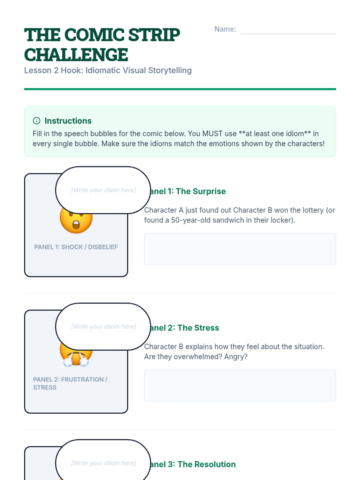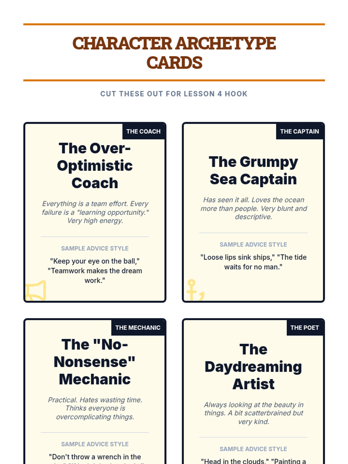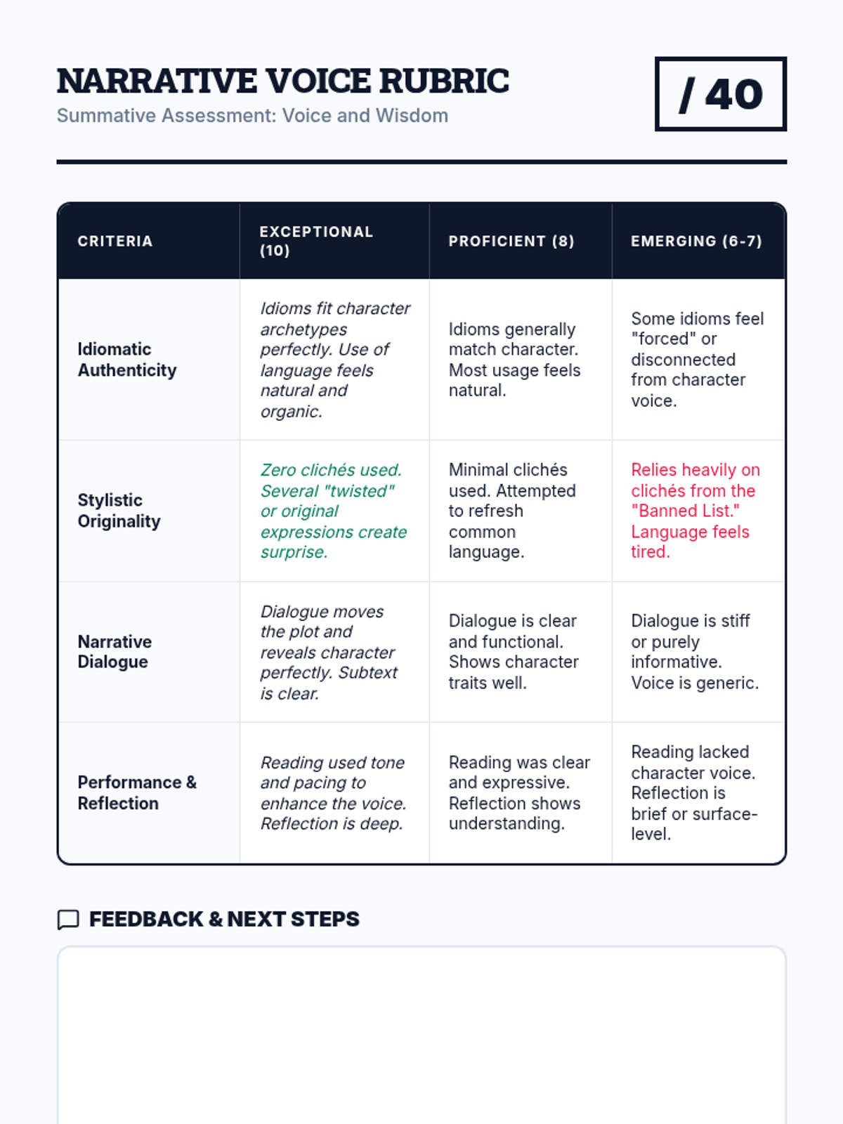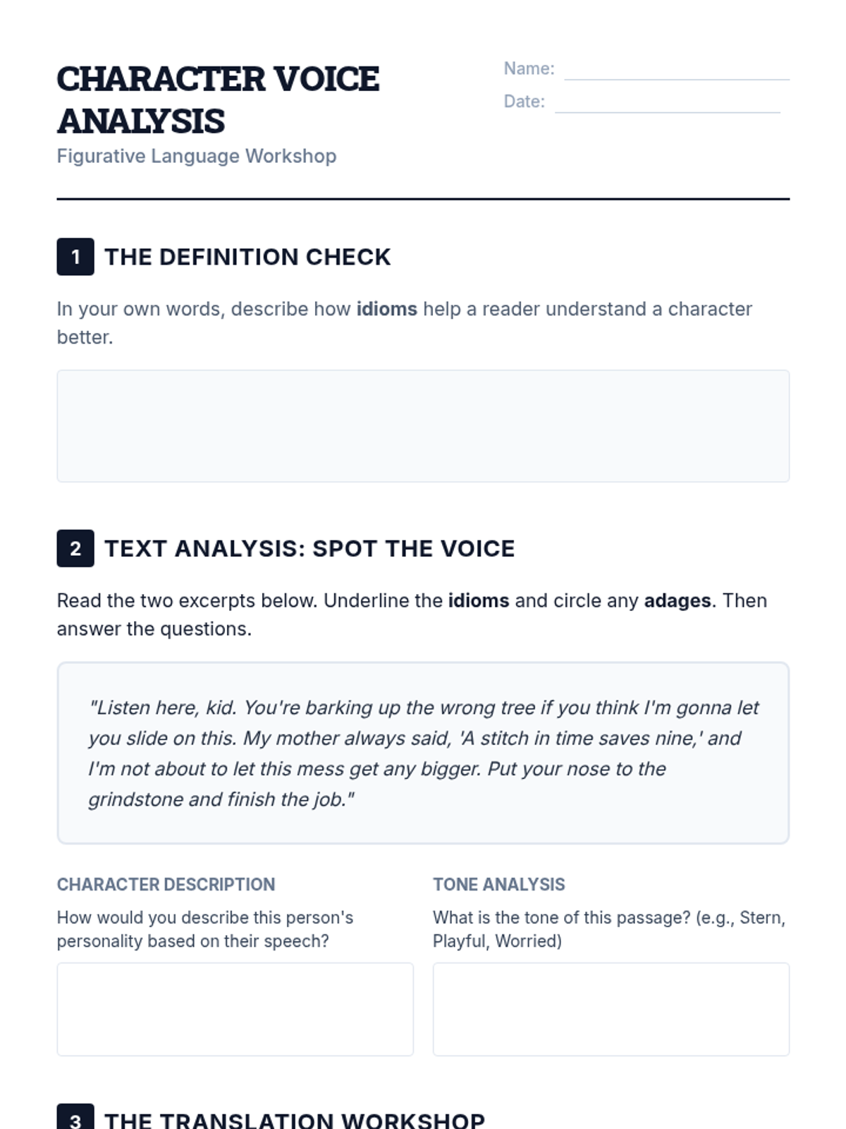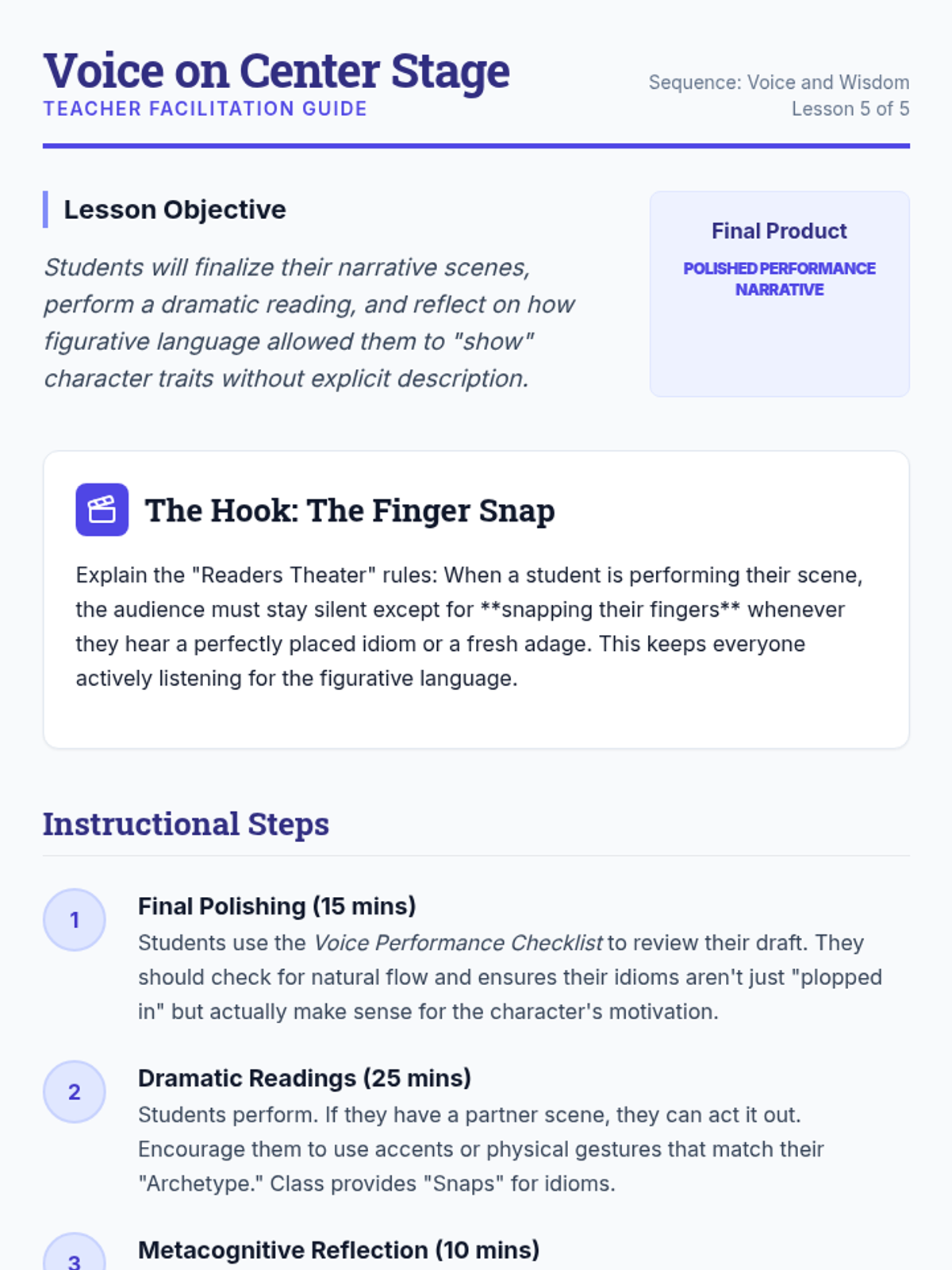 A 5-lesson sequence for 7th-grade students focusing on the use of idioms and adages to enhance narrative voice and characterization. Students move from identification to application, culminating in a polished character-driven narrative.