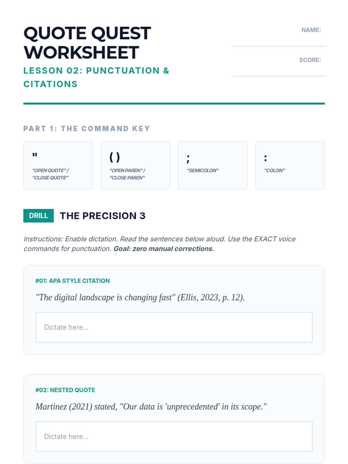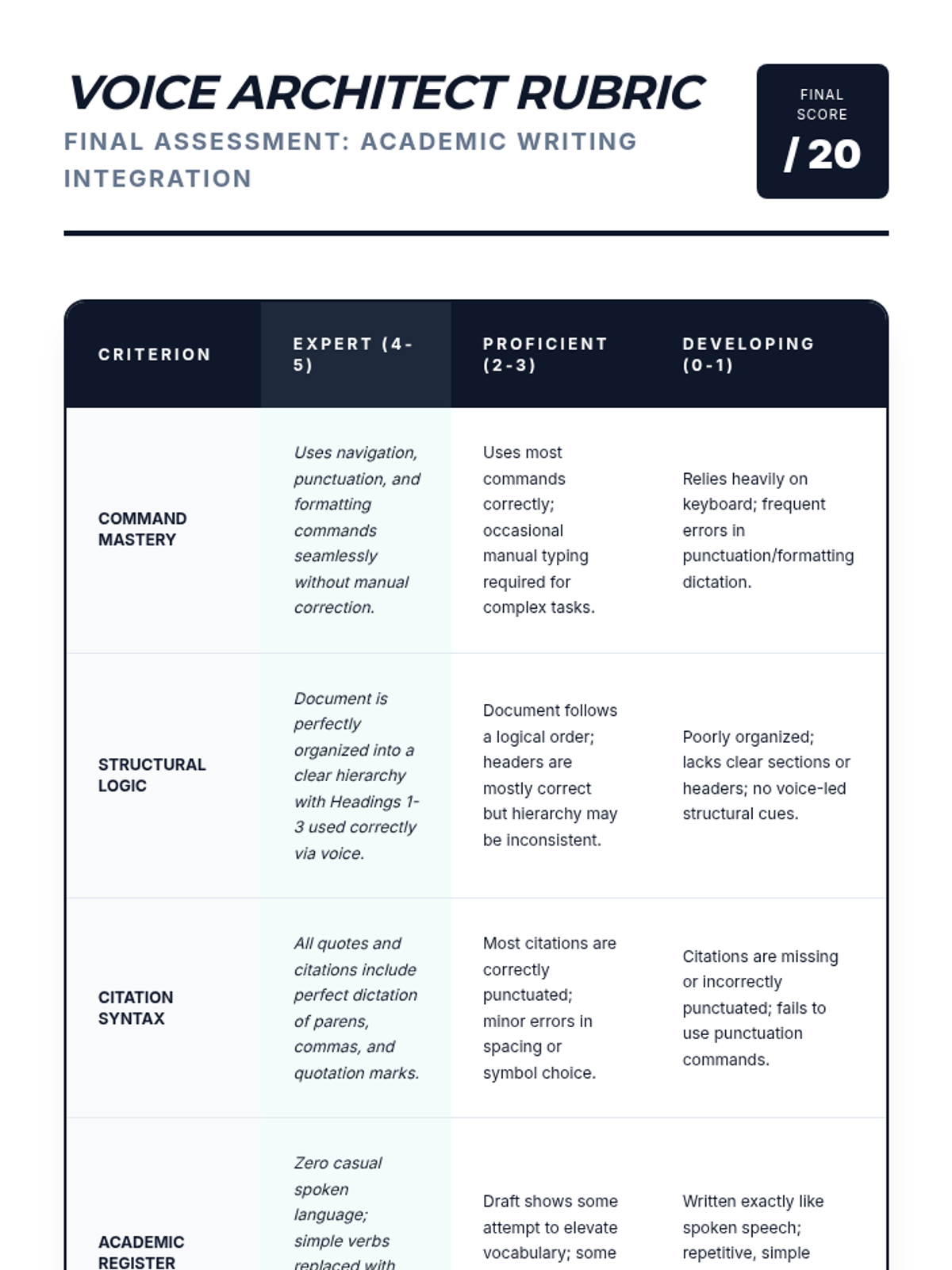 A comprehensive 12th-grade sequence focused on mastering assistive technology (dictation) for college-level research and academic writing, covering everything from rapid ideation to complex citation formatting and document navigation.