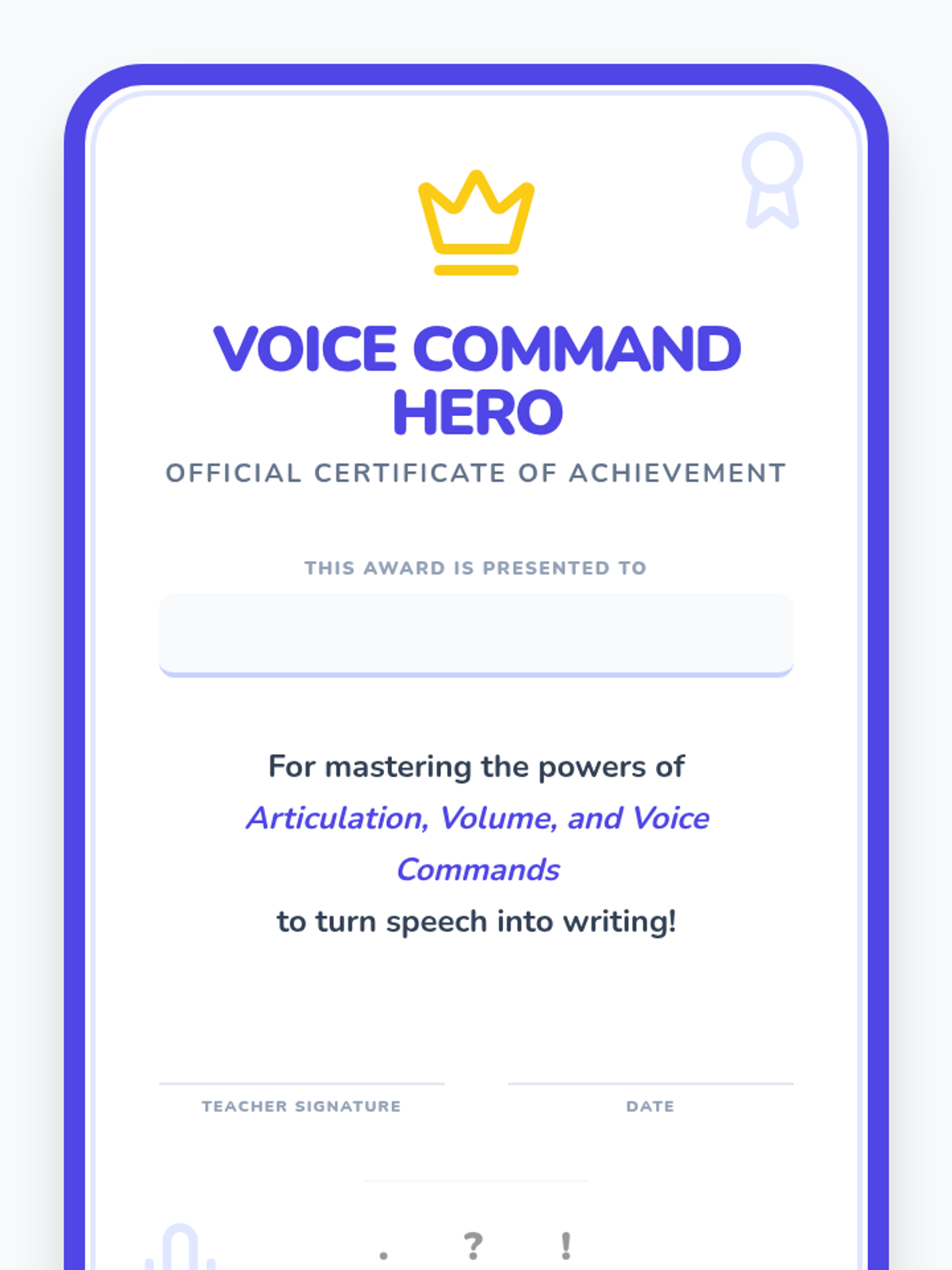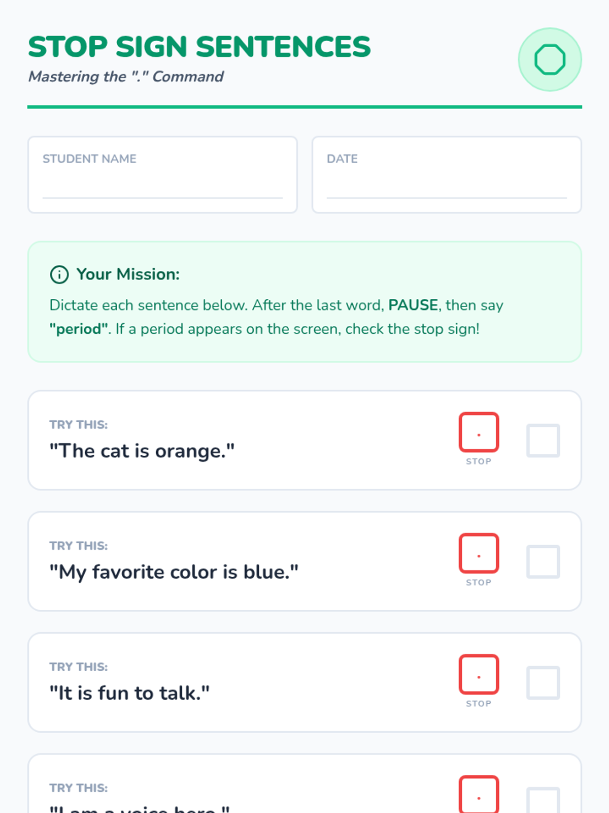 A foundational series for 3rd grade students to master speech-to-text technology, focusing on articulation, volume control, and basic punctuation commands (period, question mark, exclamation point).