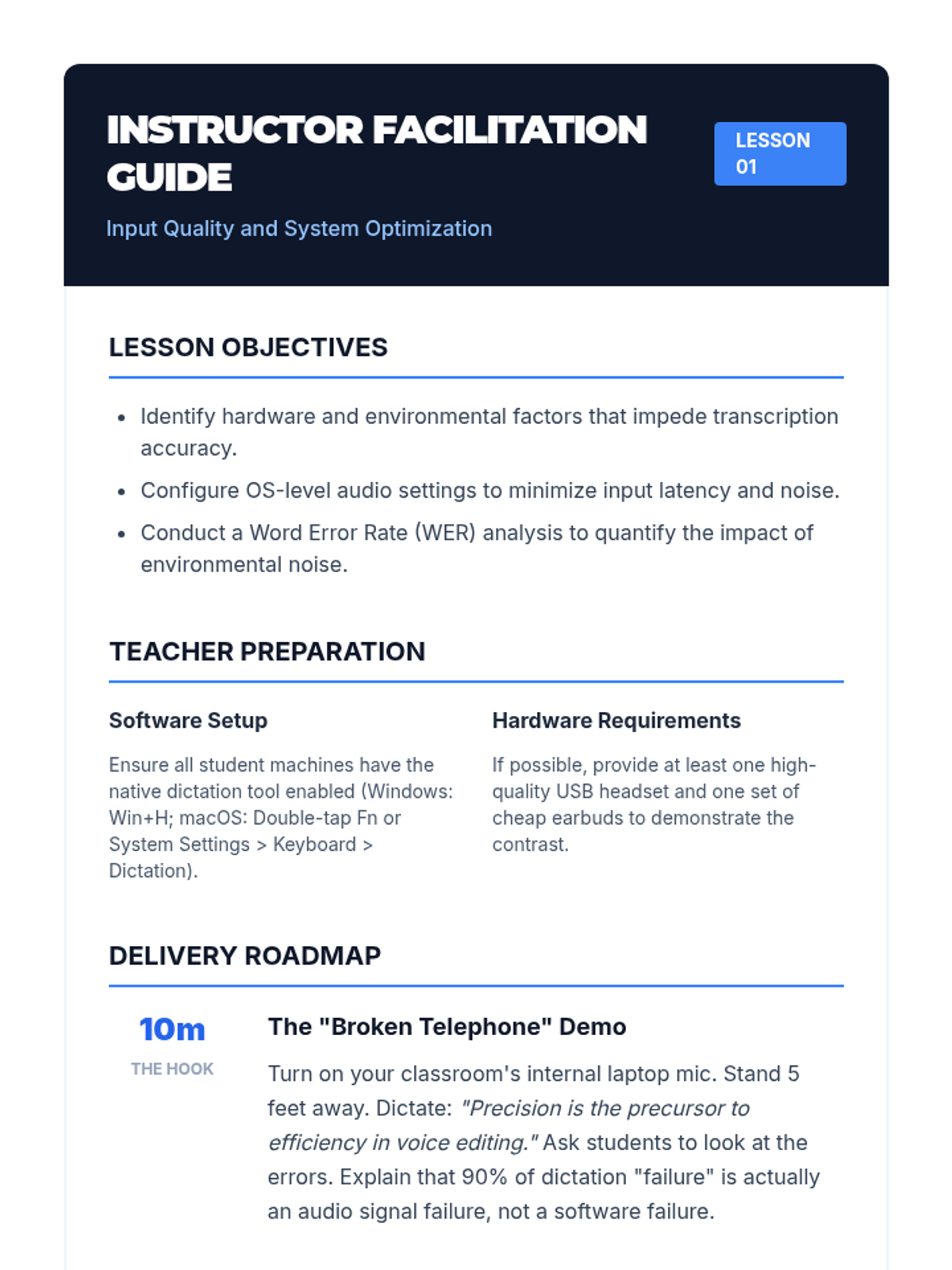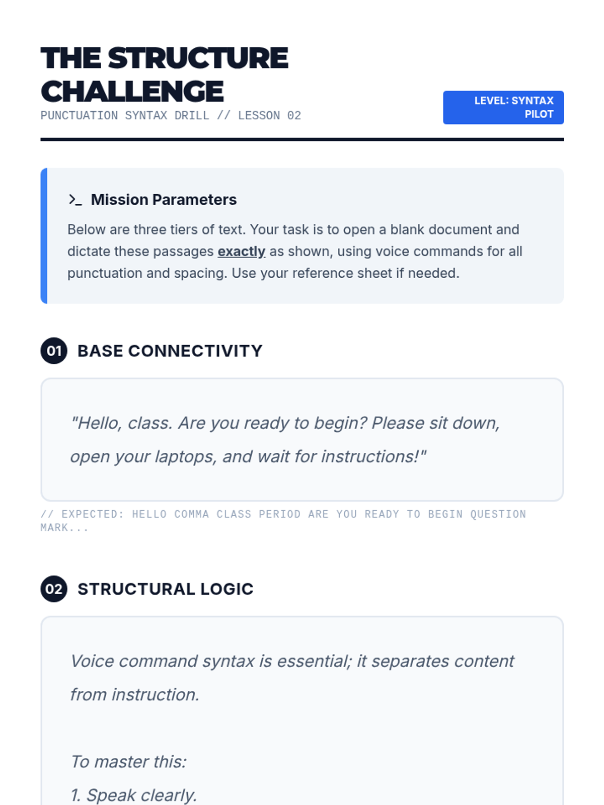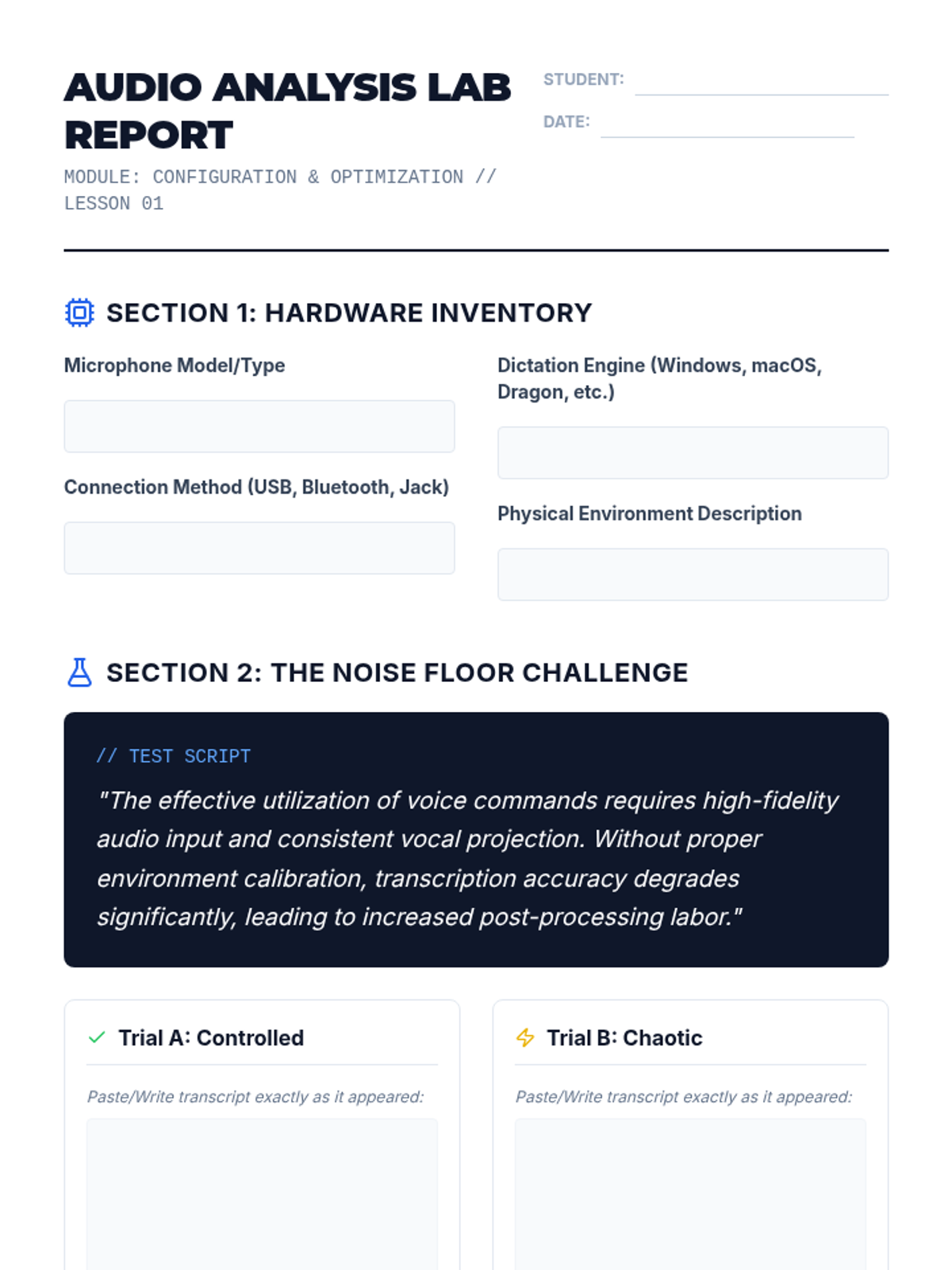 A comprehensive sequence for undergraduate students to master document creation and editing using voice commands. Students progress from hardware optimization to complex navigation, formatting, and integrated document production.