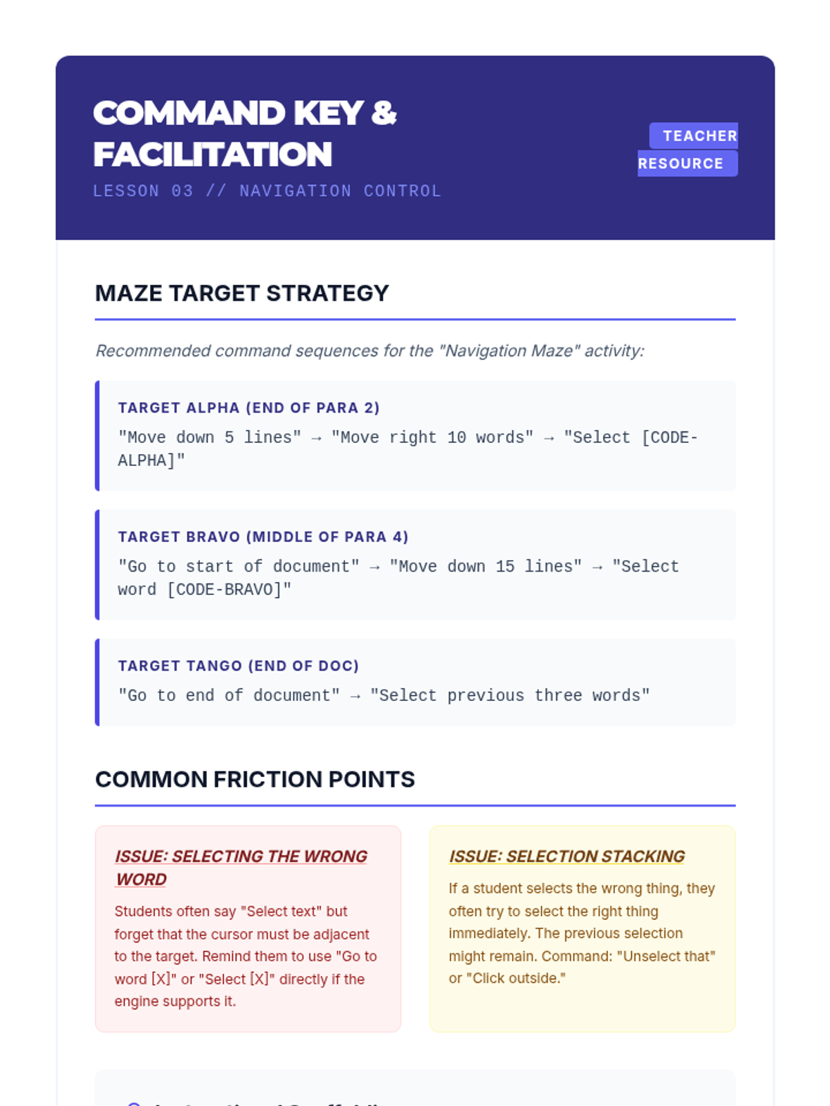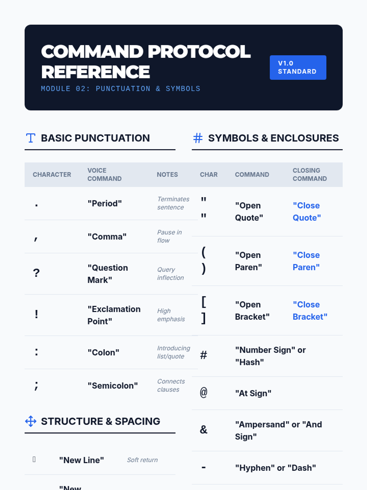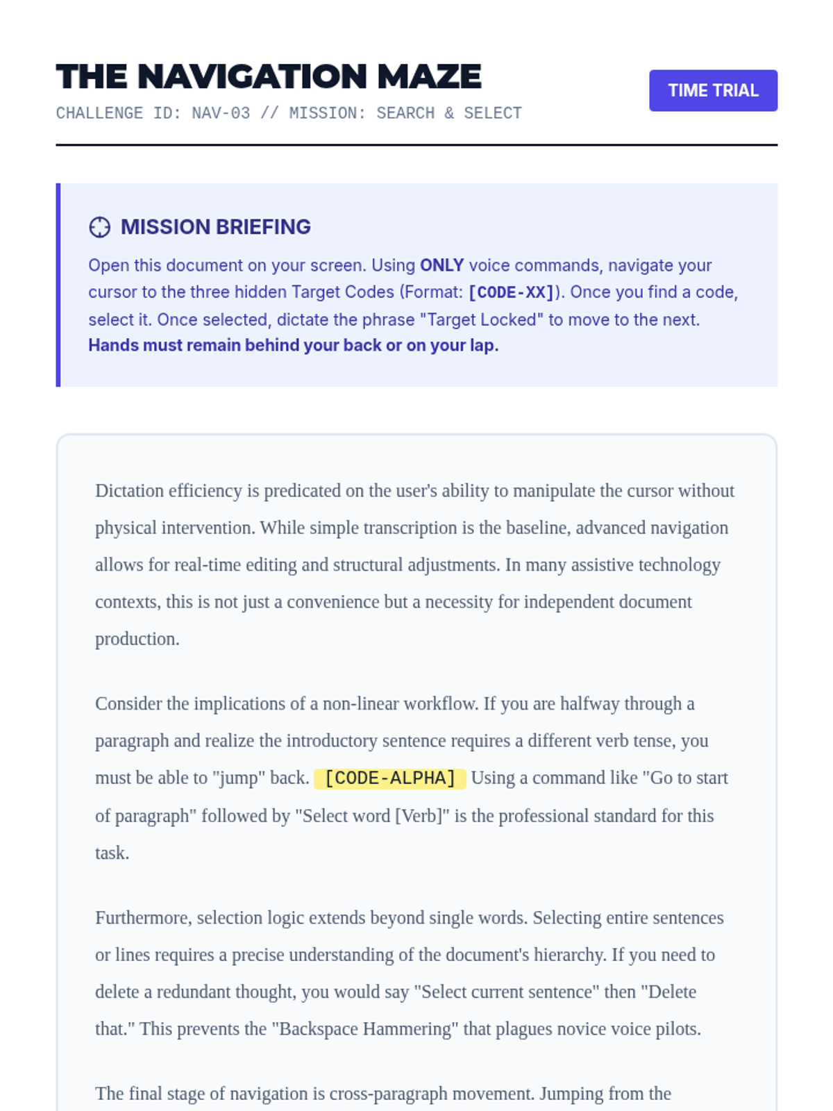 A comprehensive sequence for undergraduate students to master document creation and editing using voice commands. Students progress from hardware optimization to complex navigation, formatting, and integrated document production.