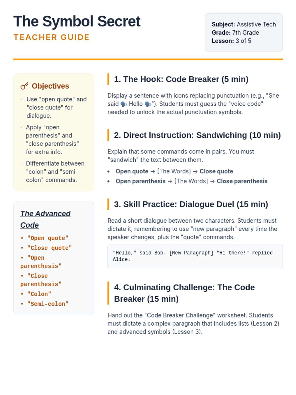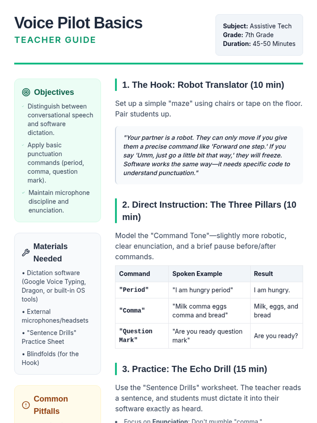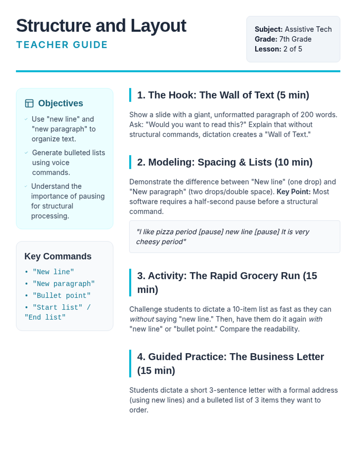 A comprehensive sequence for 7th graders to master assistive technology through speech-to-text punctuation and formatting. Students progress from basic sentences to complex, hands-free document creation.