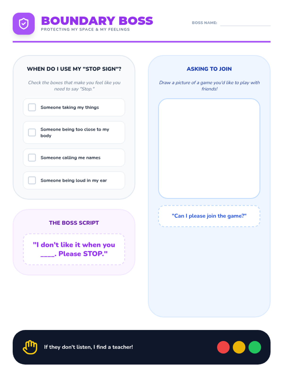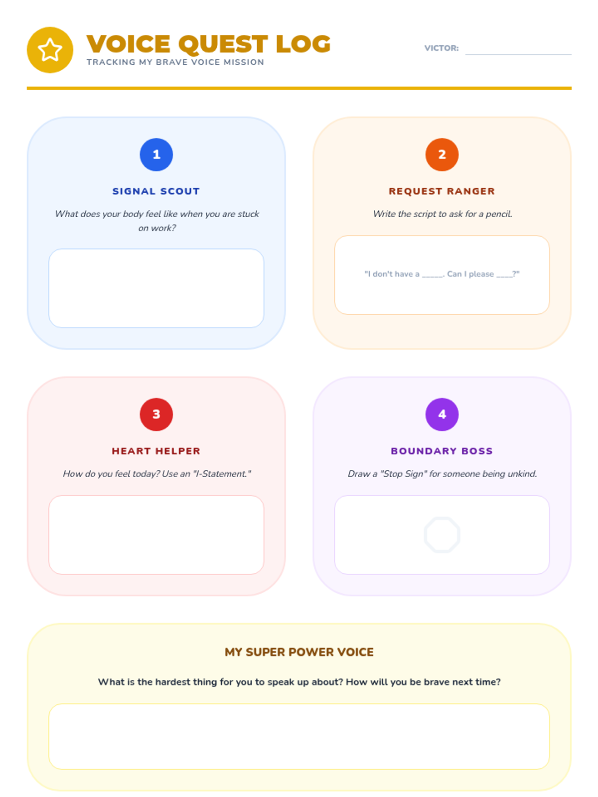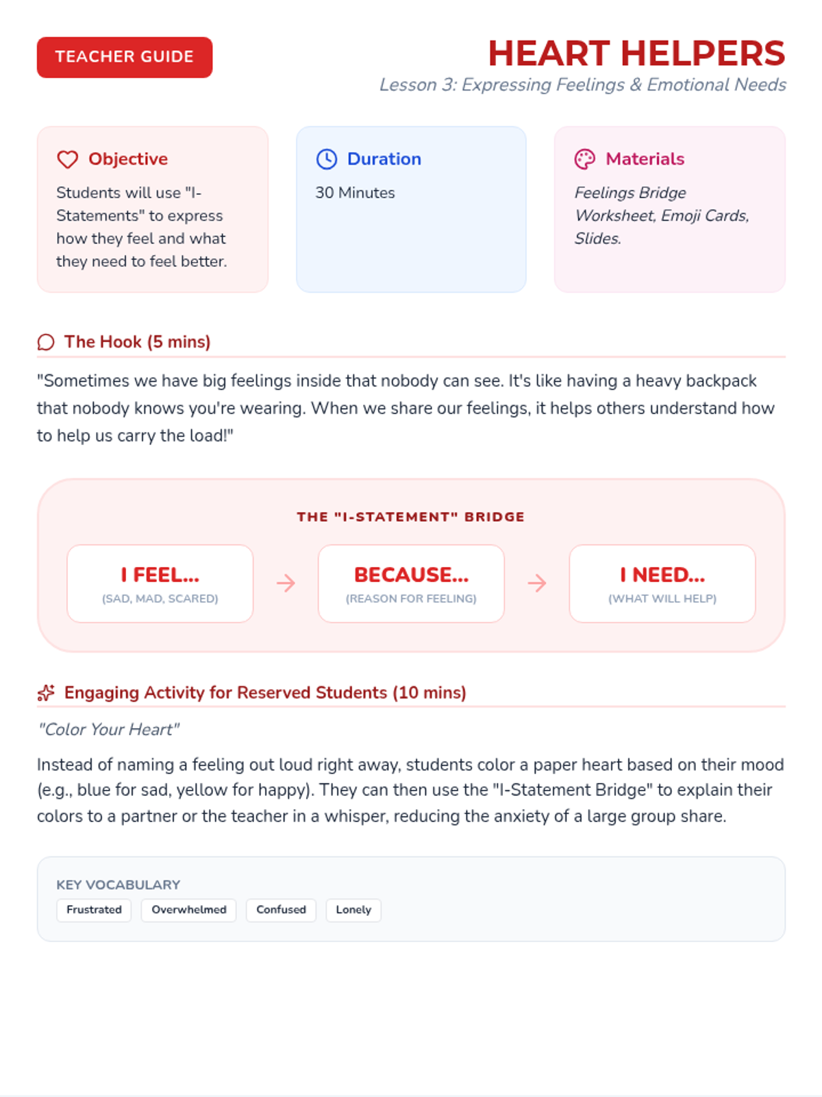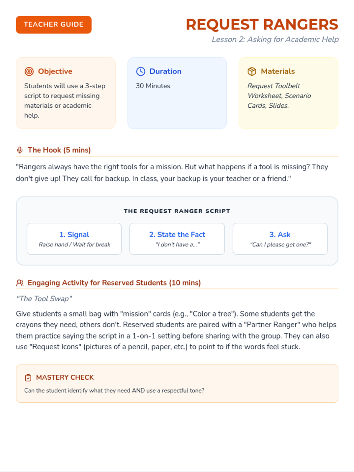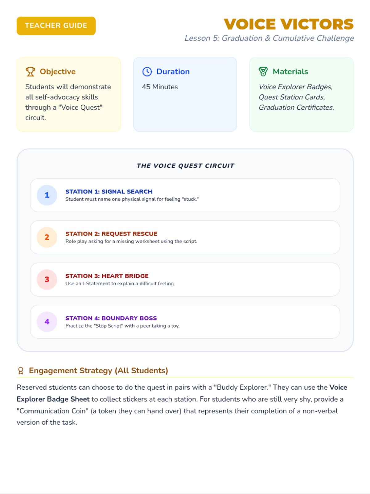 A comprehensive 5-lesson small group series designed for 2nd graders to build self-advocacy skills, focusing on identifying needs, asking for help, expressing feelings, and resolving peer conflicts.