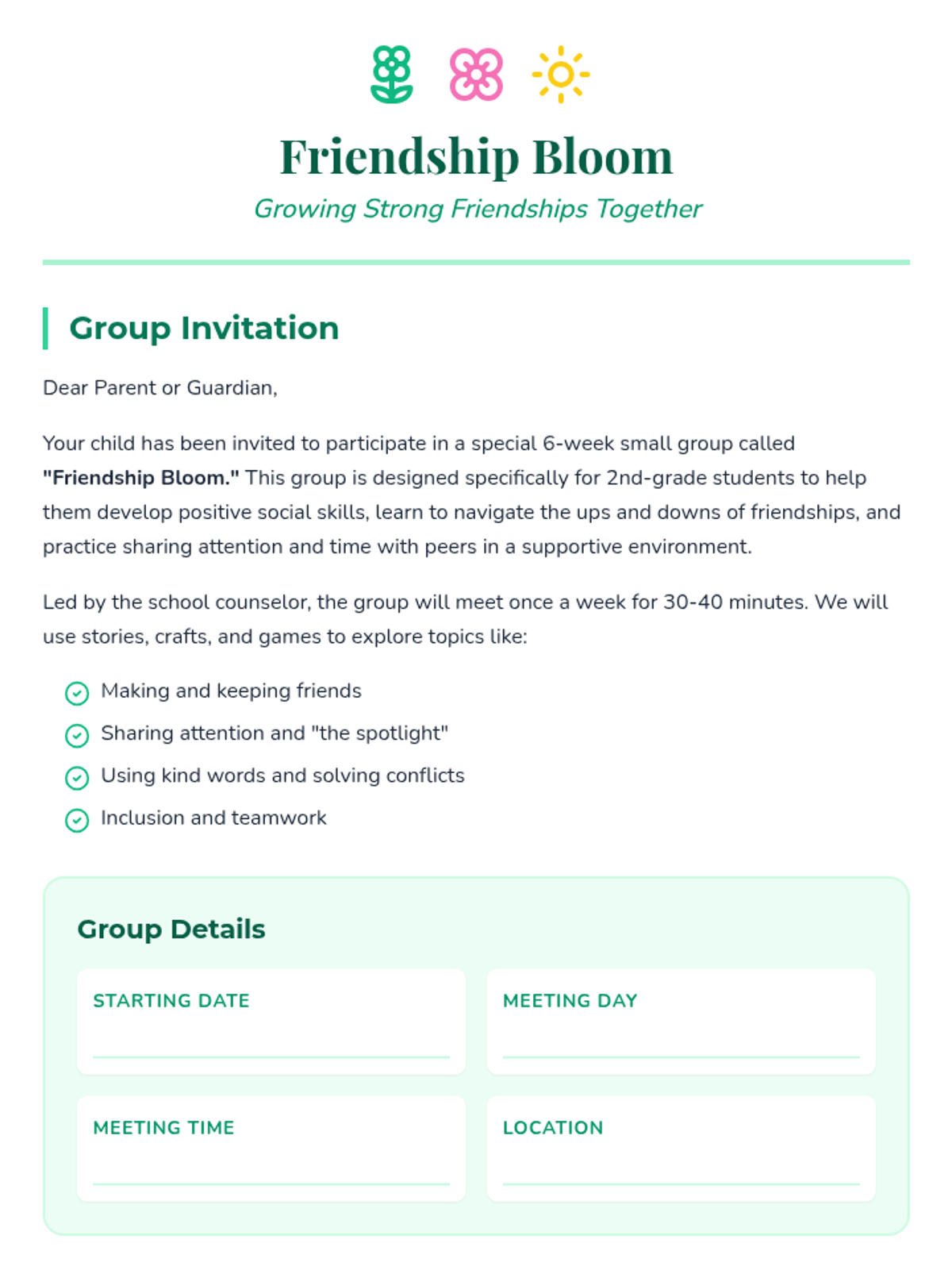 A 6-week social-emotional learning sequence designed for a small group of three 2nd grade girls. The curriculum focuses on building foundational friendship skills, navigating the dynamics of a three-person group, and learning to share attention and time.