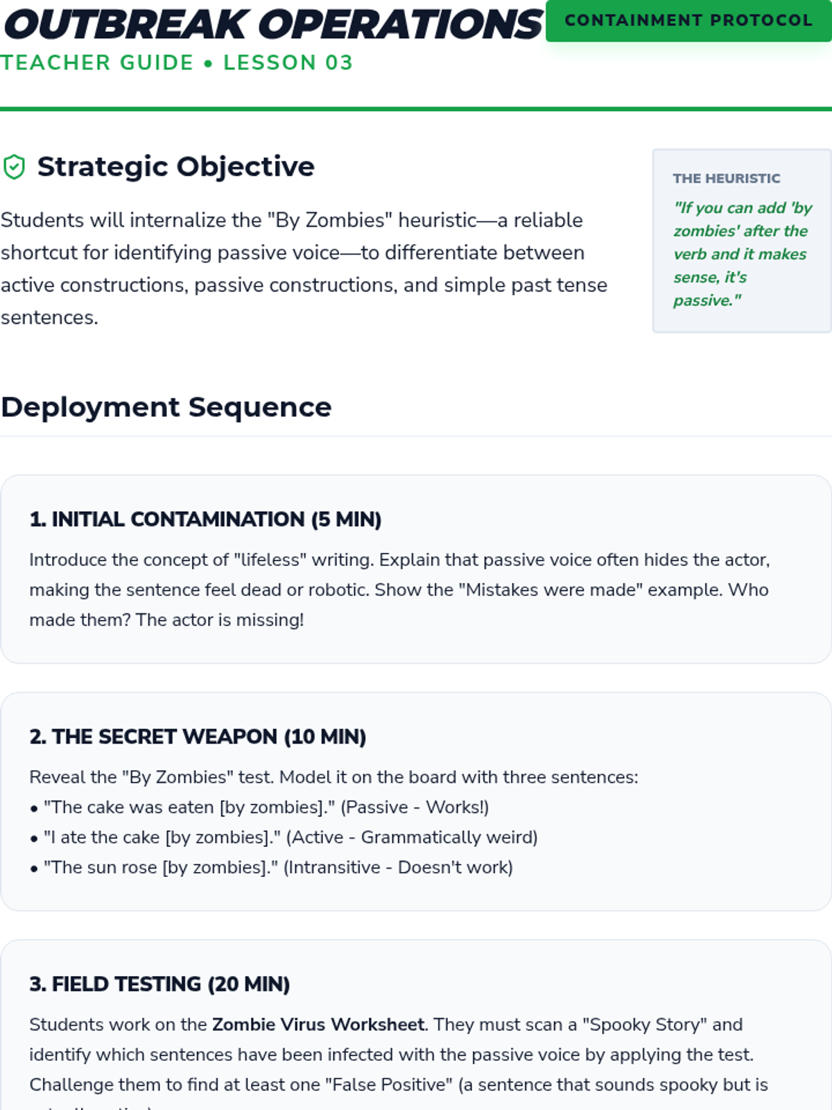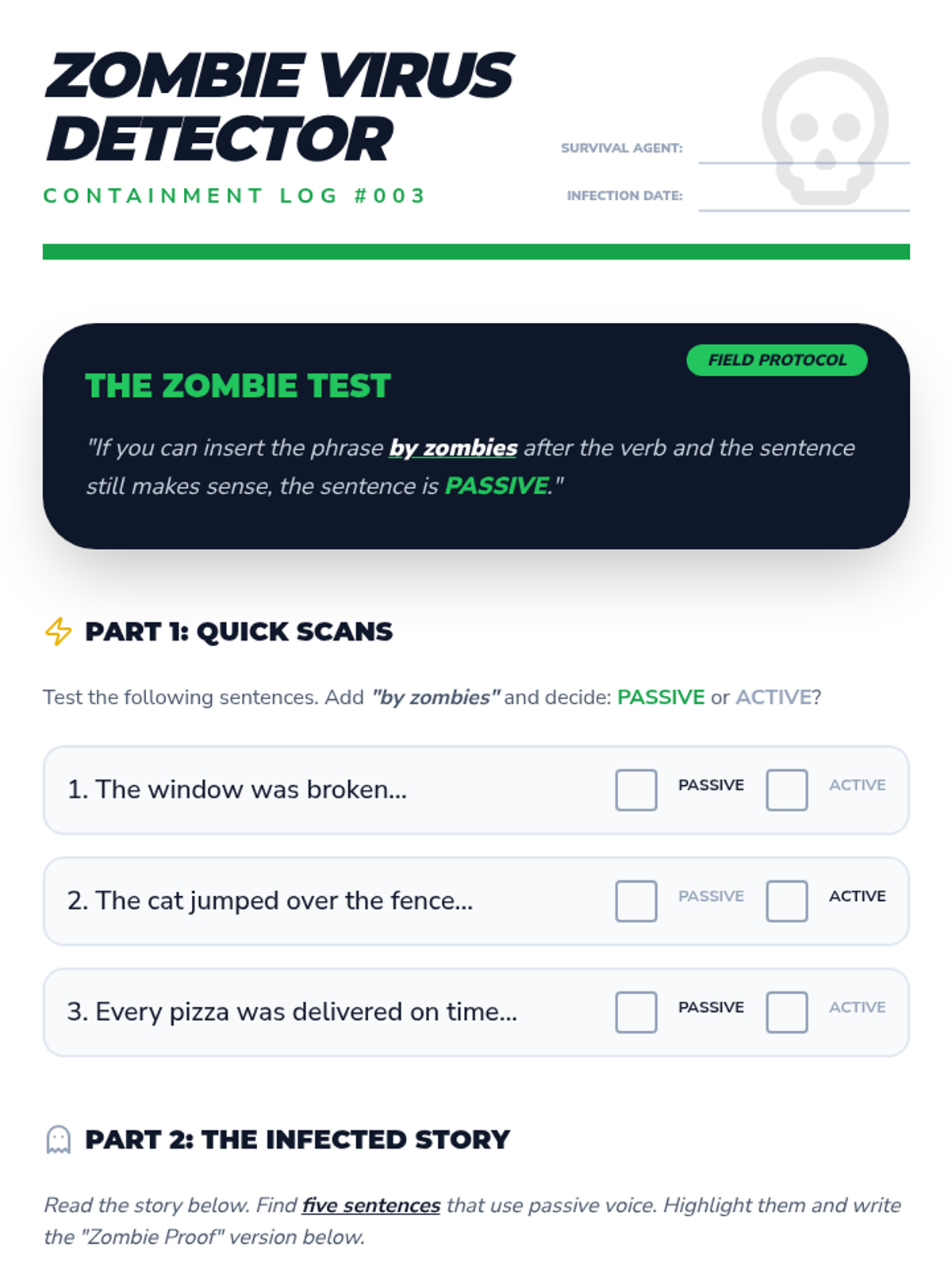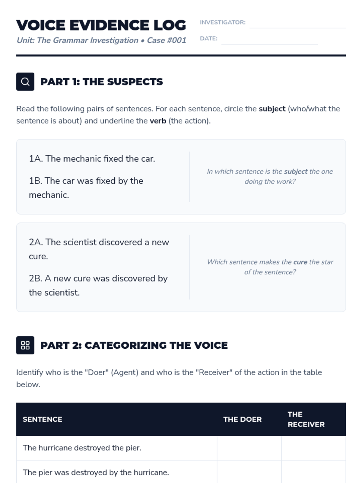 A 7th-grade inquiry-based unit that guides students from discovering the structural differences between active and passive voice to applying them rhetorically. Students use detective-themed activities, the 'Zombie Test' heuristic, and sentence mapping to master grammar mechanics.