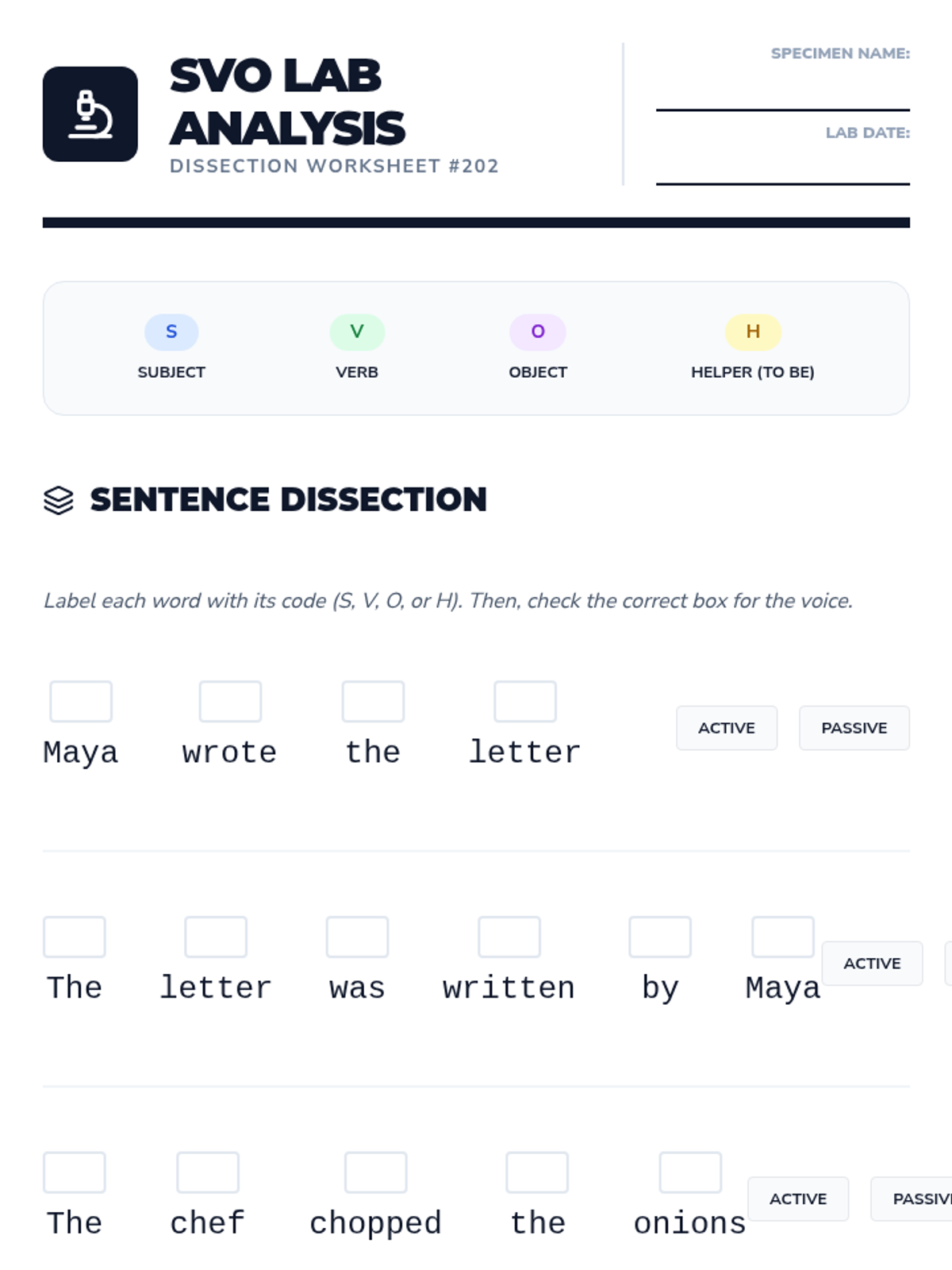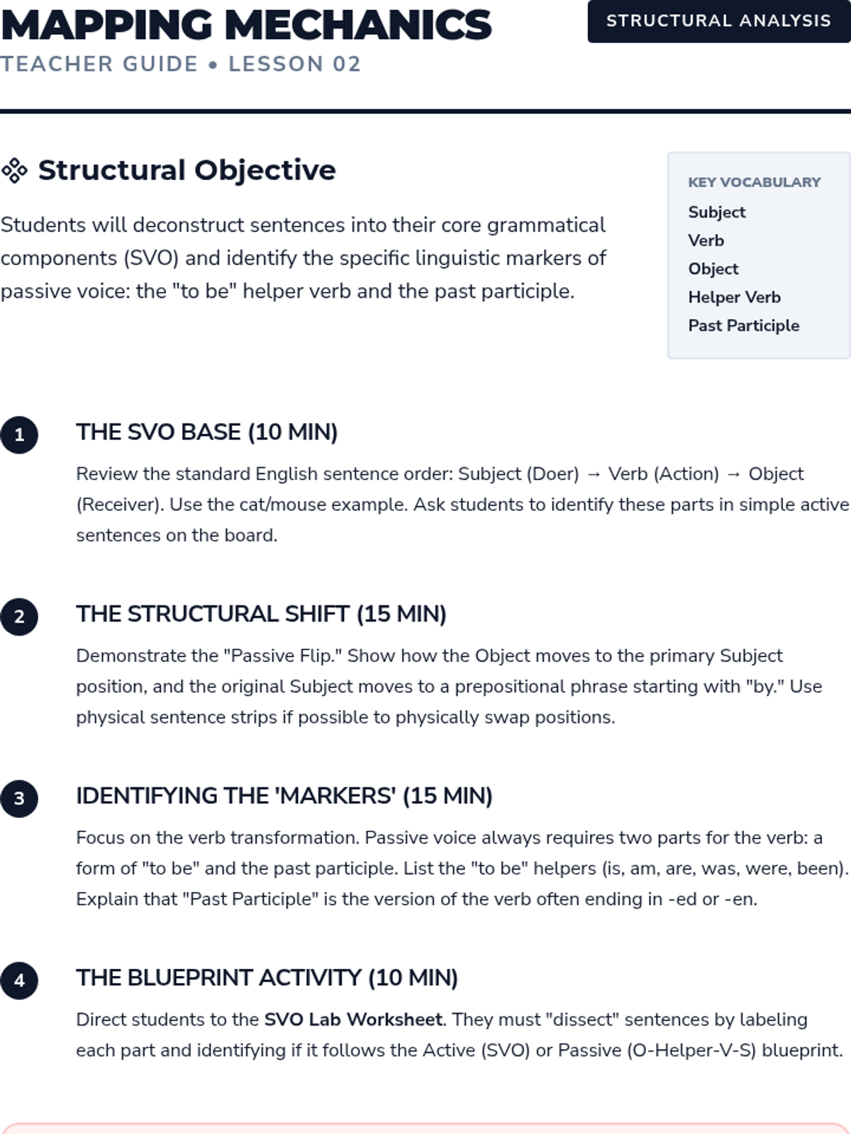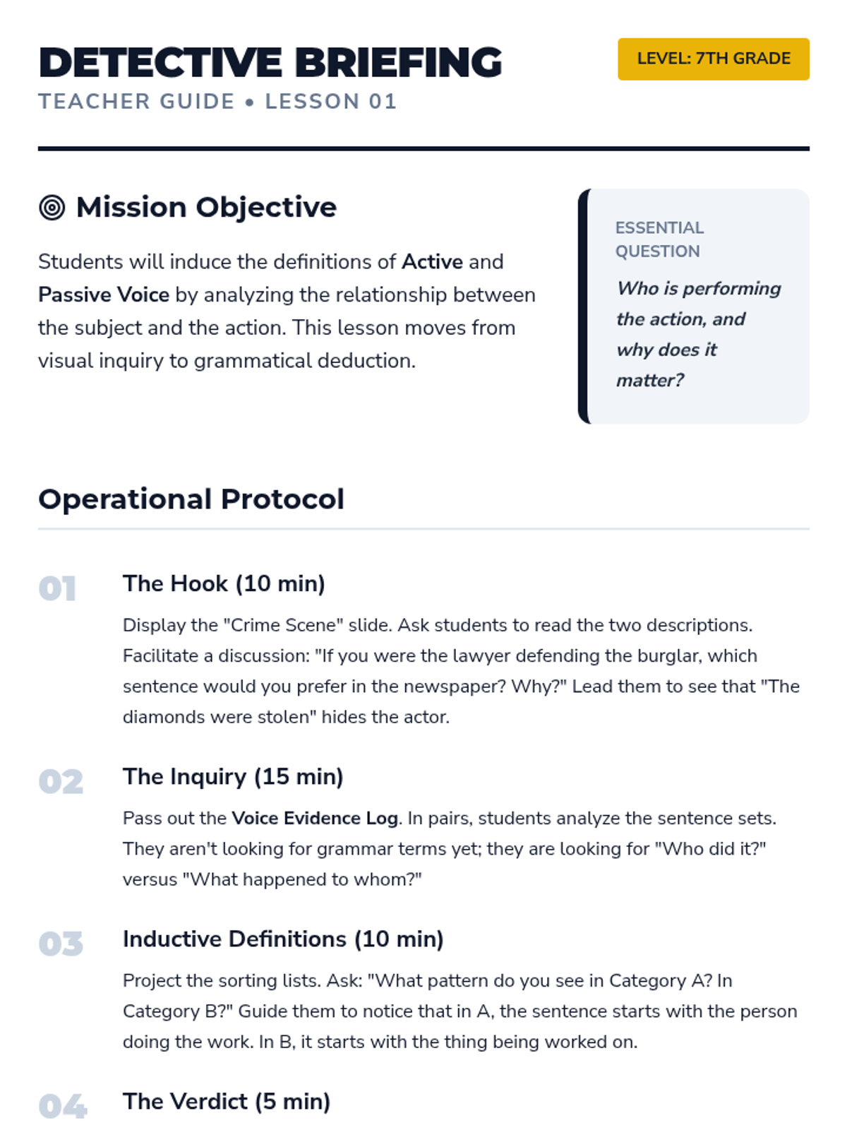 A 7th-grade inquiry-based unit that guides students from discovering the structural differences between active and passive voice to applying them rhetorically. Students use detective-themed activities, the 'Zombie Test' heuristic, and sentence mapping to master grammar mechanics.