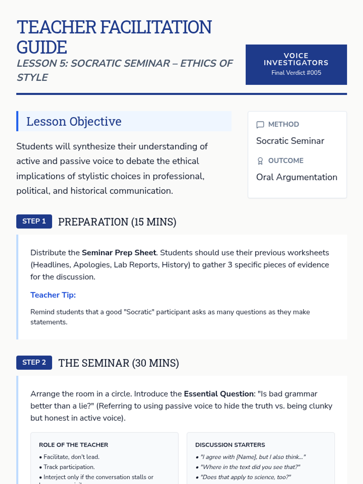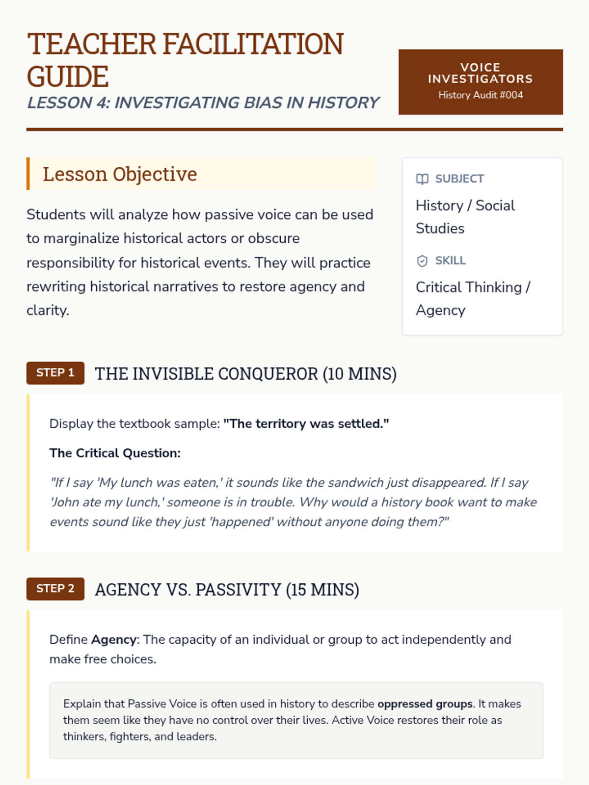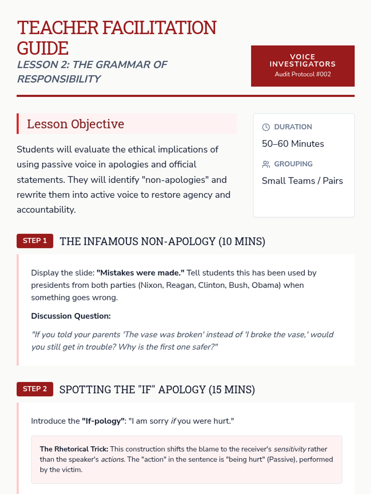 An inquiry-based exploration of active and passive voice through the lens of media literacy, political accountability, and historical agency for 8th-grade students. Students investigate how grammatical choices influence public perception and the ethics of linguistic transparency.