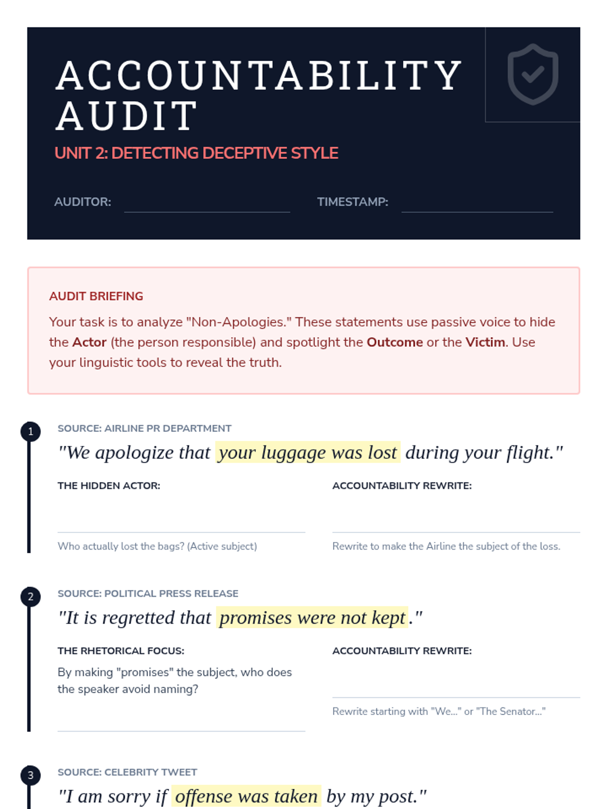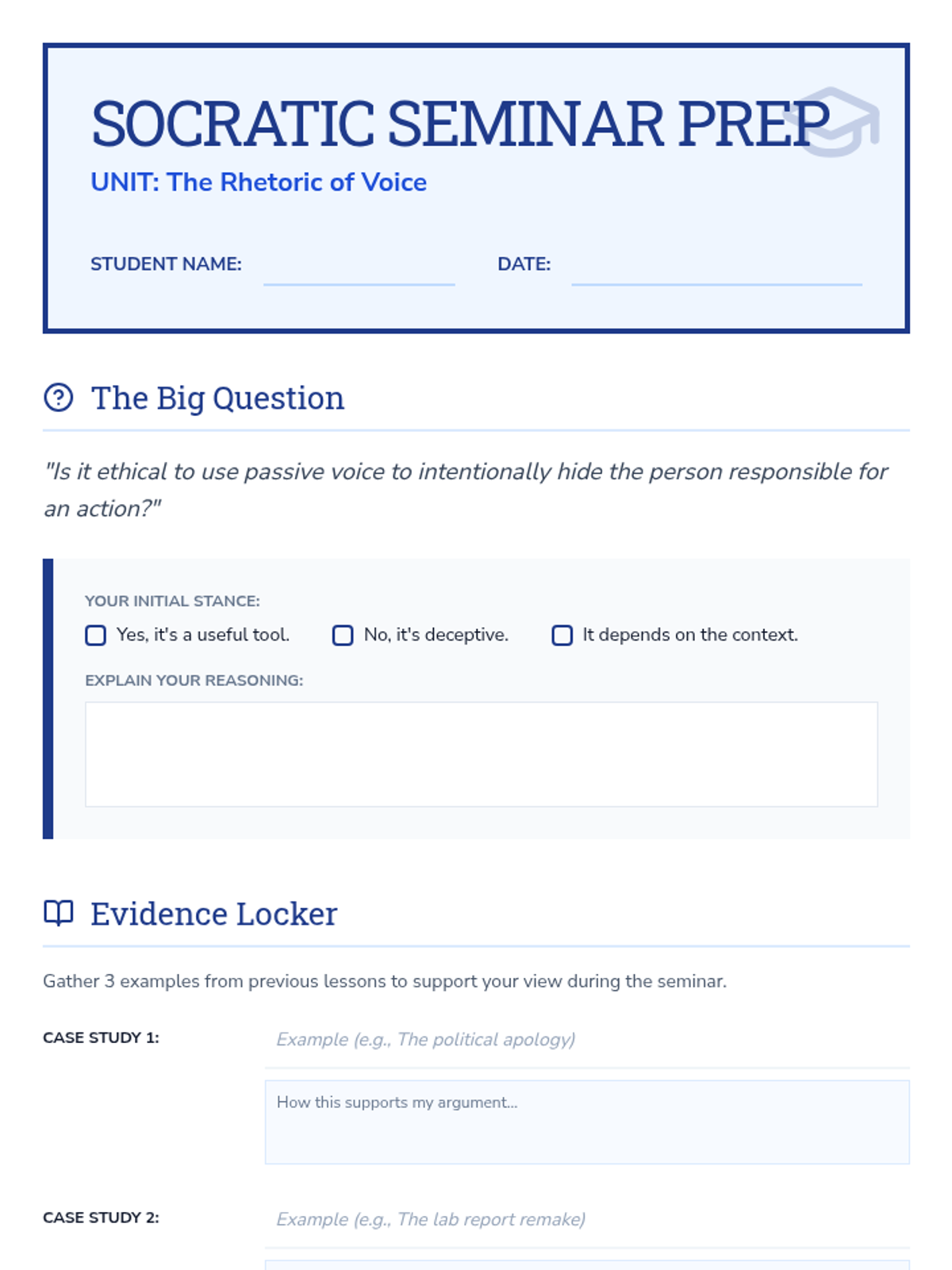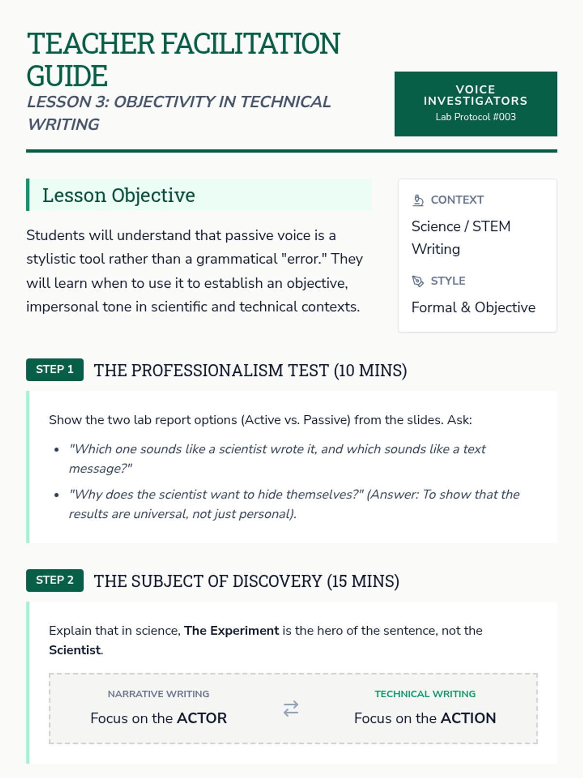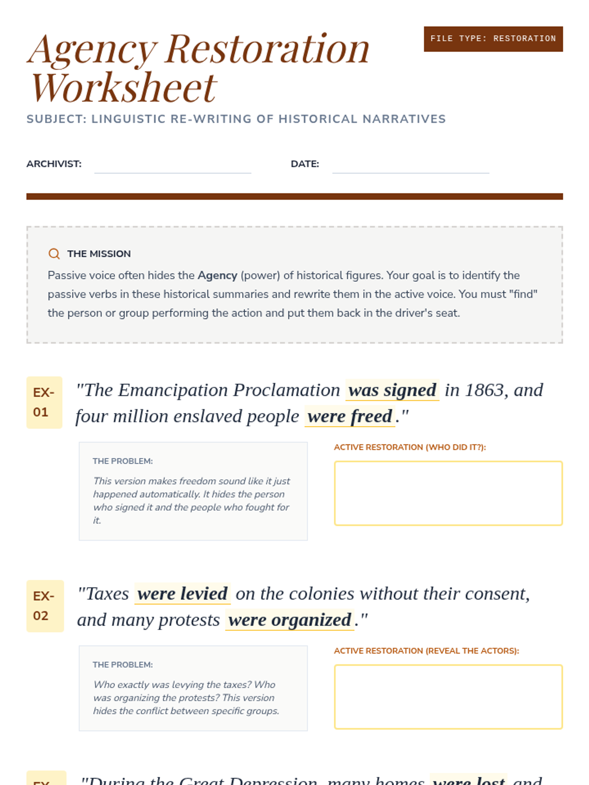 An inquiry-based exploration of active and passive voice through the lens of media literacy, political accountability, and historical agency for 8th-grade students. Students investigate how grammatical choices influence public perception and the ethics of linguistic transparency.