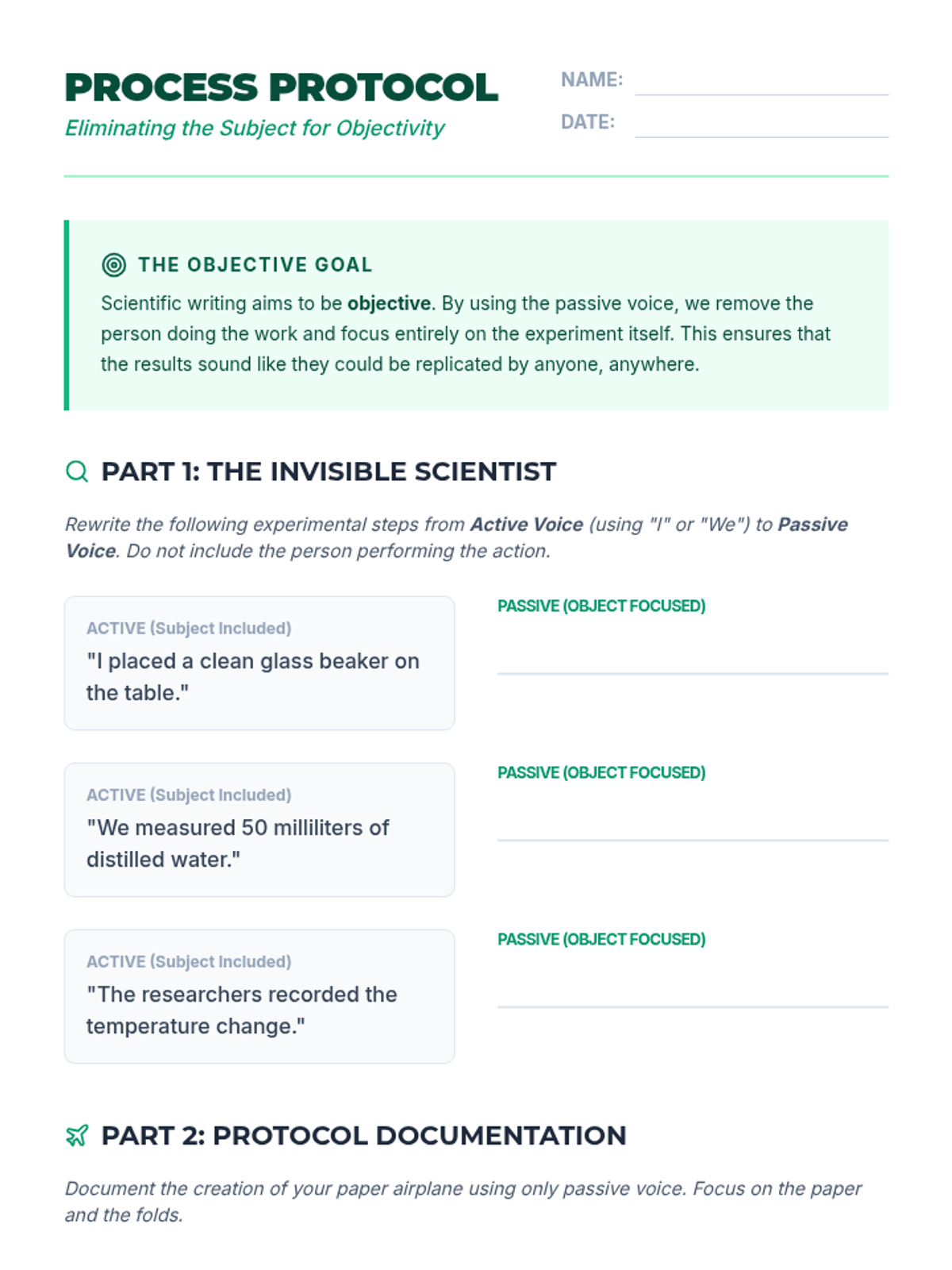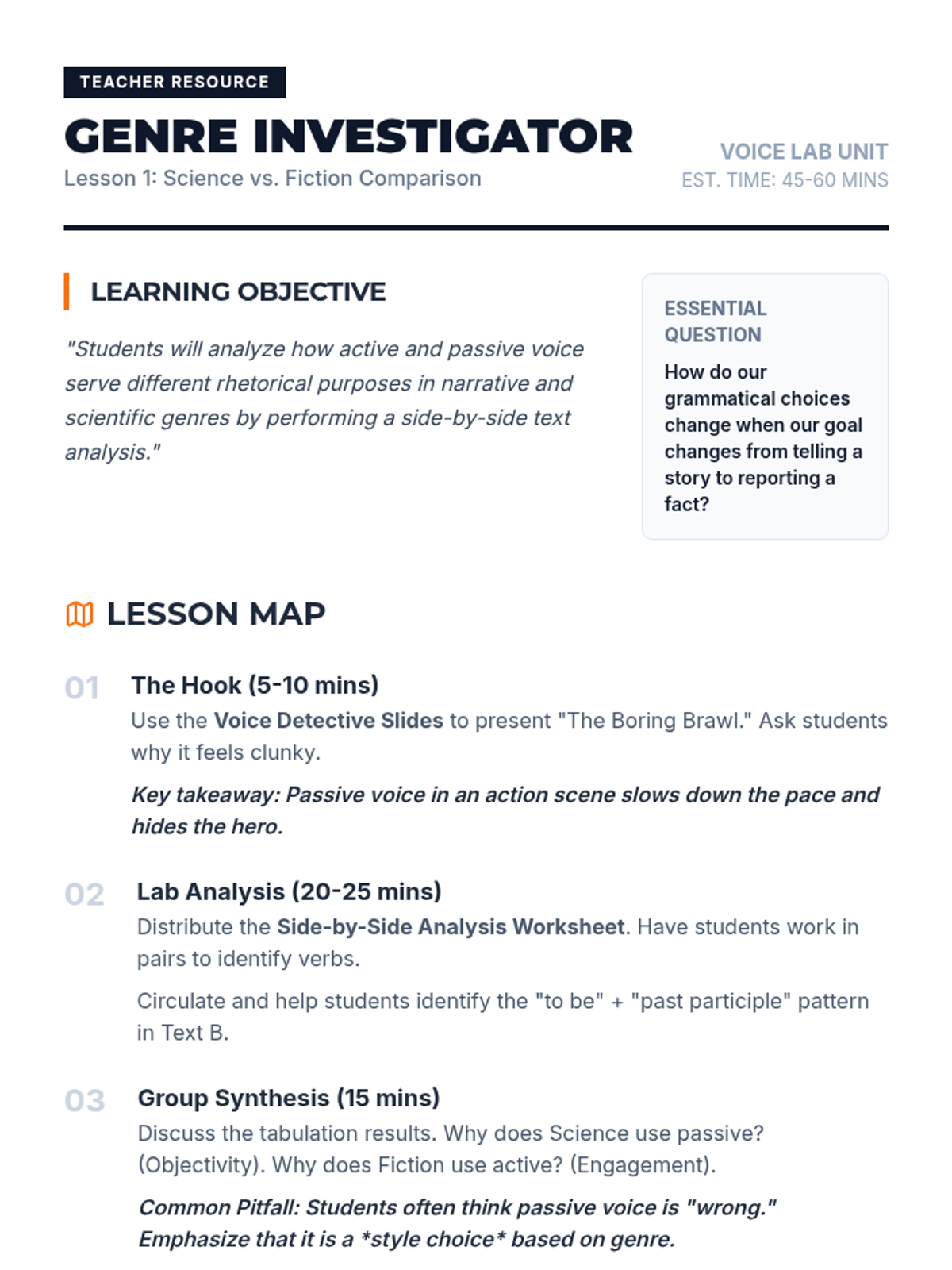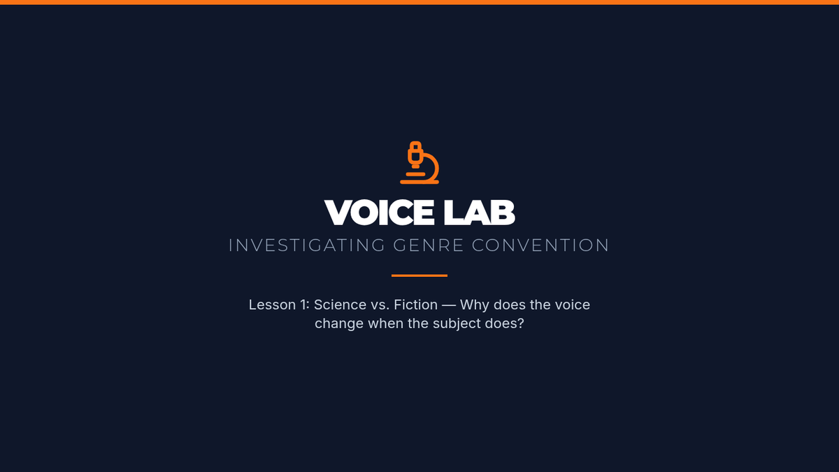 A project-based unit for 7th graders focusing on the functional use of active and passive voice. Students explore how genre conventions (science vs. fiction) dictate grammatical choices, culminating in a dual-genre writing project.