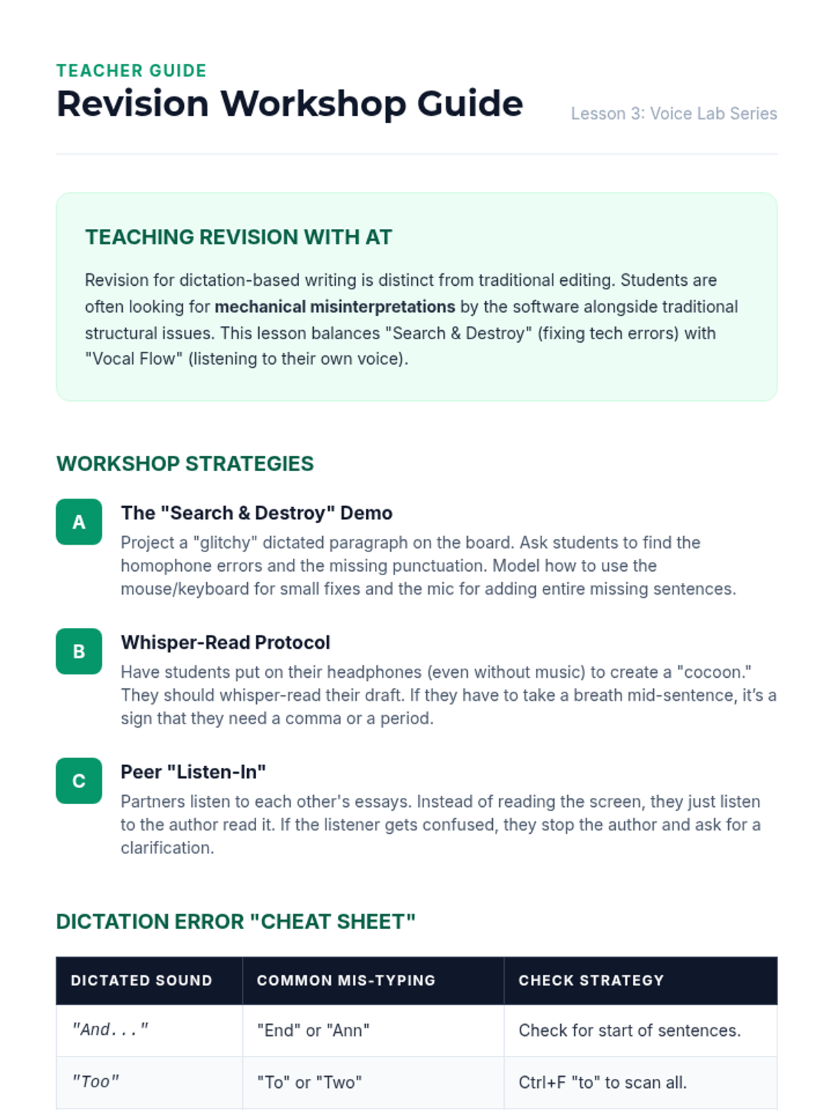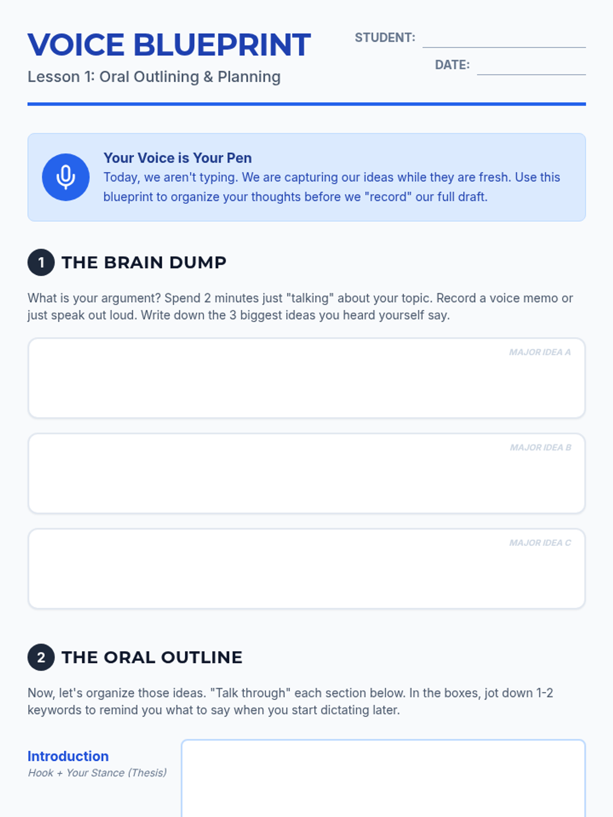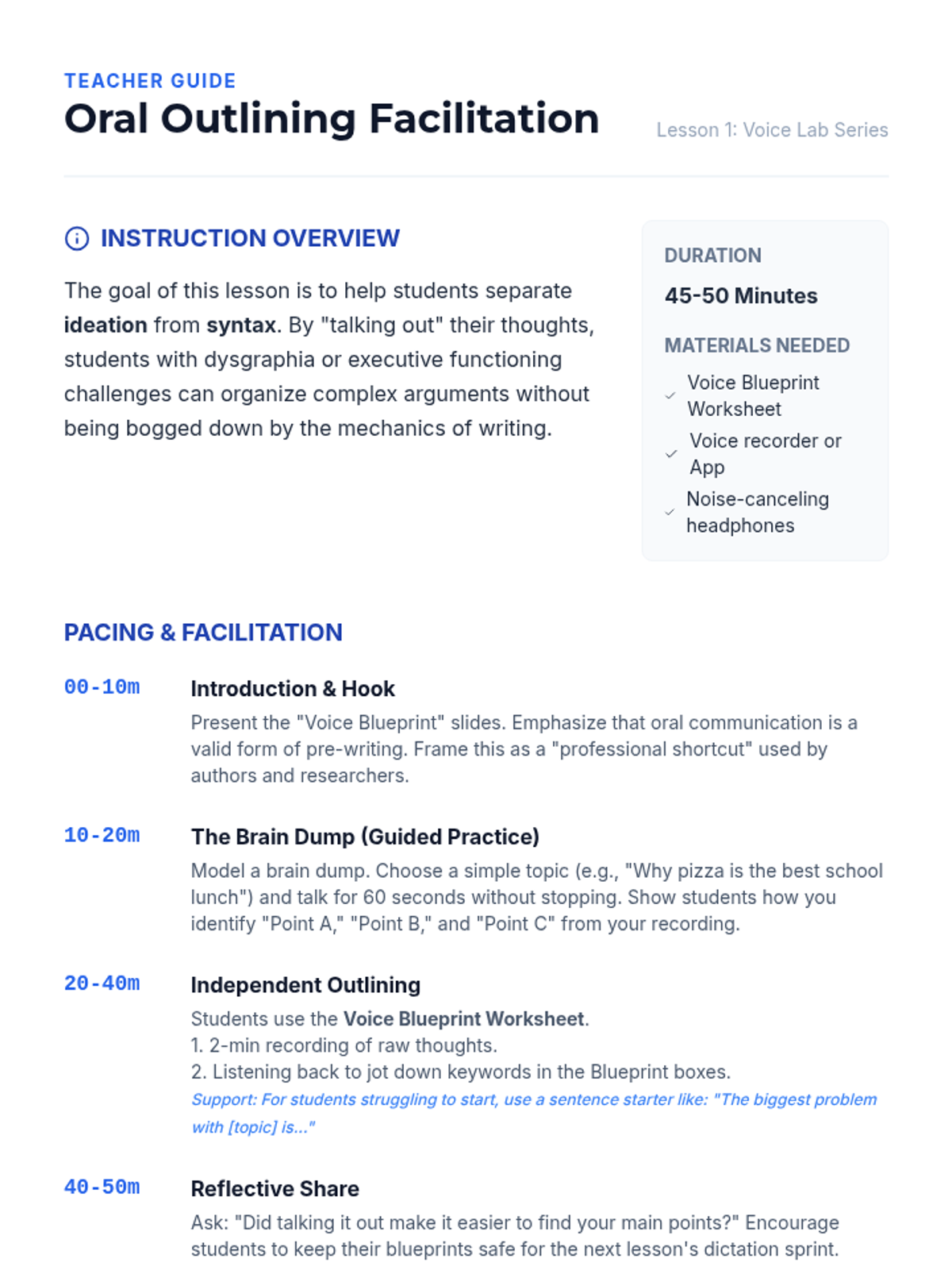 A sequence for 8th-grade students to master speech-to-text technology for academic writing, moving from oral planning to independent drafting and self-advocacy.