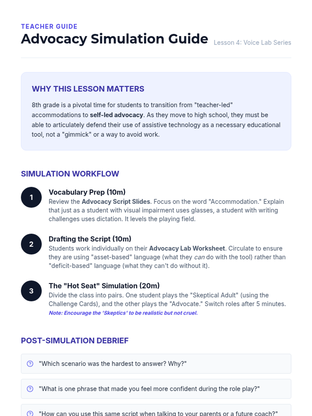 A series of lessons designed for middle school students with intellectual disabilities to develop social communication and self-advocacy skills. The unit focuses on the 'Social Filter' (knowing when to speak) and the 'Help Signal' (knowing when and how to ask for teacher assistance).