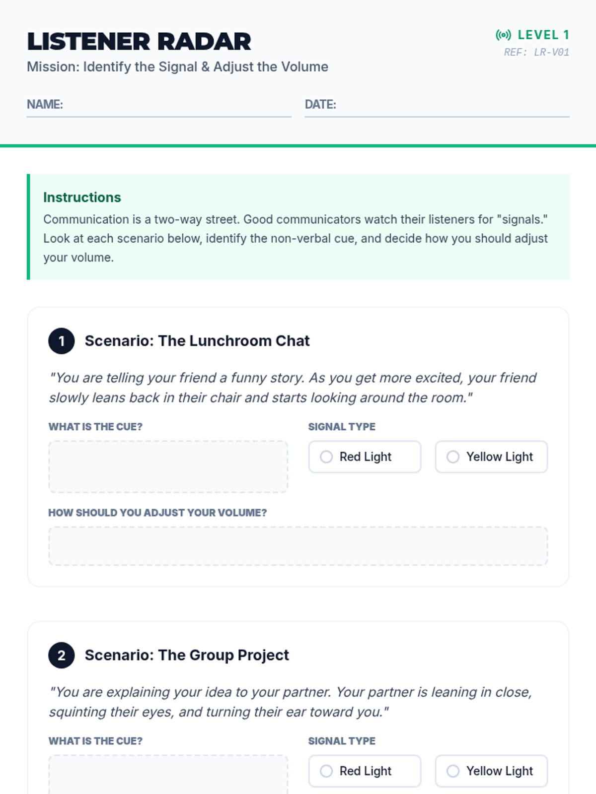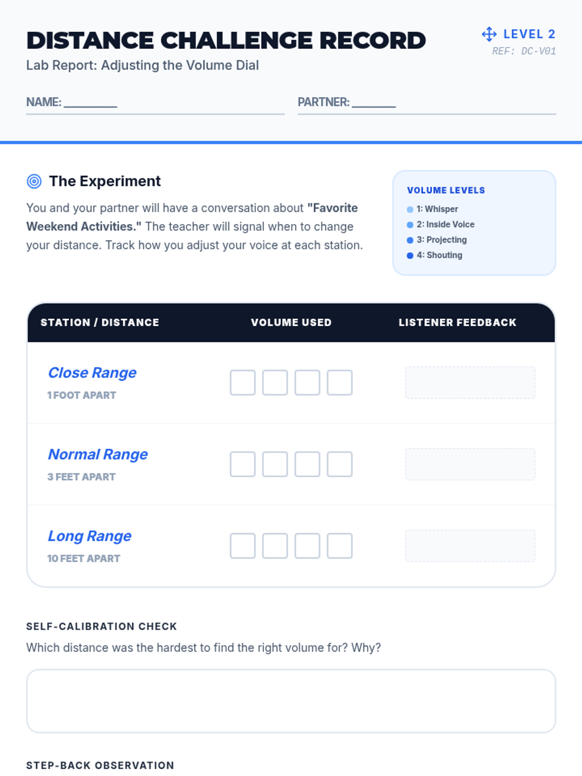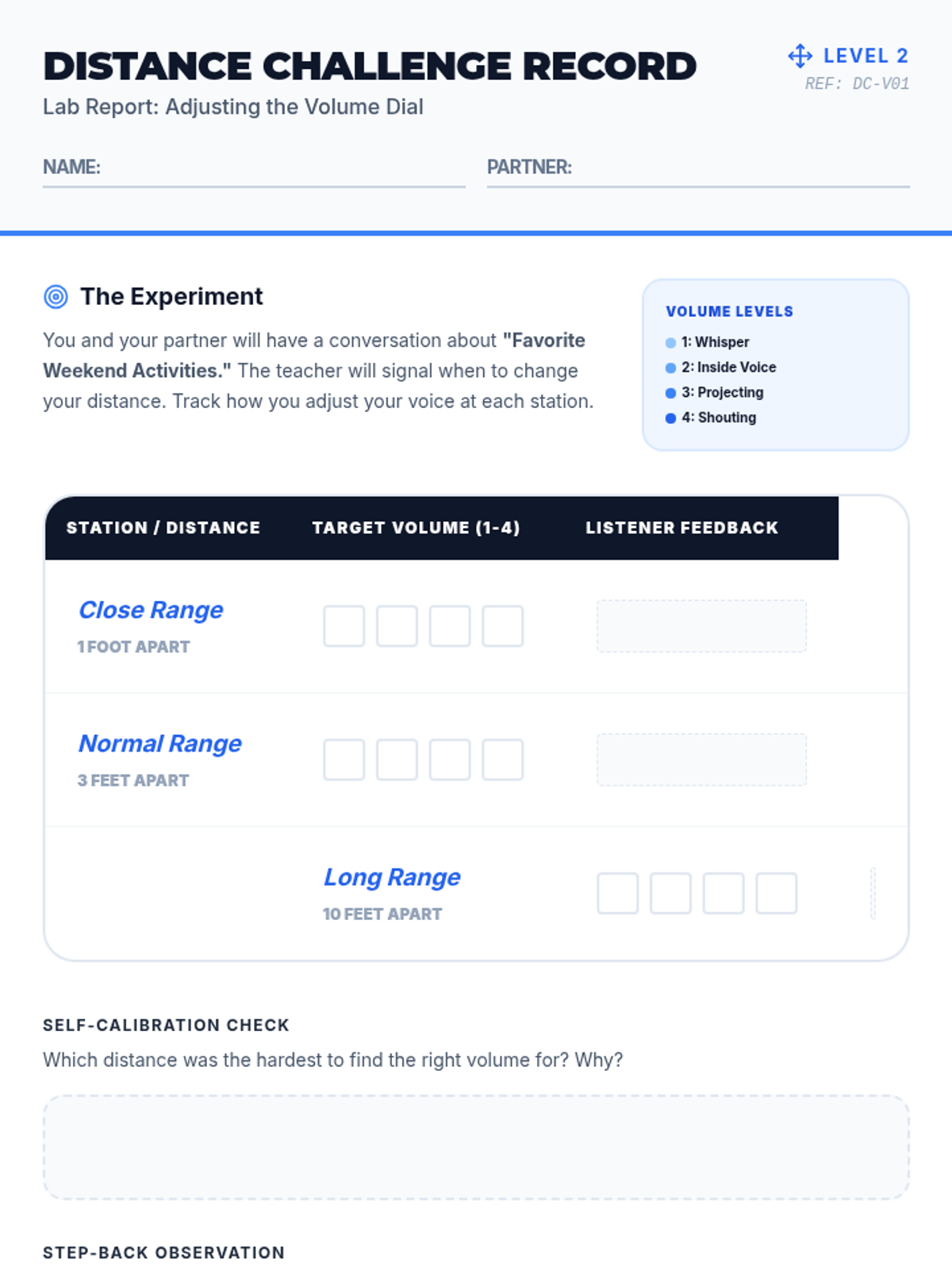 A social communication sequence for 8th-grade students focusing on the interactive adjustment of volume and tone. Students move from identifying listener cues to mastering rapid adaptation across various social contexts.