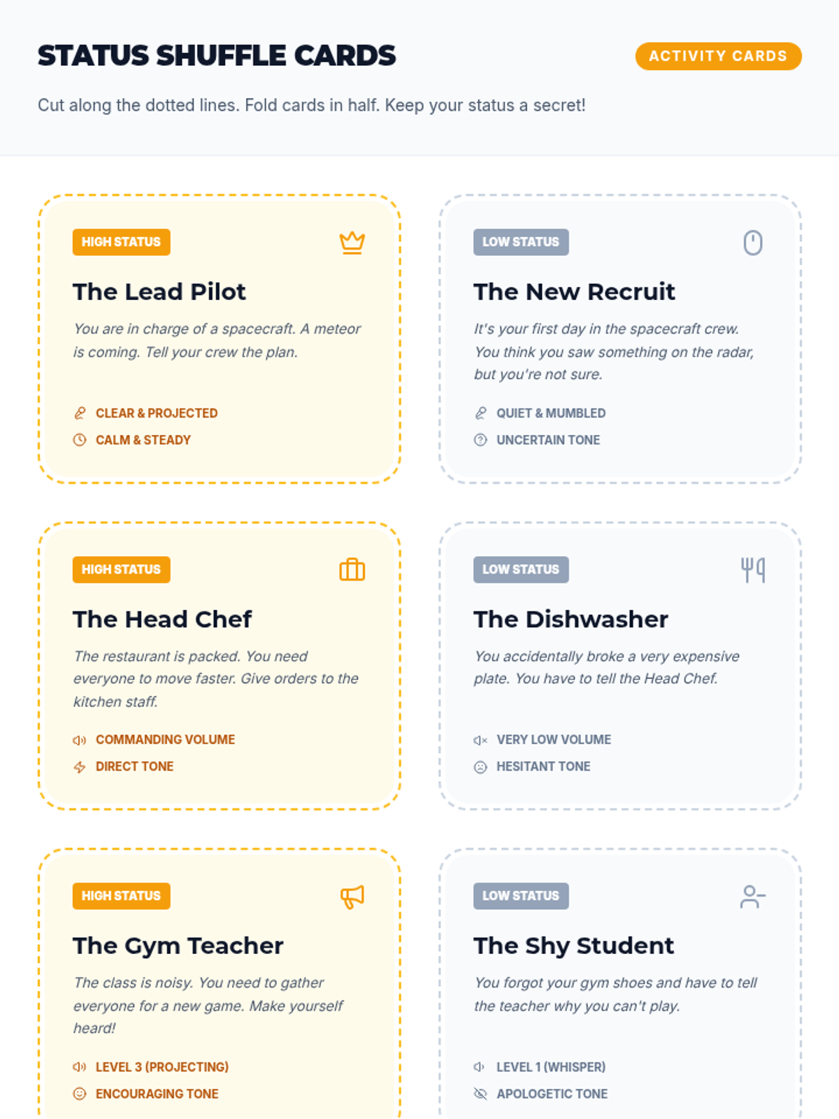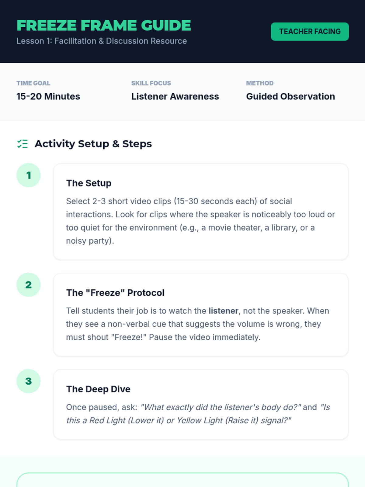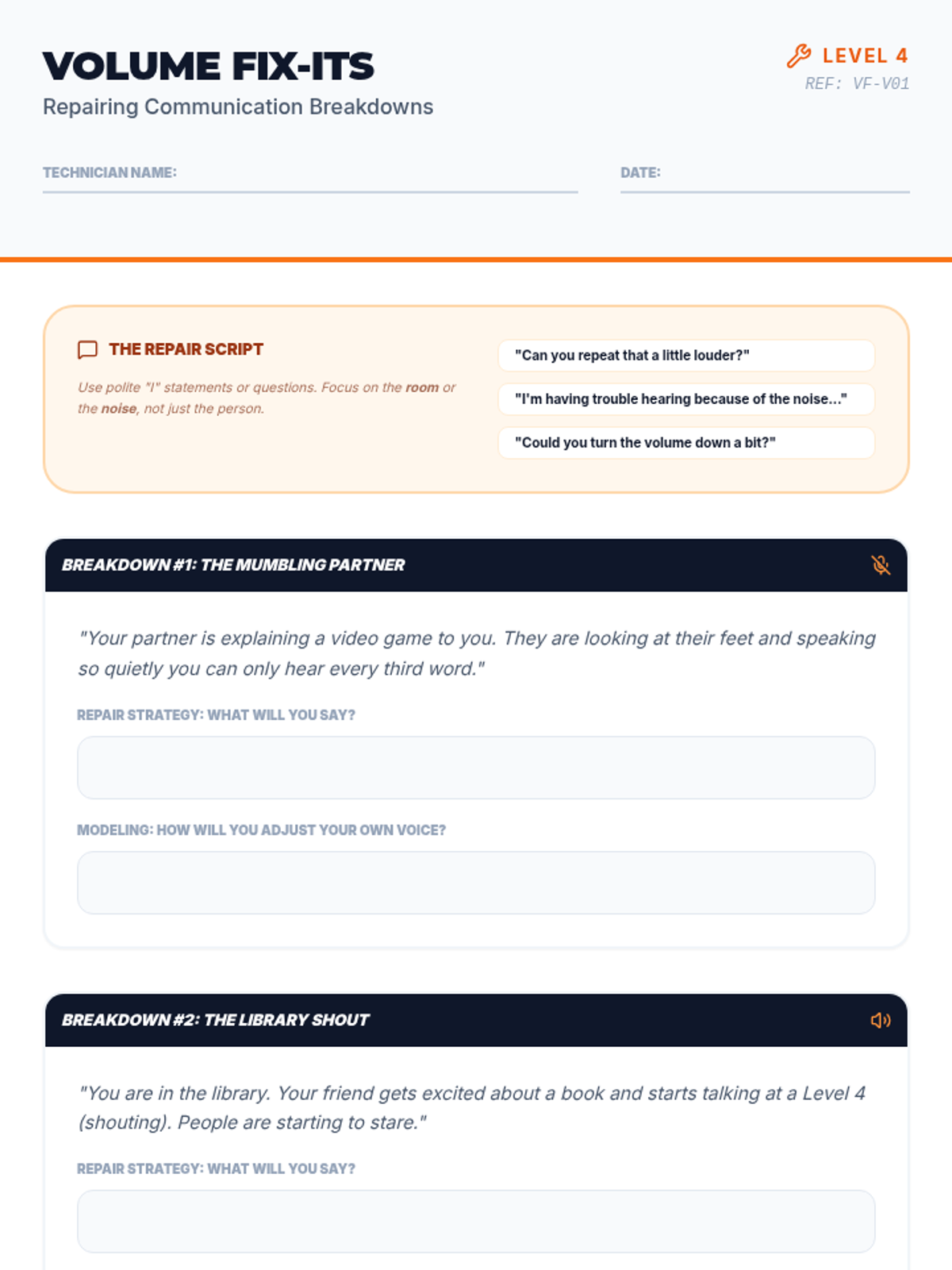A social communication sequence for 8th-grade students focusing on the interactive adjustment of volume and tone. Students move from identifying listener cues to mastering rapid adaptation across various social contexts.