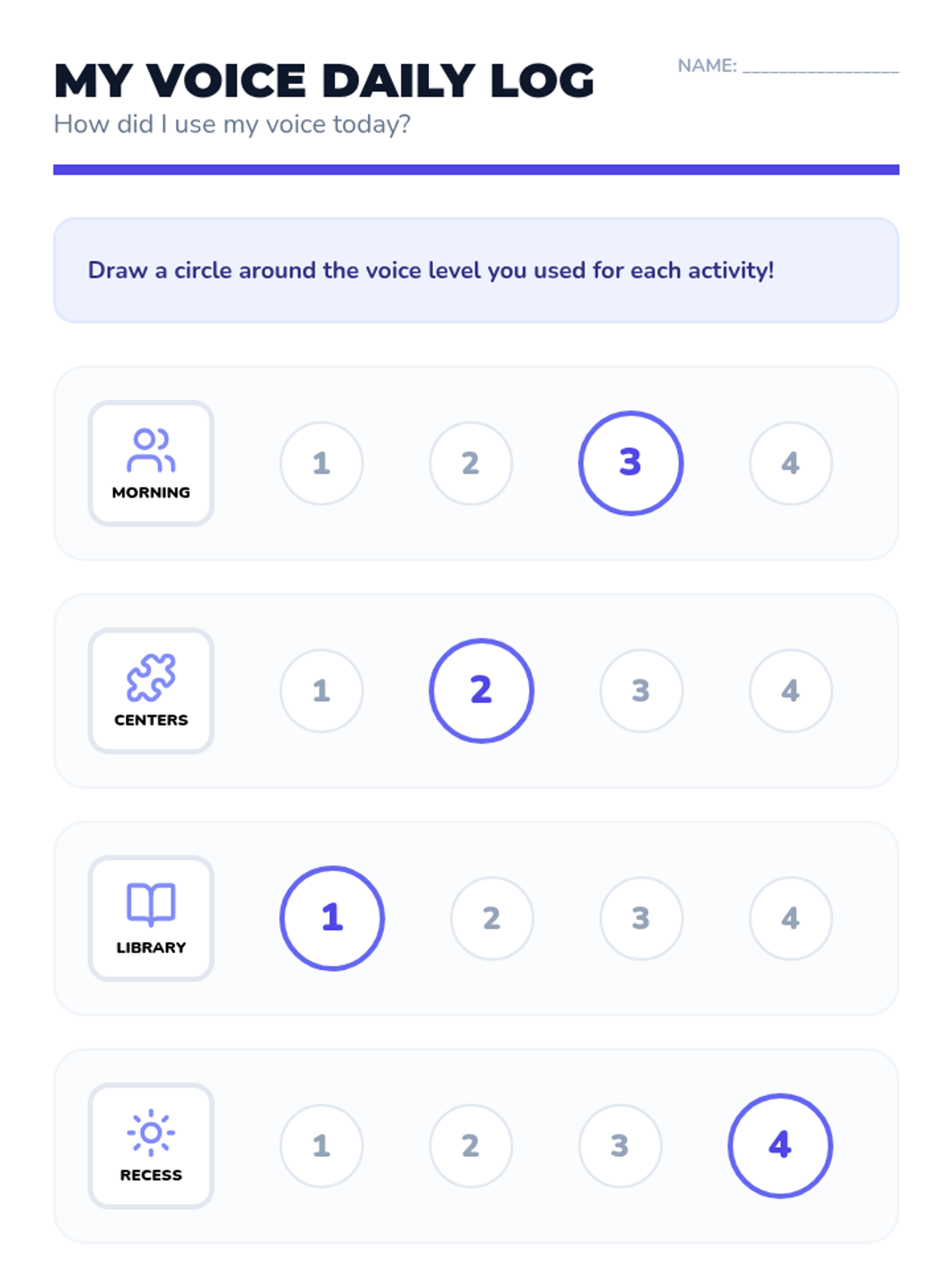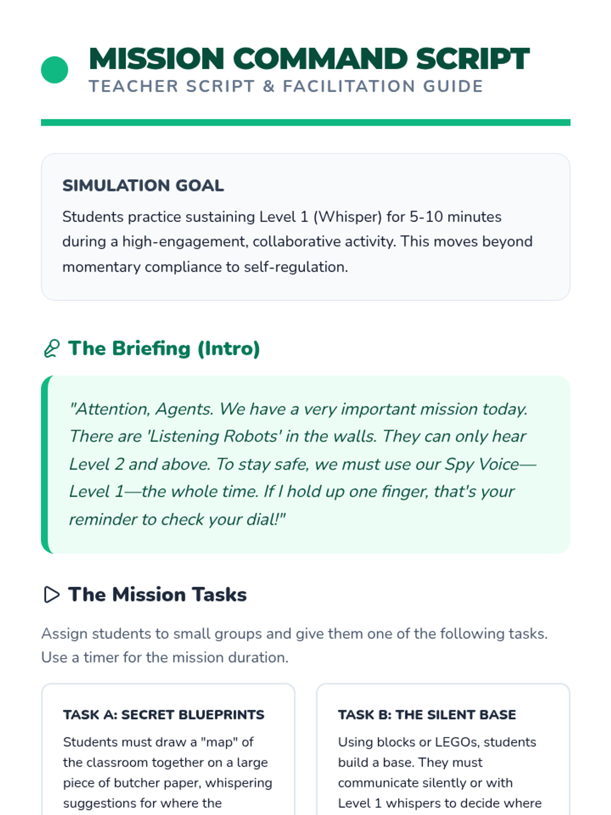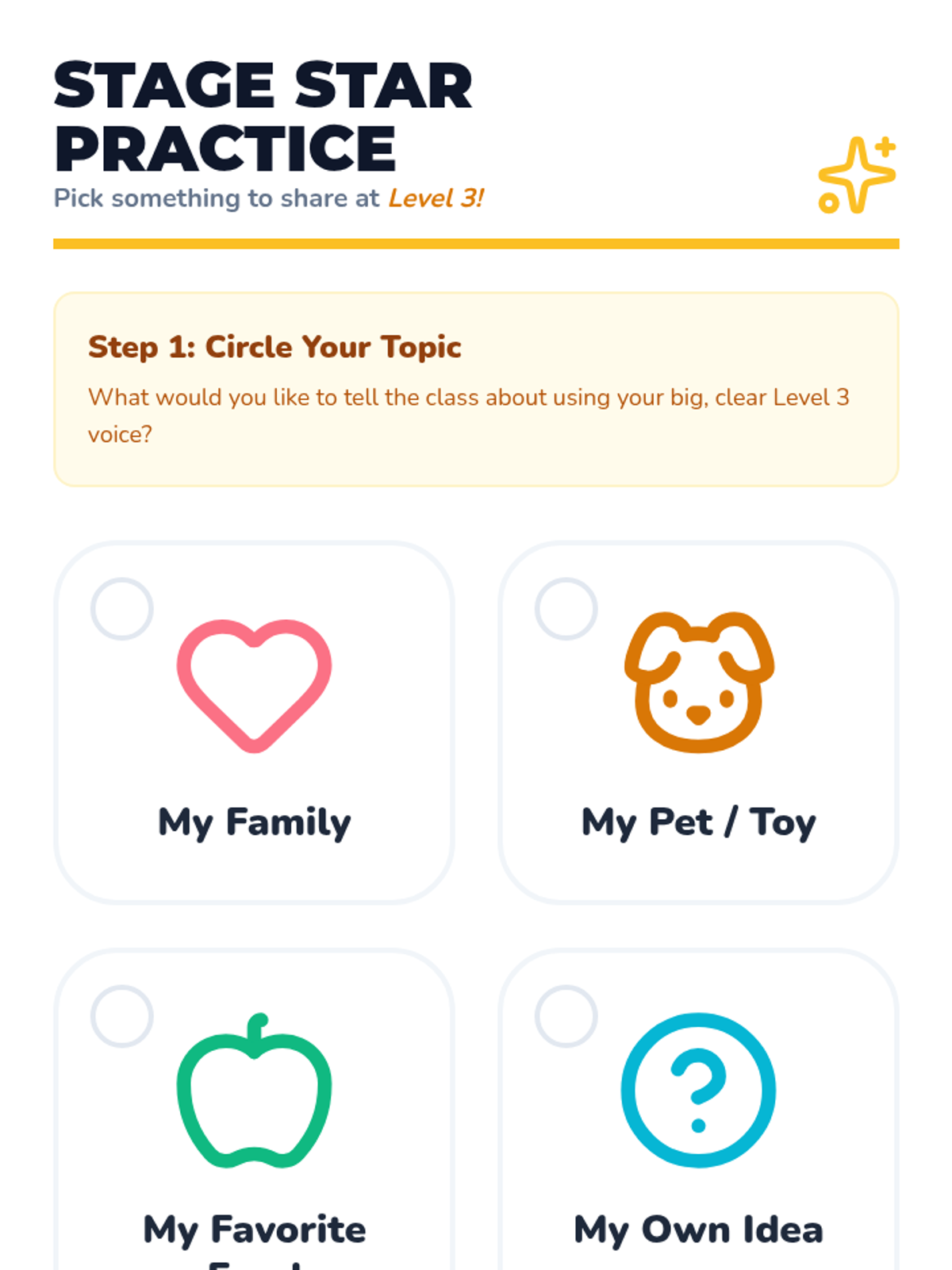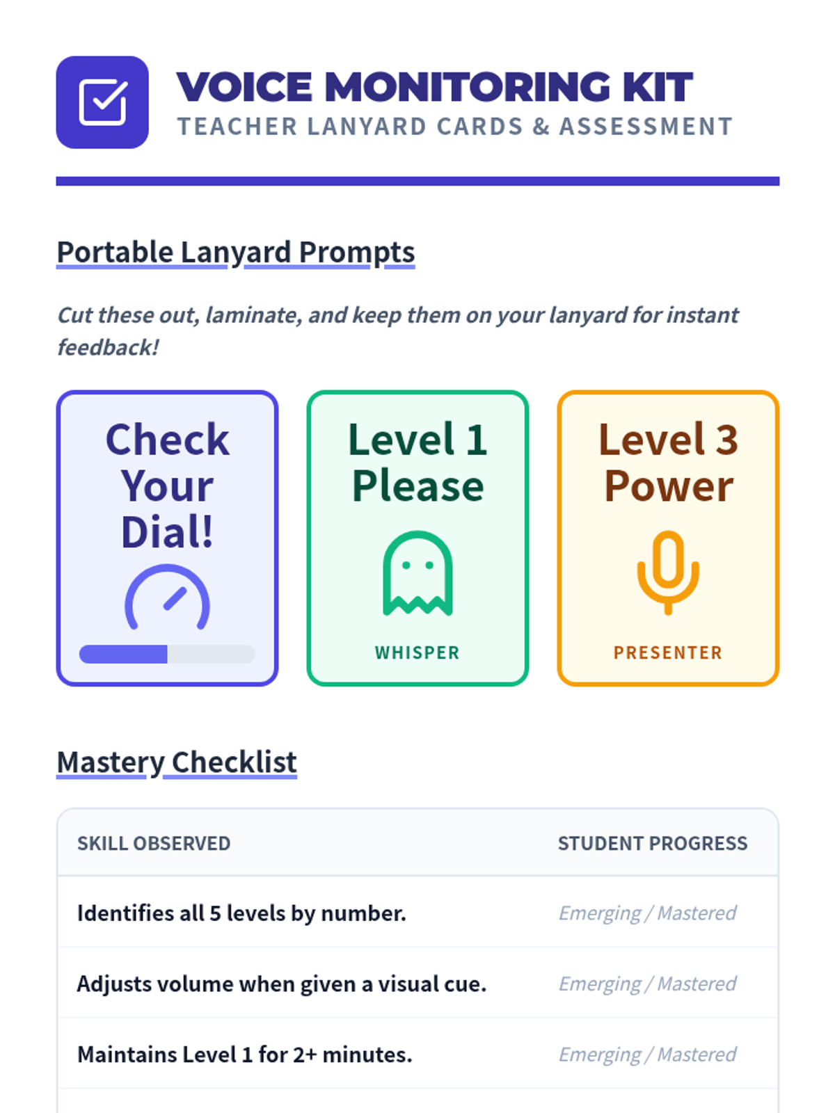 A comprehensive sequence for Pre-K students focusing on visual supports for voice modulation. Students learn to use a 5-level volume meter to match their voices to various classroom activities through play-based and mastery-focused workshops.