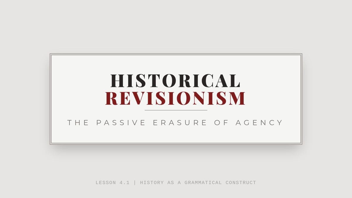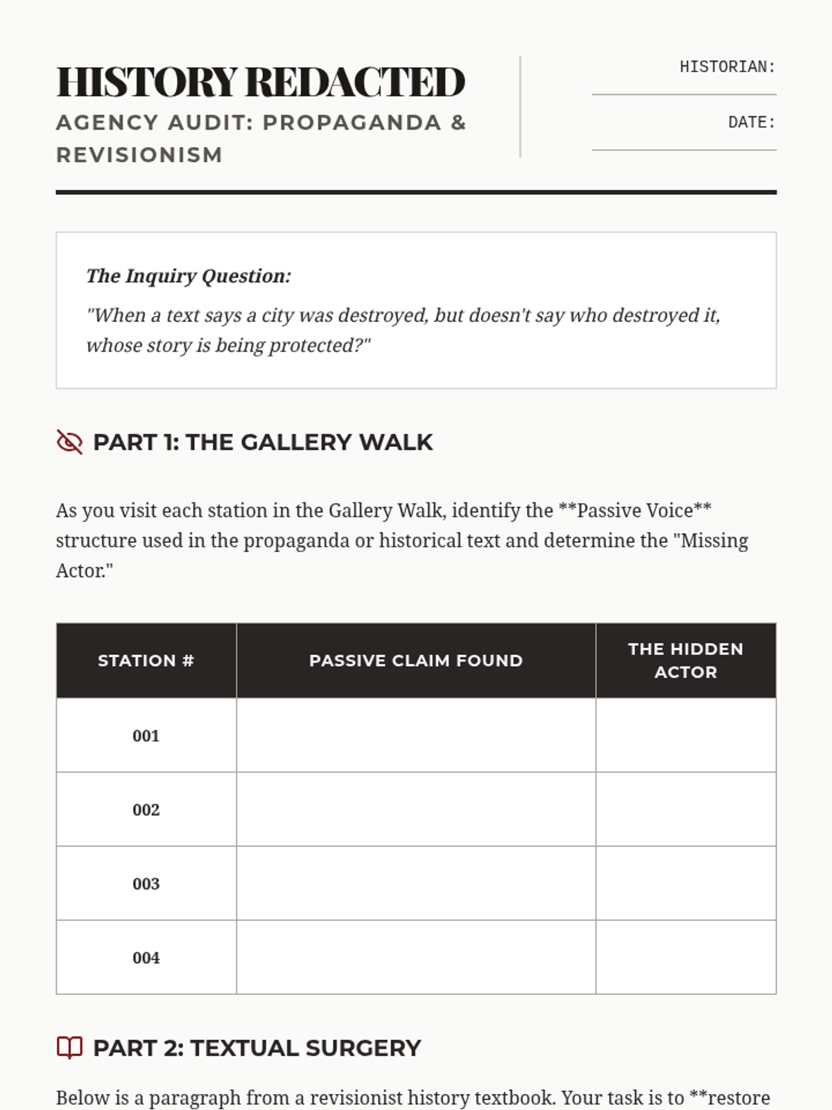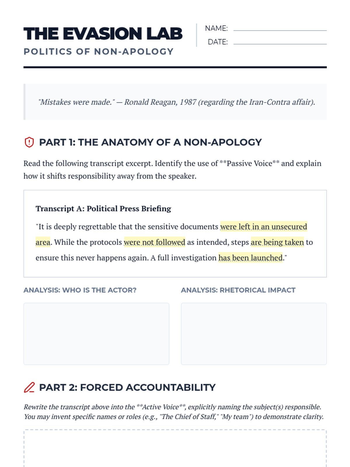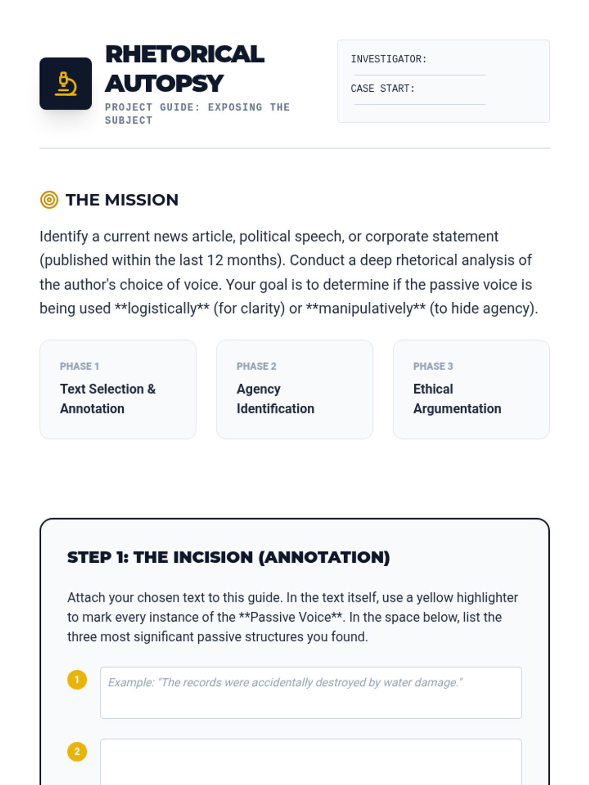 A 12th-grade ELA sequence exploring the rhetorical and ethical implications of active and passive voice in media, politics, law, and history. Students analyze how grammatical choices can obscure responsibility, shift bias, and influence public perception.